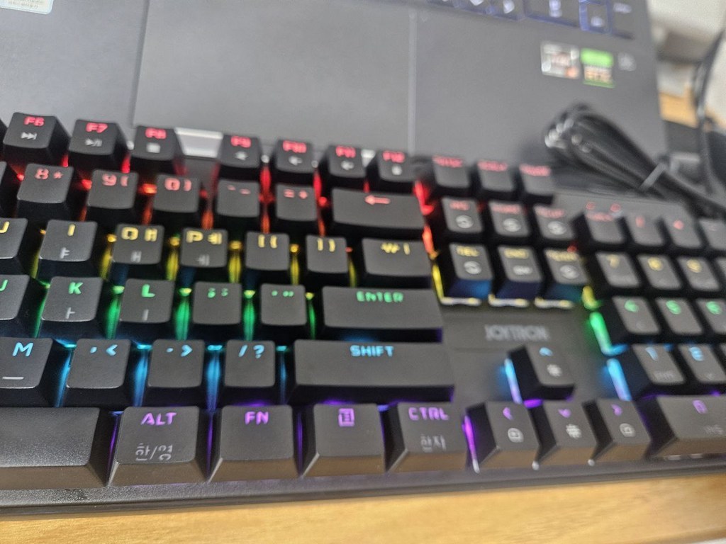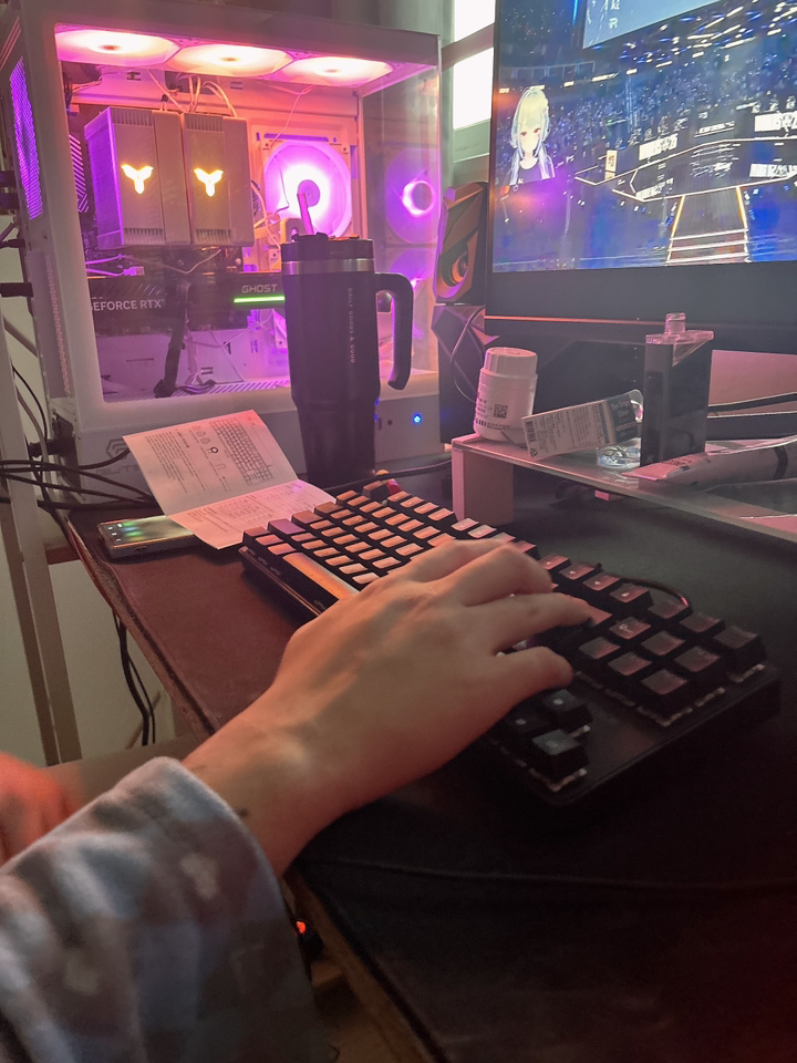 이 키보드의 가장 큰 특징은 역시 청축 스위치에서 나오는 경쾌한 타건음과 확실한 키감이었습니다. 키를 누를 때마다 또각또각 울리는 소리가 타이핑하는 재미를 확실히 살려줘서 문서 작업이나 채팅을 할 때도 손이 더 즐거워지는 느낌이었어요. 반발력도 적당해 빠른 입력이 가능했고 게임을 할 때도 키 입력이 정확하게 들어와 만족스러웠습니다. 장시간 타이핑을 해도 키가 너무 무겁지 않아 피로감이 과하지 않았던 점도 인상적이었어요.