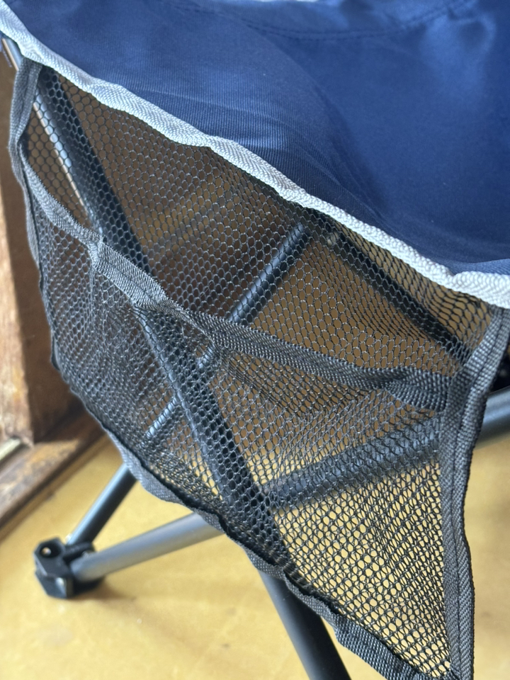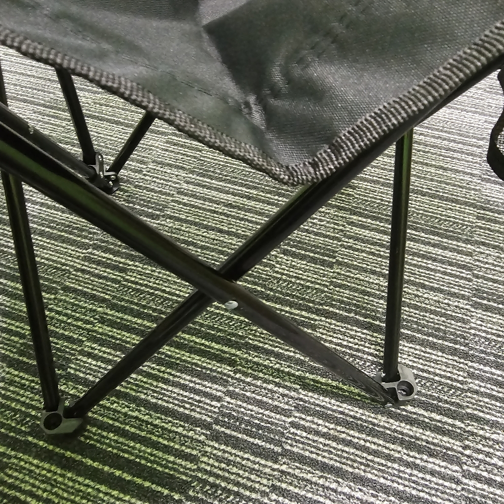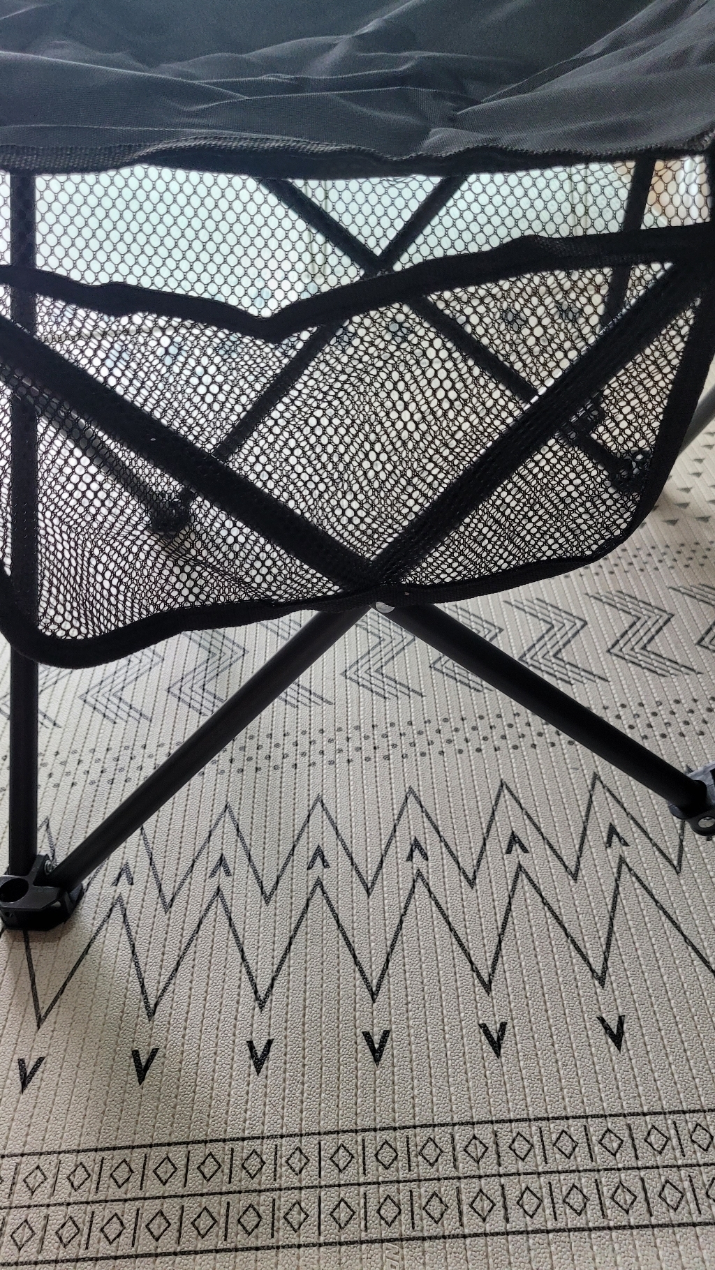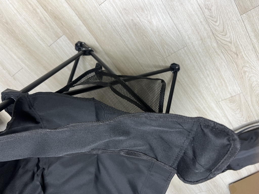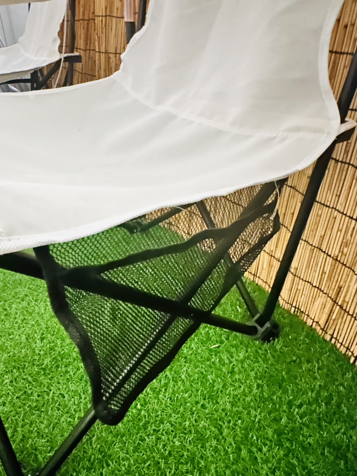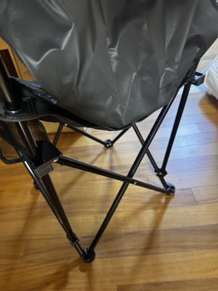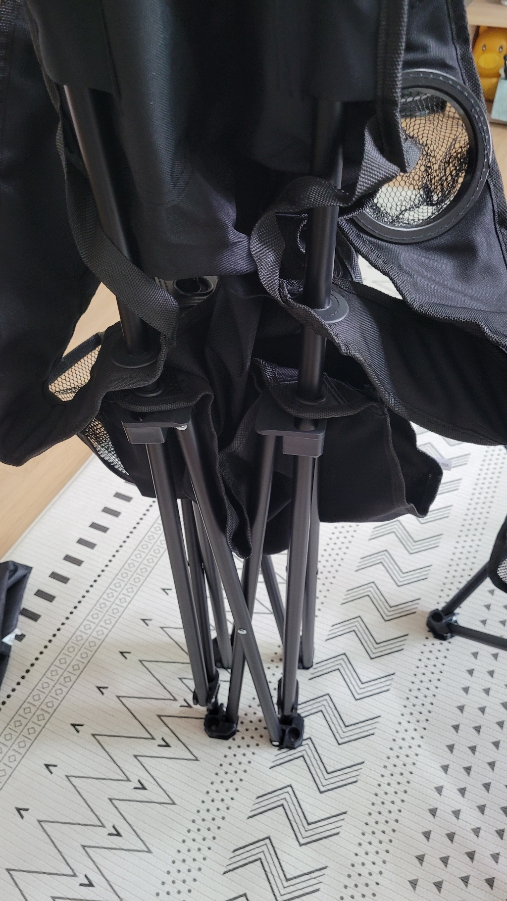 프레임은 철제 구조로 되어 있어 매우 견고했습니다. 앉았을 때 흔들림이 거의 없고, 체중이 분산되어 중심이 잘 잡히는 구조였습니다. 또한 다리 부분에는 미끄럼 방지 고무캡이 달려 있어, 잔디나 흙바닥 위에서도 안정적으로 놓을 수 있었습니다. 캠핑장에서 울퉁불퉁한 지면에서도 흔들림이 적어, 야외 사용에 적합하다는 느낌을 받았습니다.