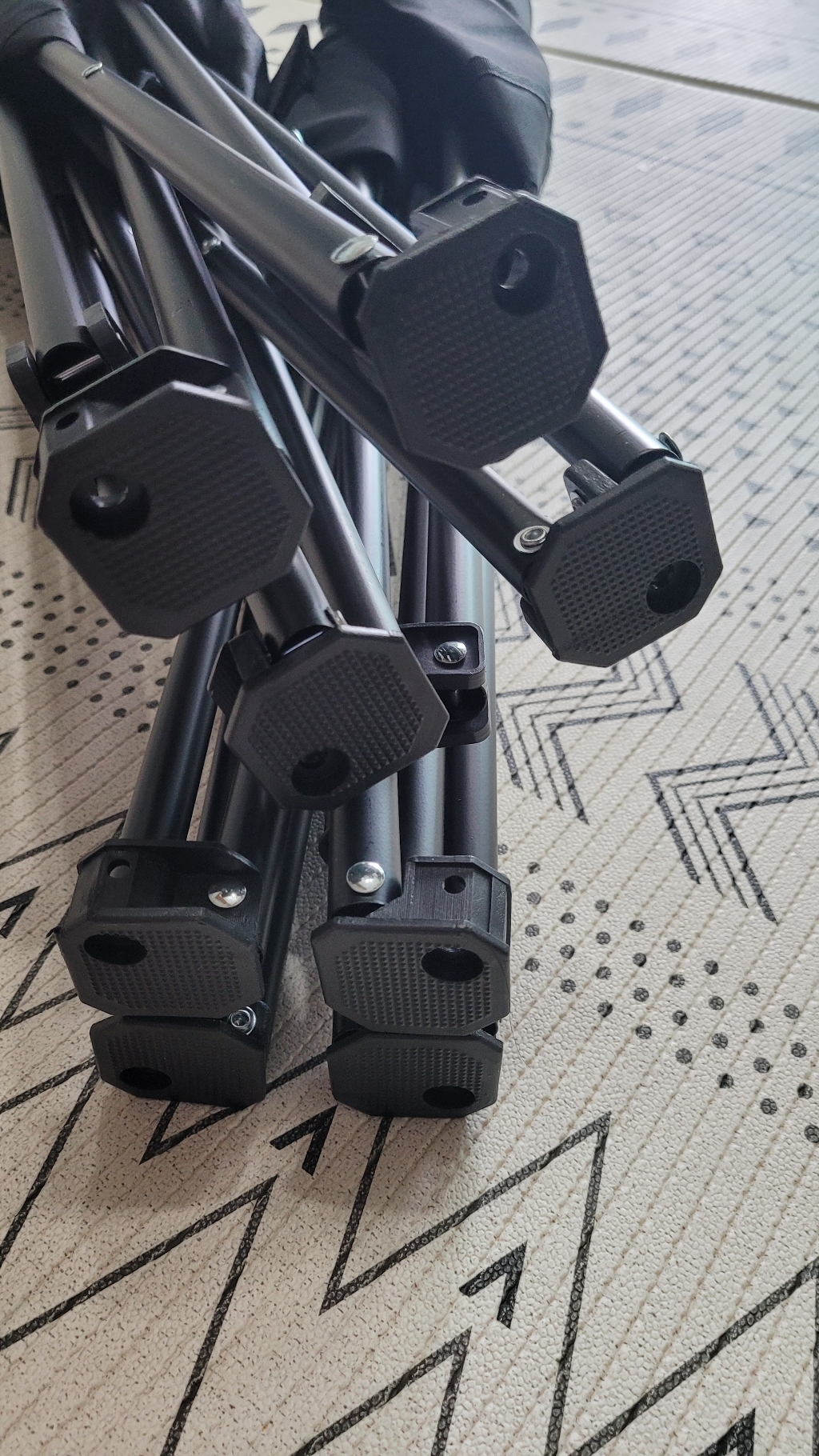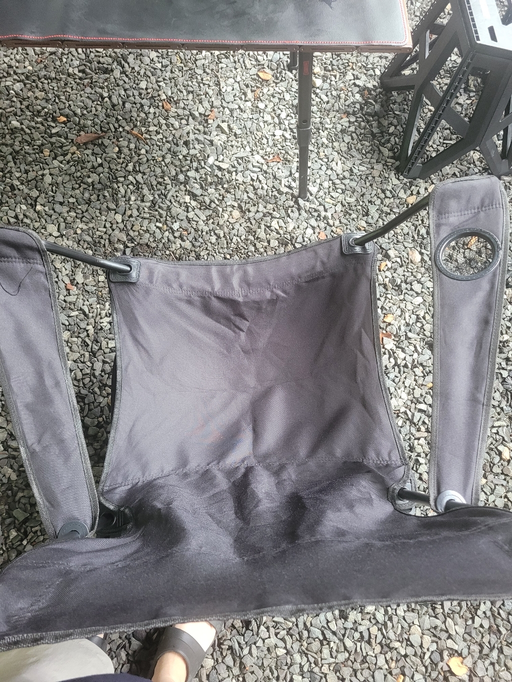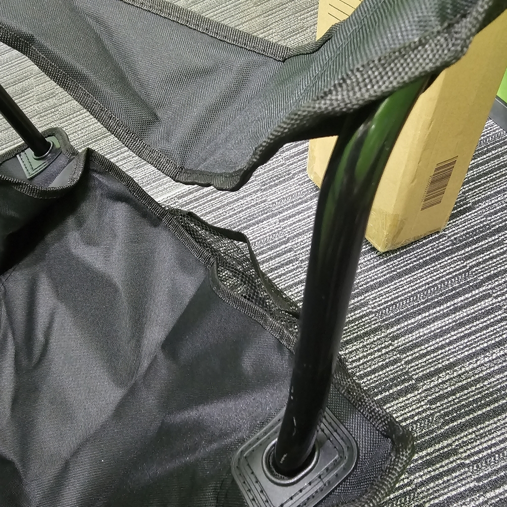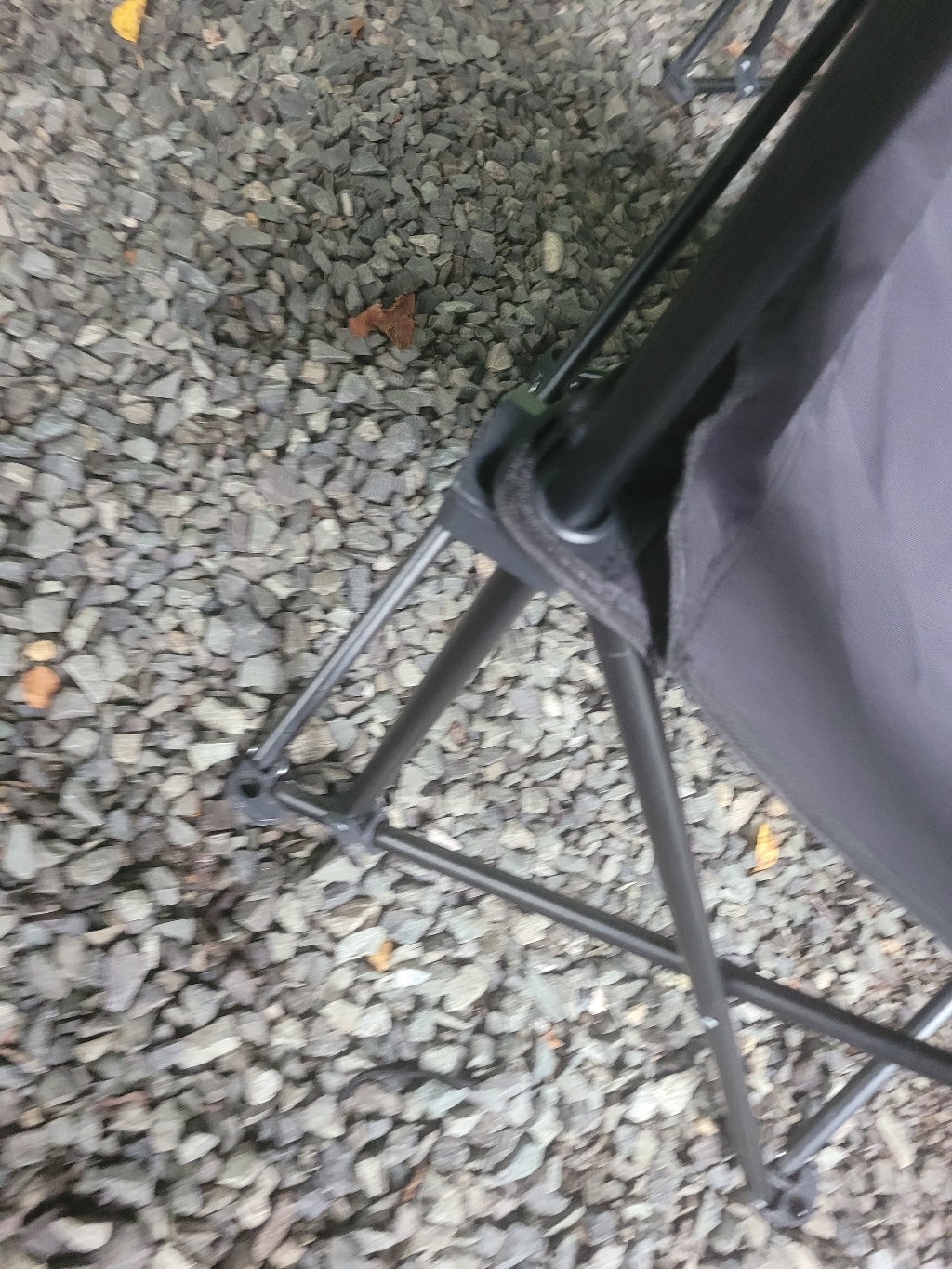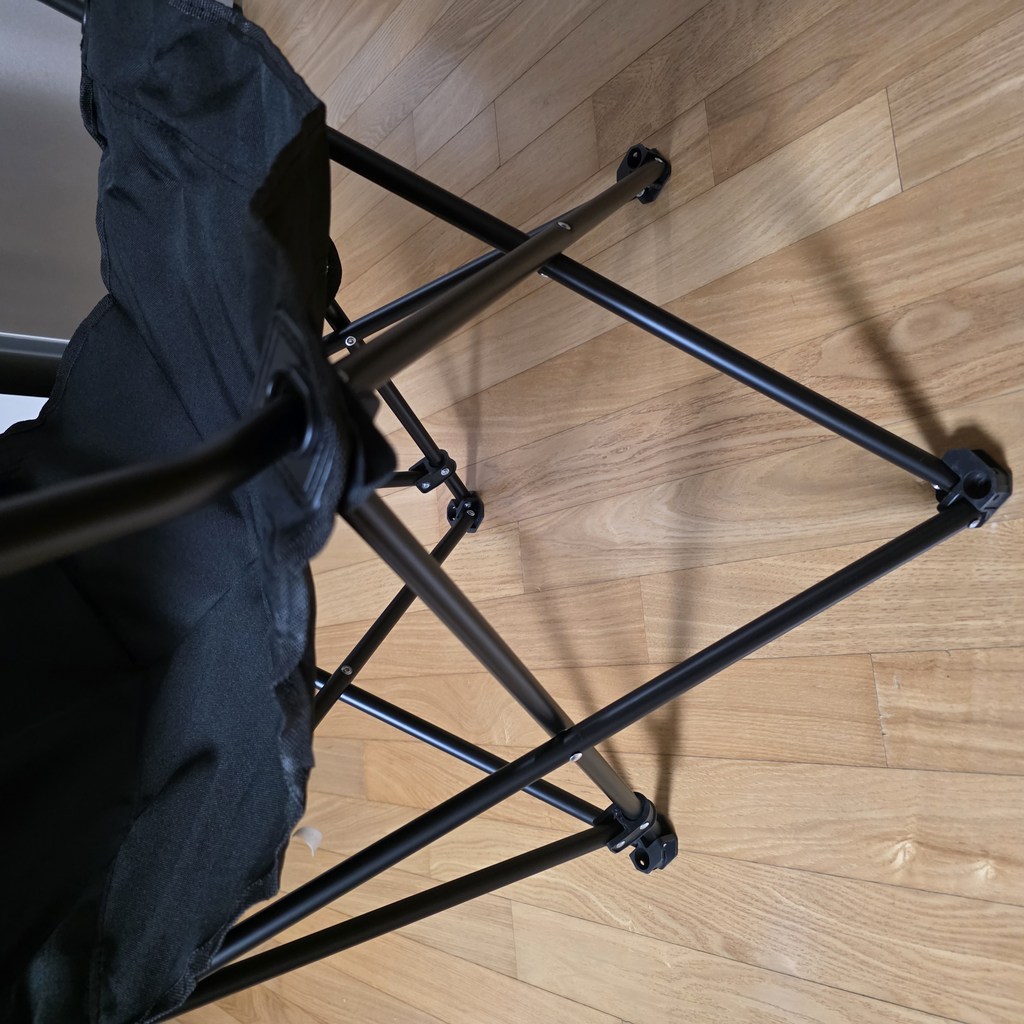 프레임은 철제 구조로 되어 있어 매우 견고했습니다. 앉았을 때 흔들림이 거의 없고, 체중이 분산되어 중심이 잘 잡히는 구조였습니다. 또한 다리 부분에는 미끄럼 방지 고무캡이 달려 있어, 잔디나 흙바닥 위에서도 안정적으로 놓을 수 있었습니다. 캠핑장에서 울퉁불퉁한 지면에서도 흔들림이 적어, 야외 사용에 적합하다는 느낌을 받았습니다.