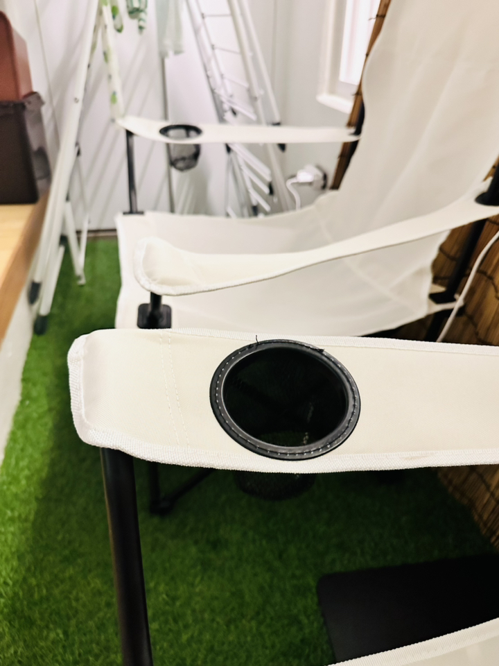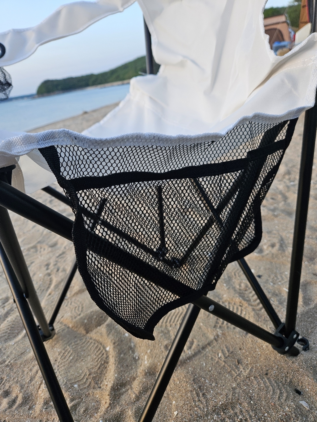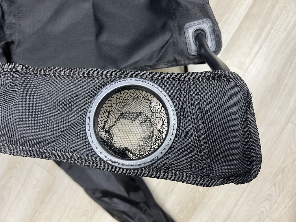 팔걸이 옆에는 컵홀더가 있어서 음료를 놓을 수 있고, 캠핑 중 간단한 간식을 두기에도 유용했습니다.