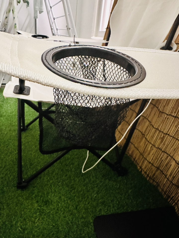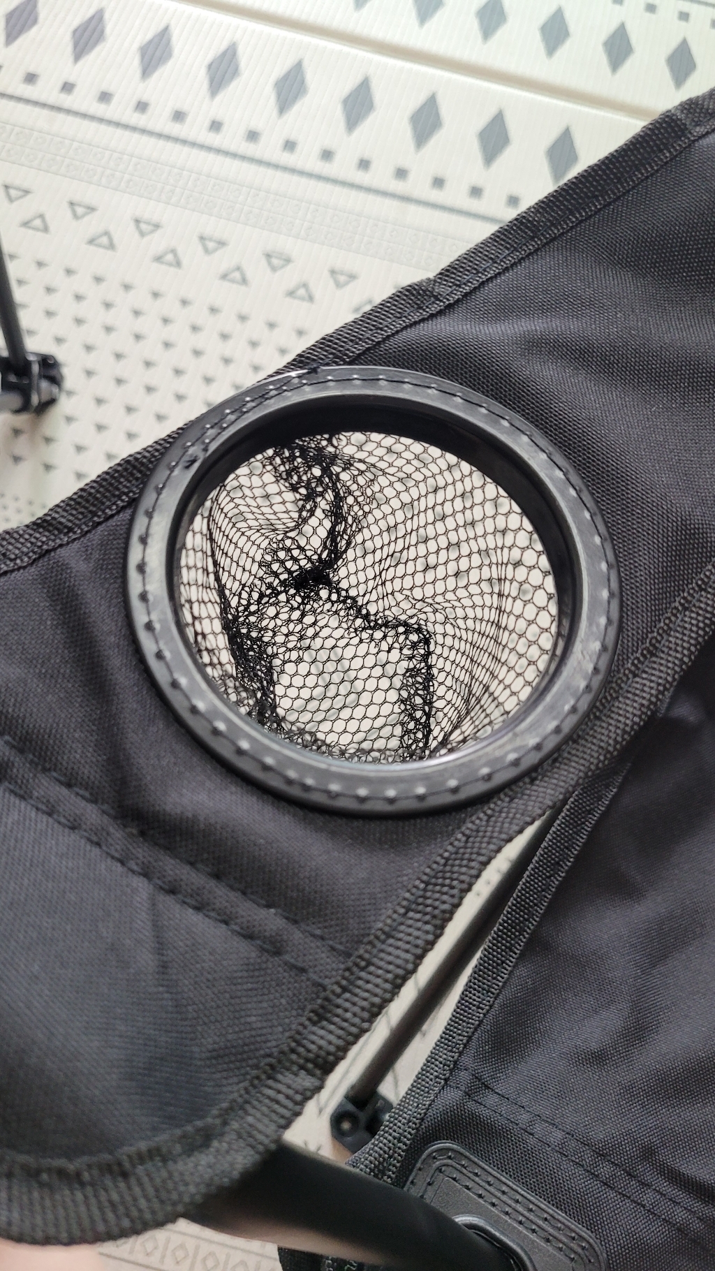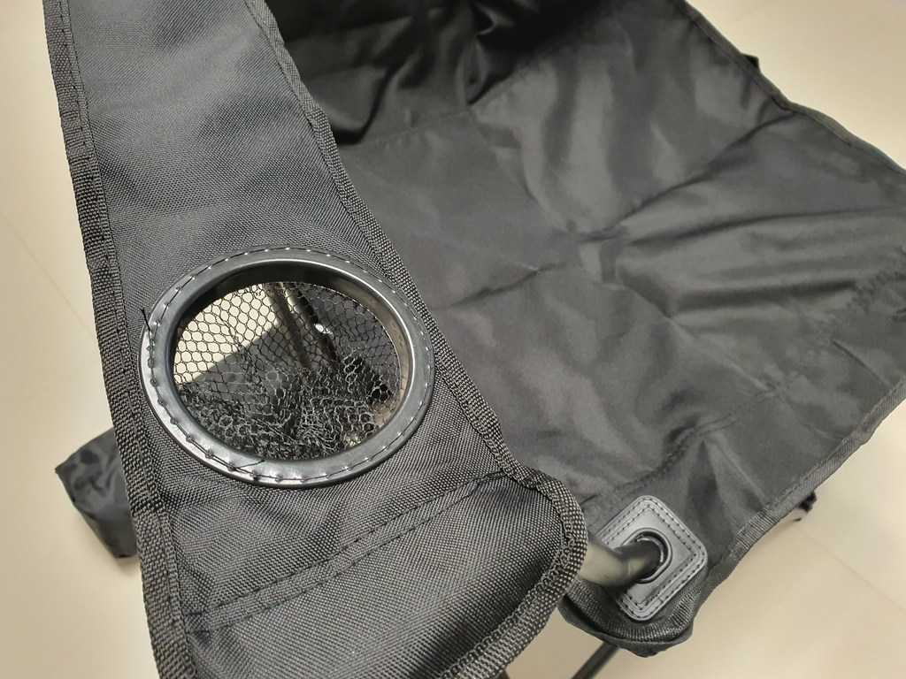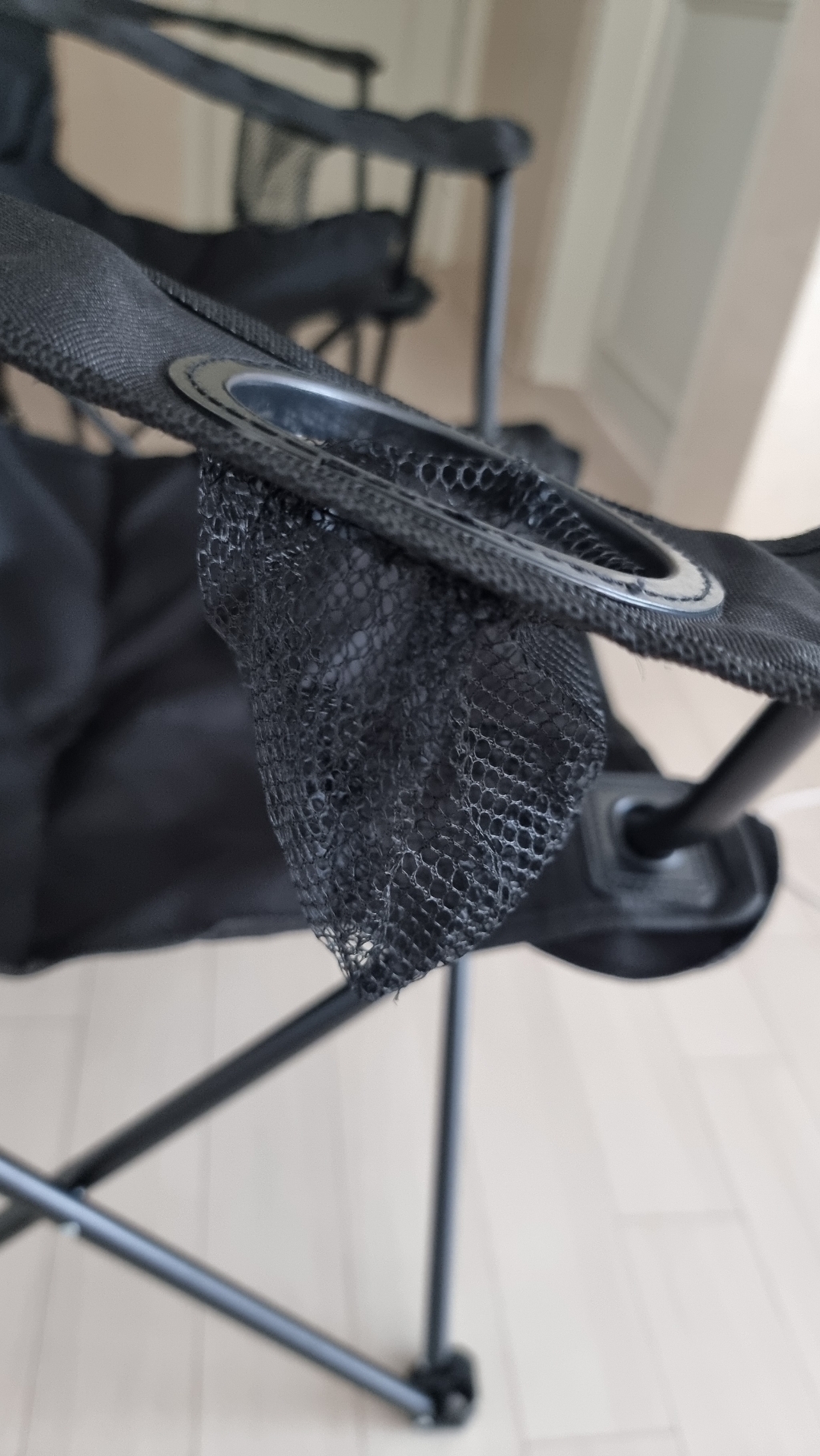 팔걸이 옆에는 컵홀더가 있어서 음료를 놓을 수 있고, 캠핑 중 간단한 간식을 두기에도 유용했습니다.