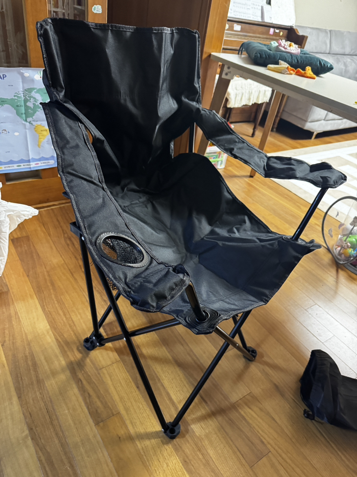 펼치고 접는 것도 생각보다 훨씬 간편했어요. 그냥 한 번 쫙 펼치면 바로 세팅되고, 접을 때도 힘 안 들이고 쉽게 접히더라고요. 가방에 쏙 들어가서 차 트렁크에도 부담 없이 실을 수 있었고요. 무게도 그렇게 무겁지 않아서 캠핑장이나 피크닉 갈 때 들고 다니기 편했어요. 팔걸이 부분에 컵홀더가 있어서 음료 올려놓기도 좋았고, 수납 포켓이 있어서 핸드폰이나 간단한 소지품 넣기에도 유용했어요.