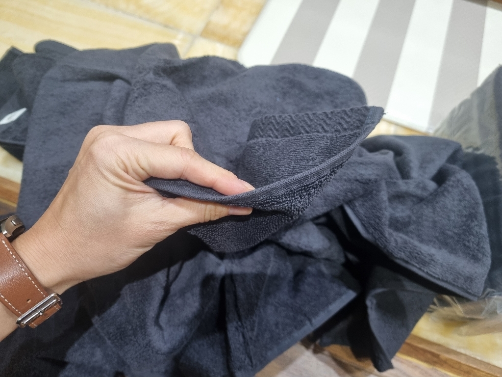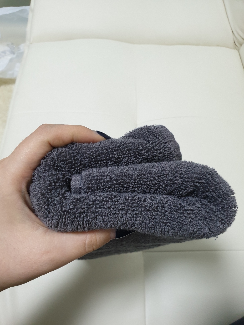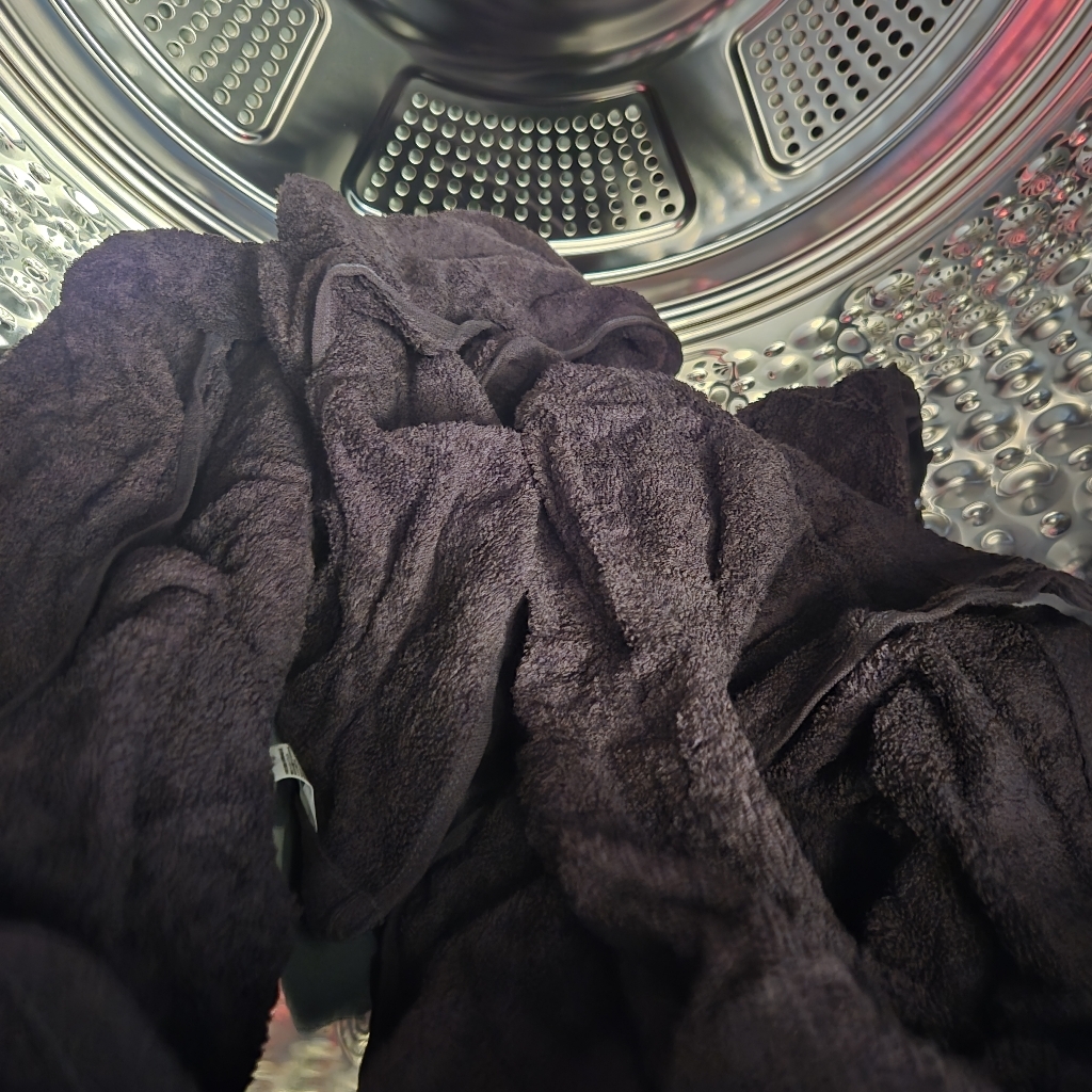 건조기 오기 전이라 세탁기로만 2번 돌리고 자연건조 해서 쓰는데 몸 닦고 나서 로션을 바르는데 손에 까만 먼지가 땟국수 처럼 나와서 바로 다시 세탁 했습니다.