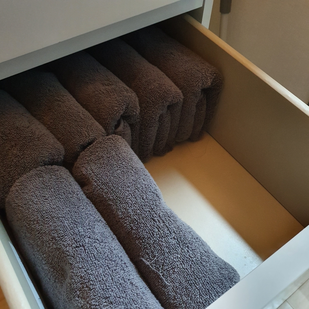 저는 수건 개는게 귀찮아서 대충 2번만 접어서