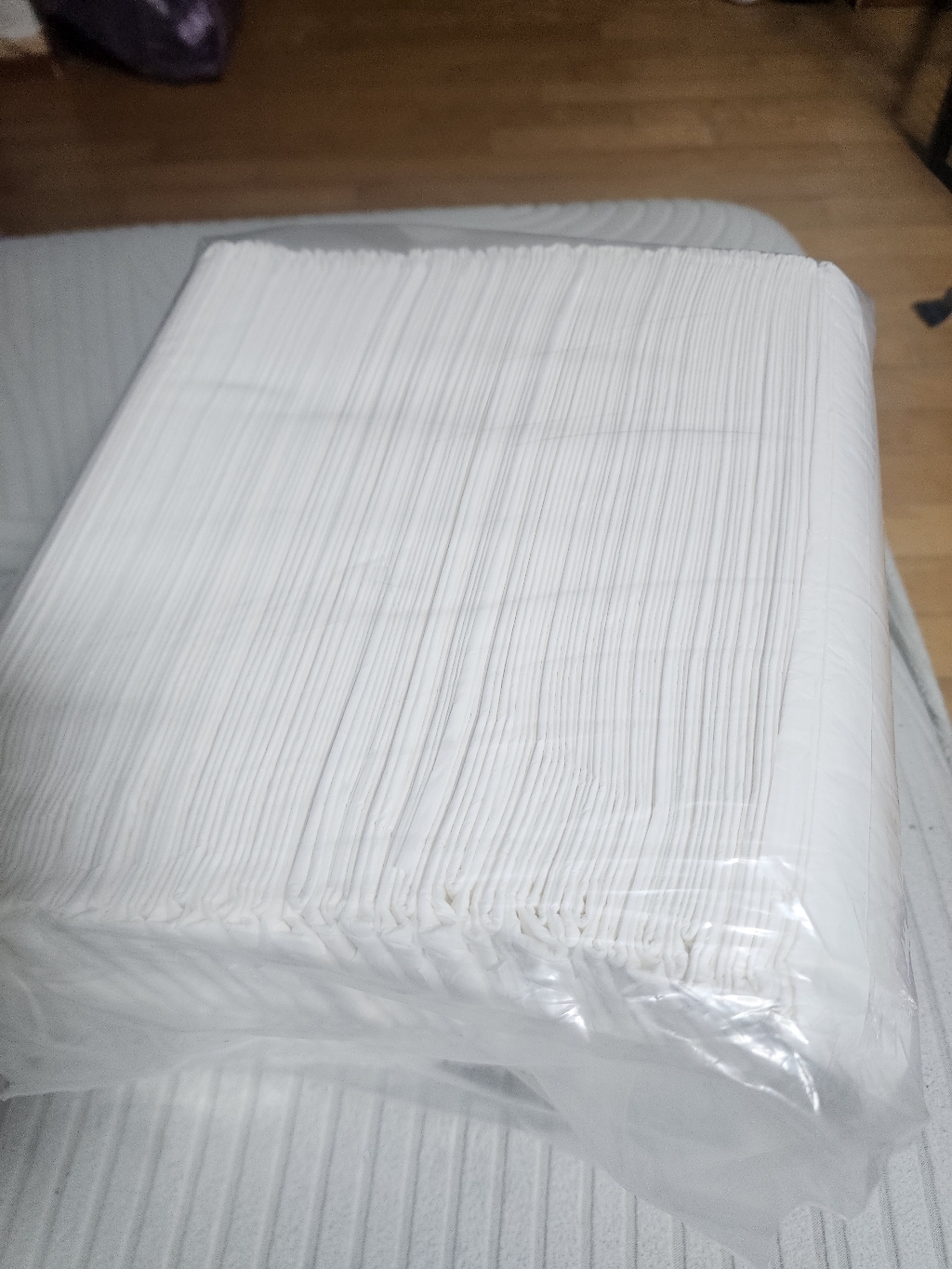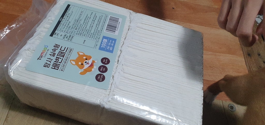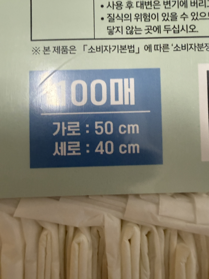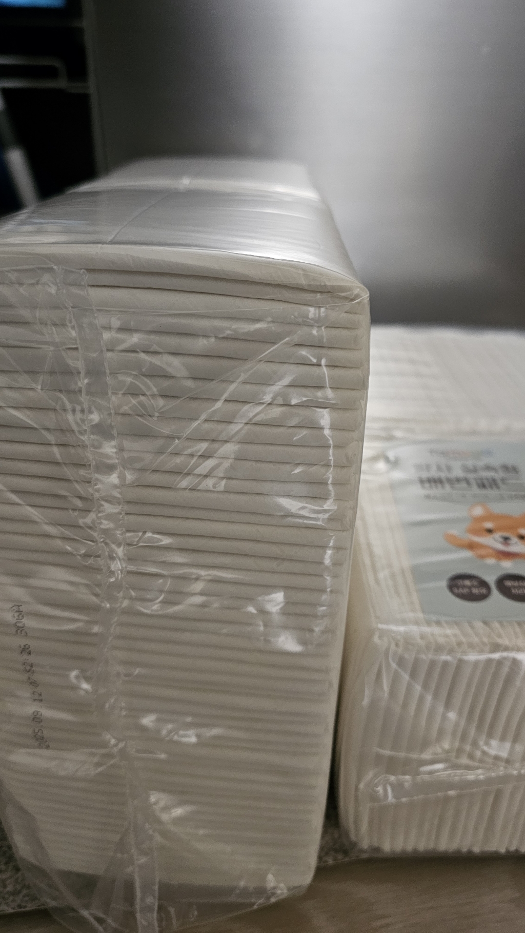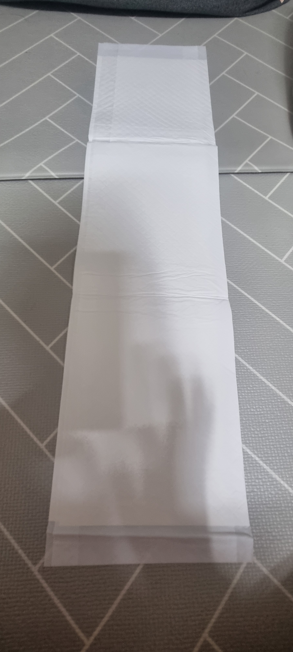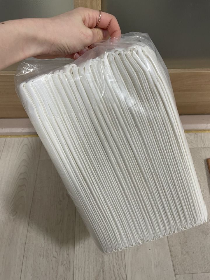 사이즈는 50×40cm라서 배변판에 딱 알맞은 크기예요. 저는 배변판에 여러겹 깔아서 사용중이에요. 소변도 많이 보는 편이고 갈아주기도 쉽고 휴지통에 버릴 때 부피도 크지 않아서 좋아요.