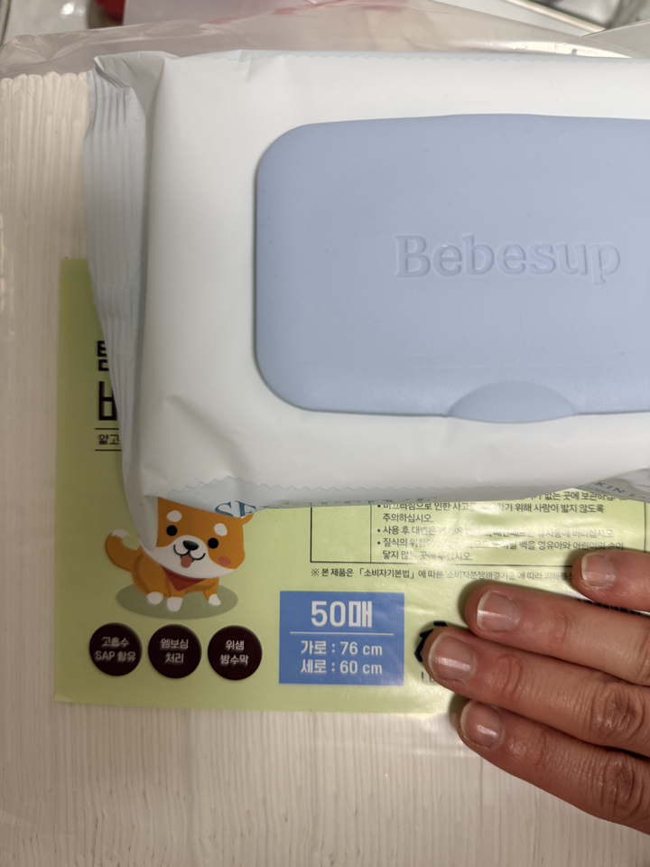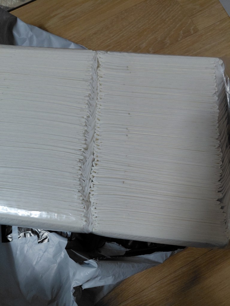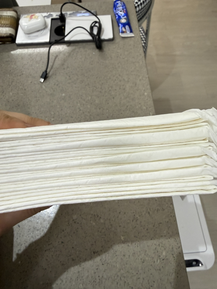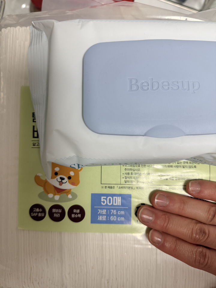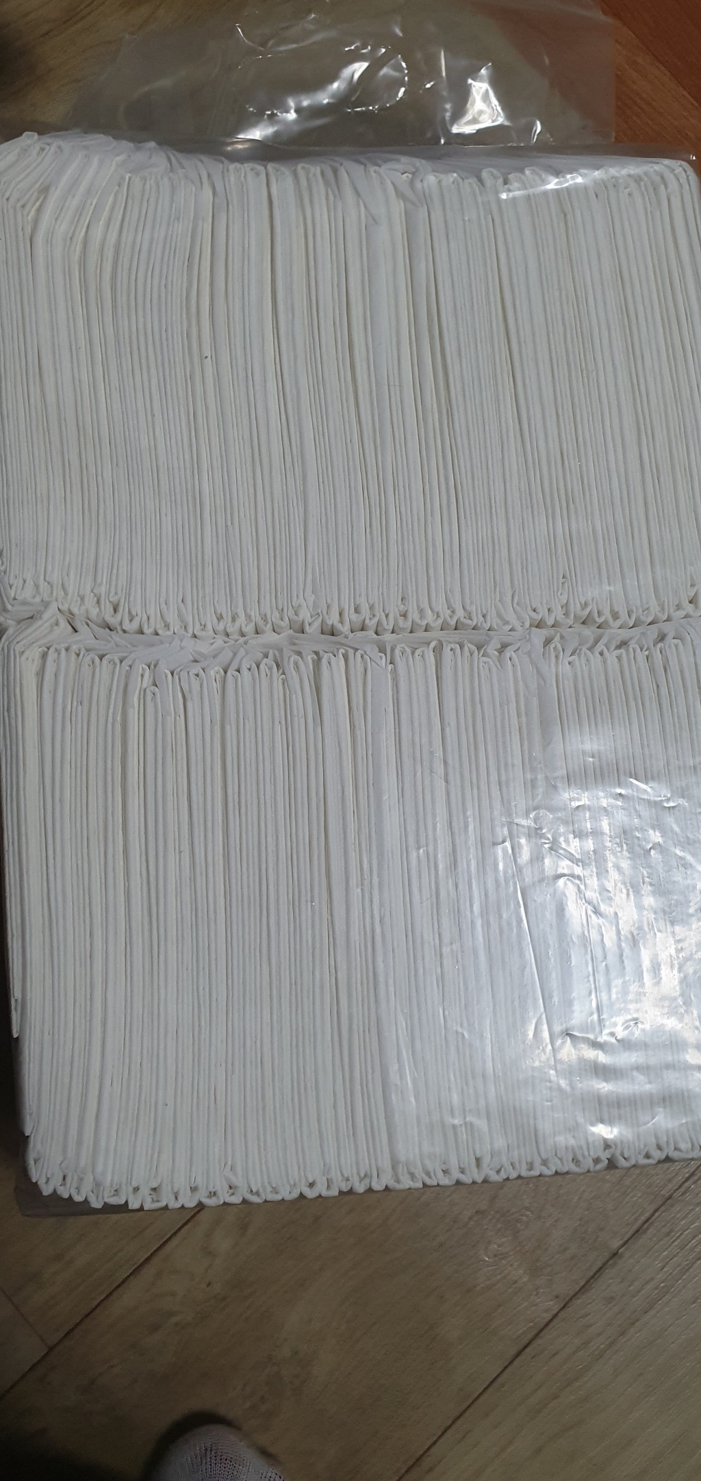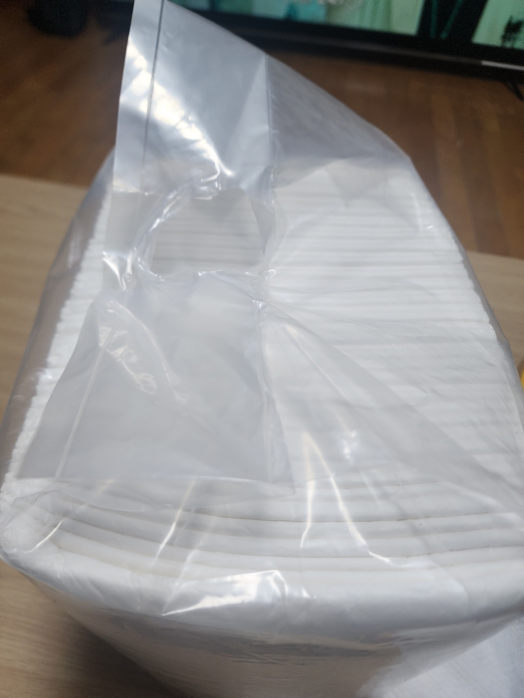 사이즈는 50×40cm라서 배변판에 딱 알맞은 크기예요. 저는 배변판에 여러겹 깔아서 사용중이에요. 소변도 많이 보는 편이고 갈아주기도 쉽고 휴지통에 버릴 때 부피도 크지 않아서 좋아요.