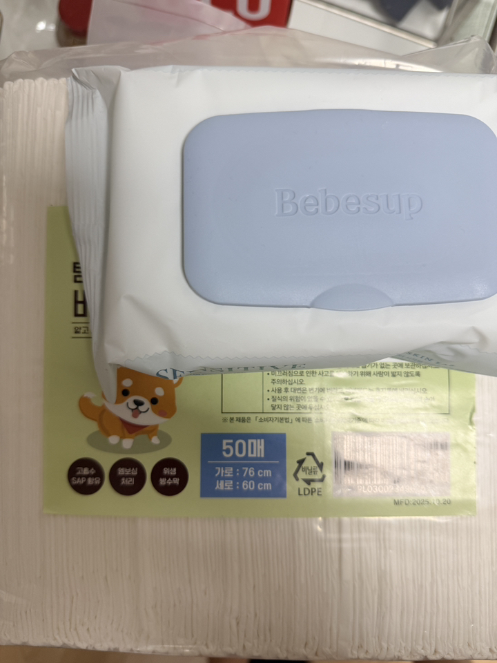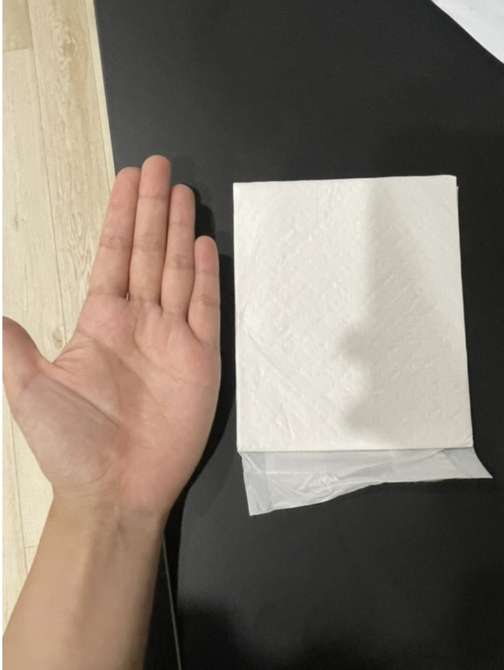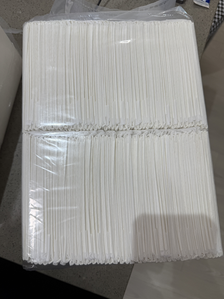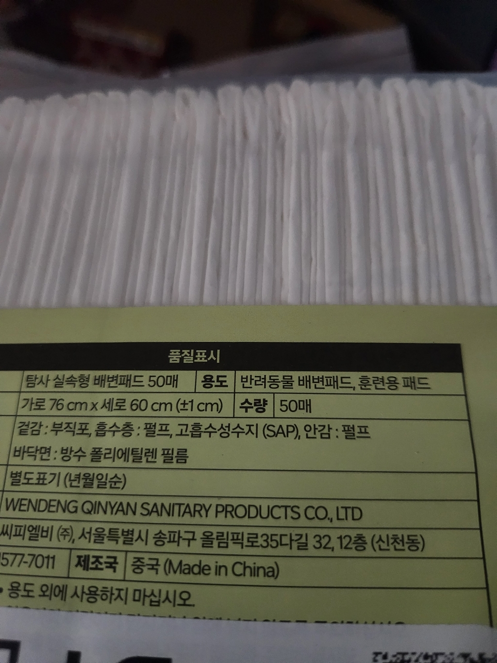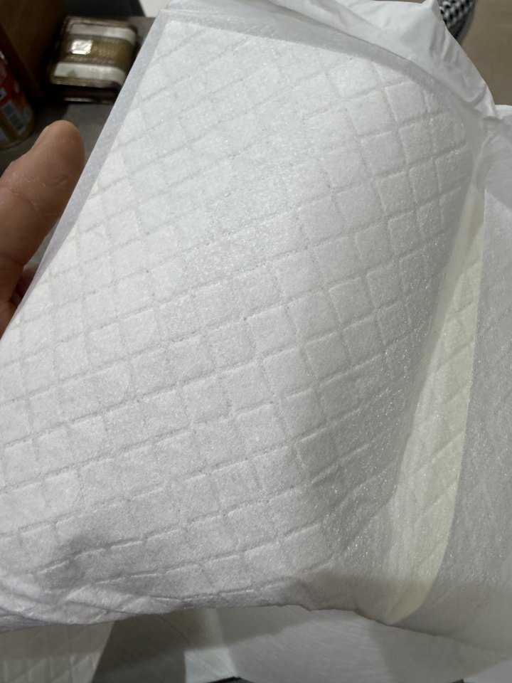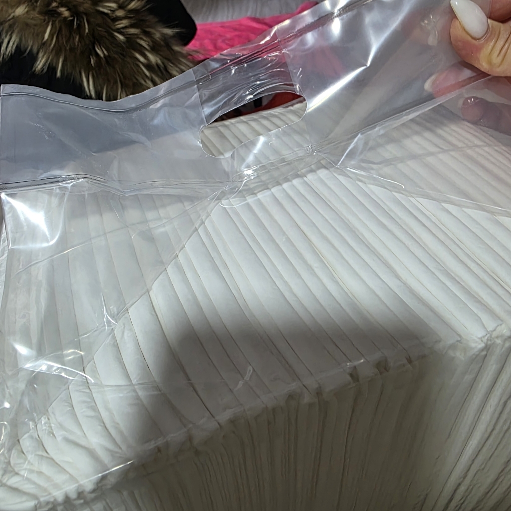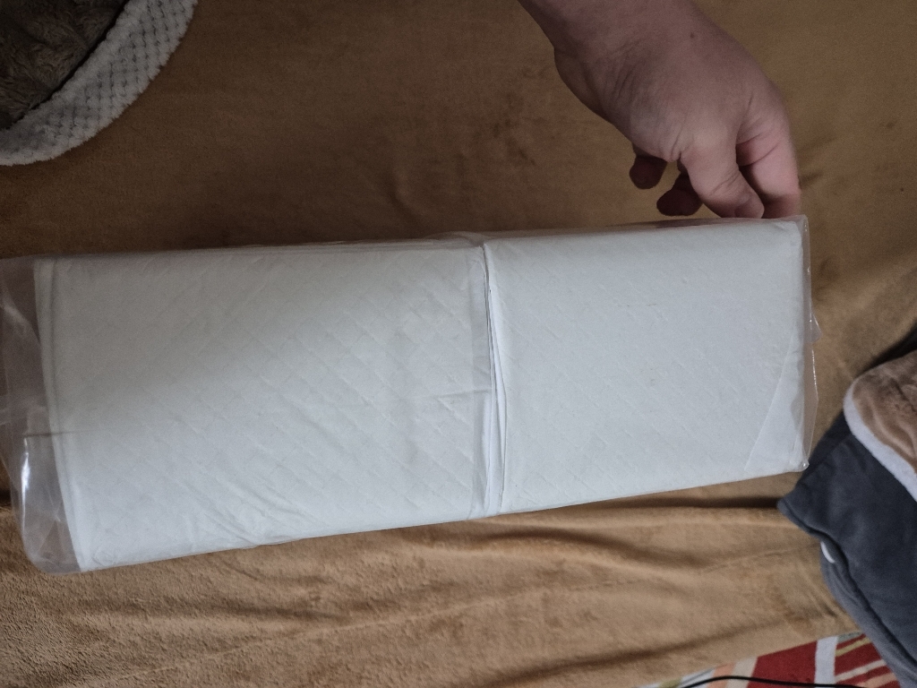 사이즈는 50×40cm라서 배변판에 딱 알맞은 크기예요. 저는 배변판에 여러겹 깔아서 사용중이에요. 소변도 많이 보는 편이고 갈아주기도 쉽고 휴지통에 버릴 때 부피도 크지 않아서 좋아요.