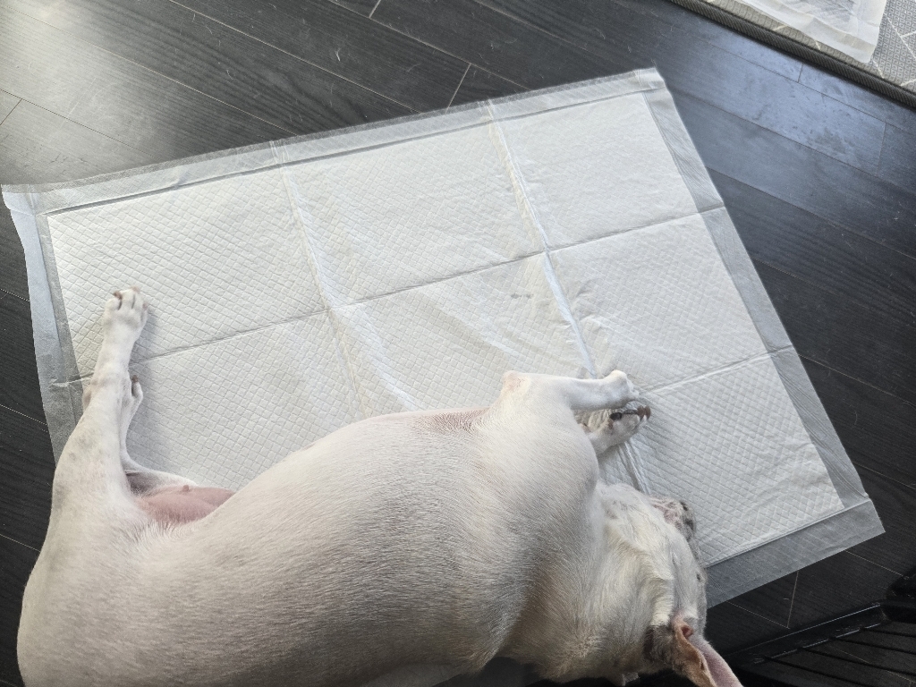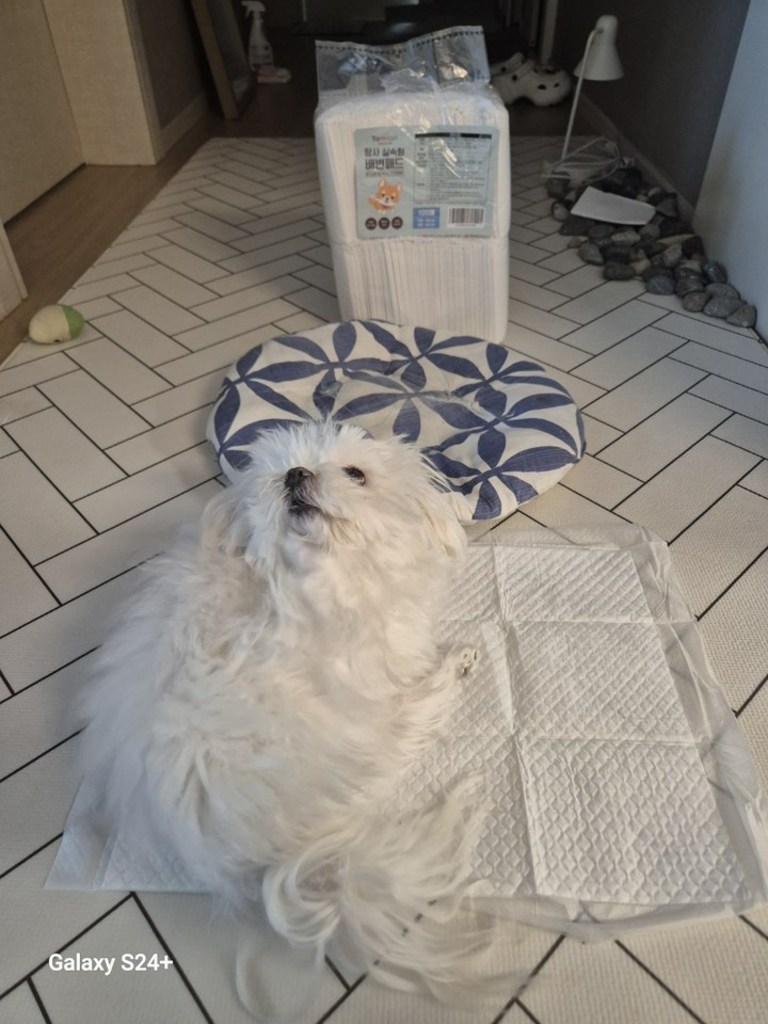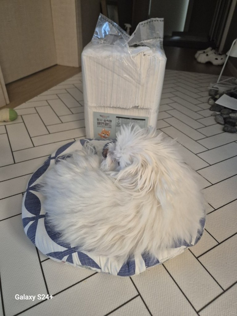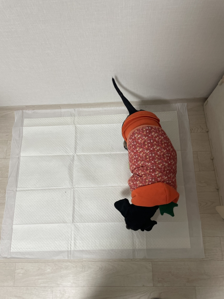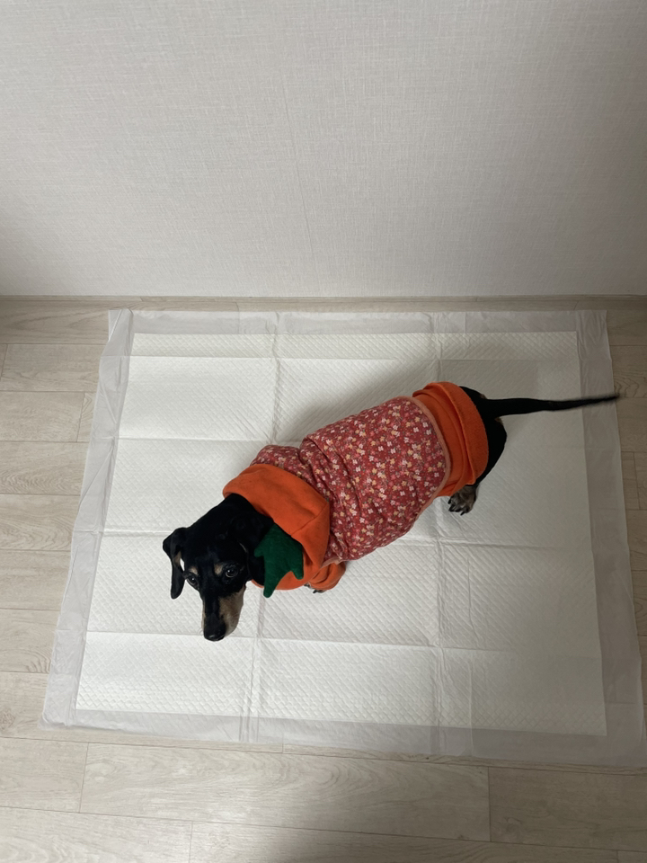 8살이 되면서 관절이 약해지고 산책 거부가 심해져서 하루종일 집에만 있는 날이 많아졌어요. 배변량은 예전이랑 비슷하고 패드 위에서 빙글빙글 돌며 위치 잡는 버릇 때문에 작은 사이즈는 절대 안되더군요.