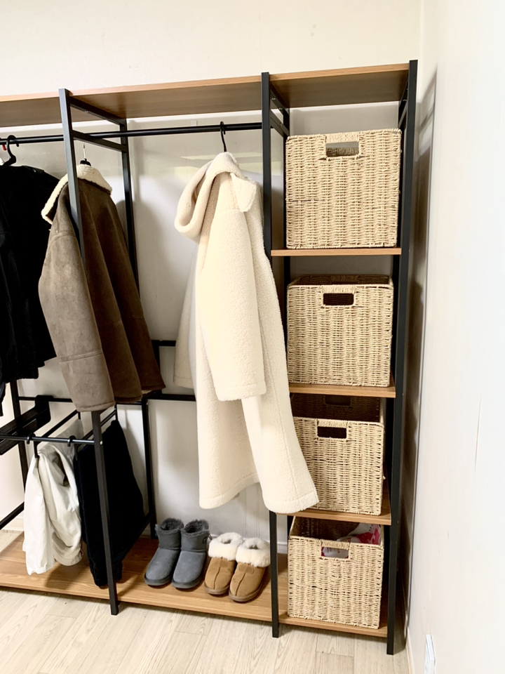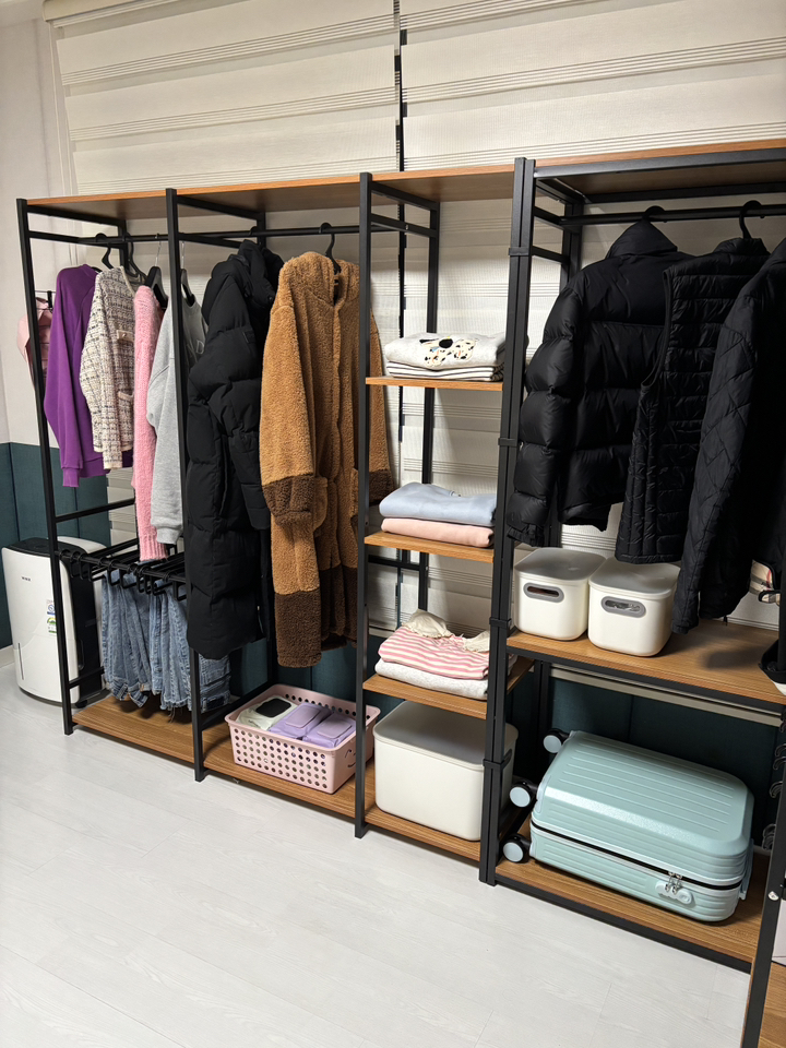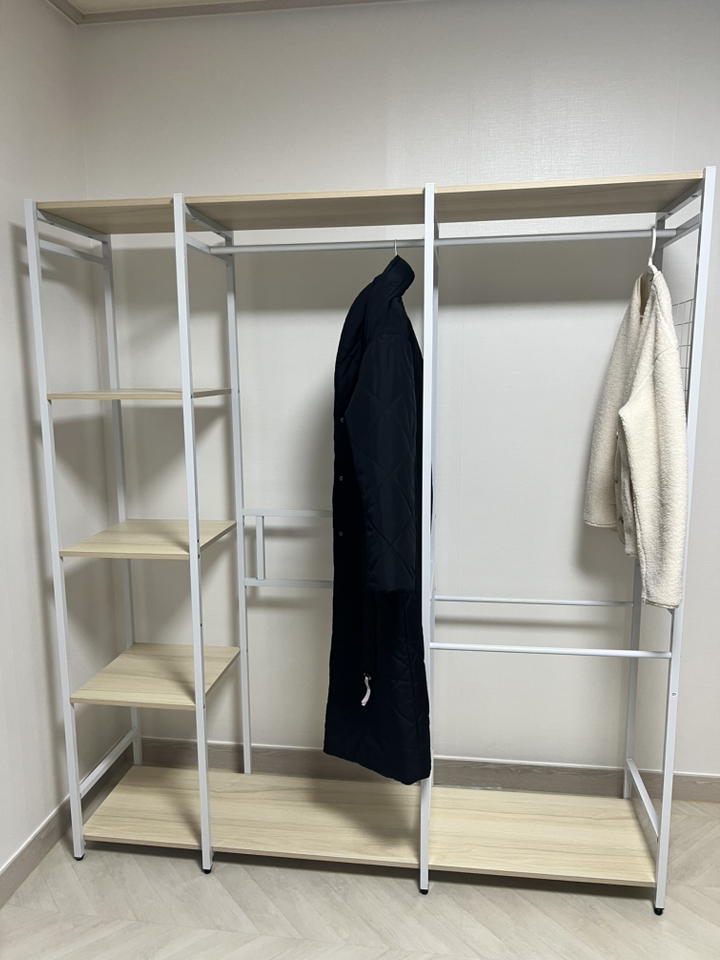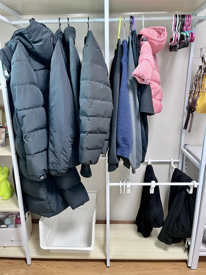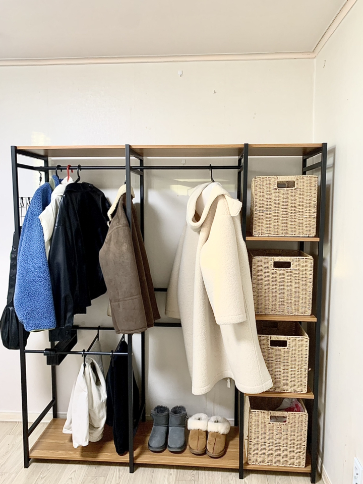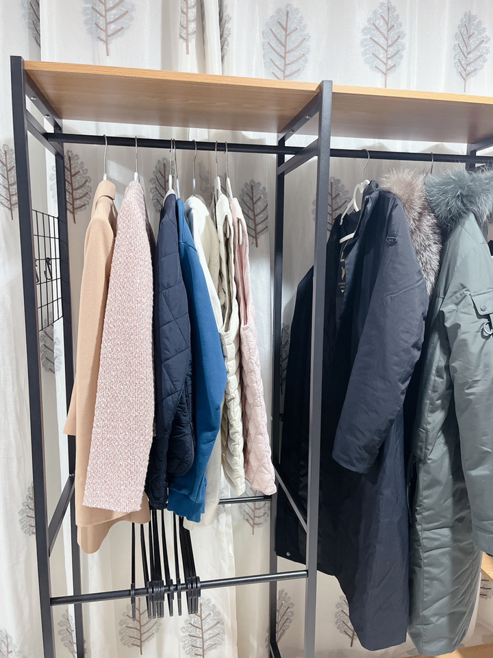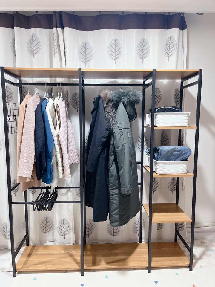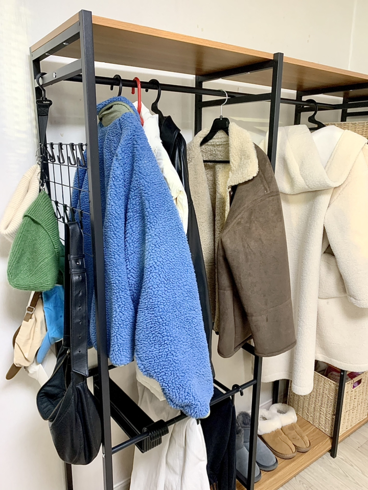 다양한 크기의 옷을 보관할수 있도록 조절 가능한 구조라 활용도가 높았어요. 저는 자주 입는 코트와 자켓은 행거에 걸고, 선반에는 접어서 보관할수 있는 니트와 가방을 정리했는데, 정말 깔끔하게 정리되더라고요.