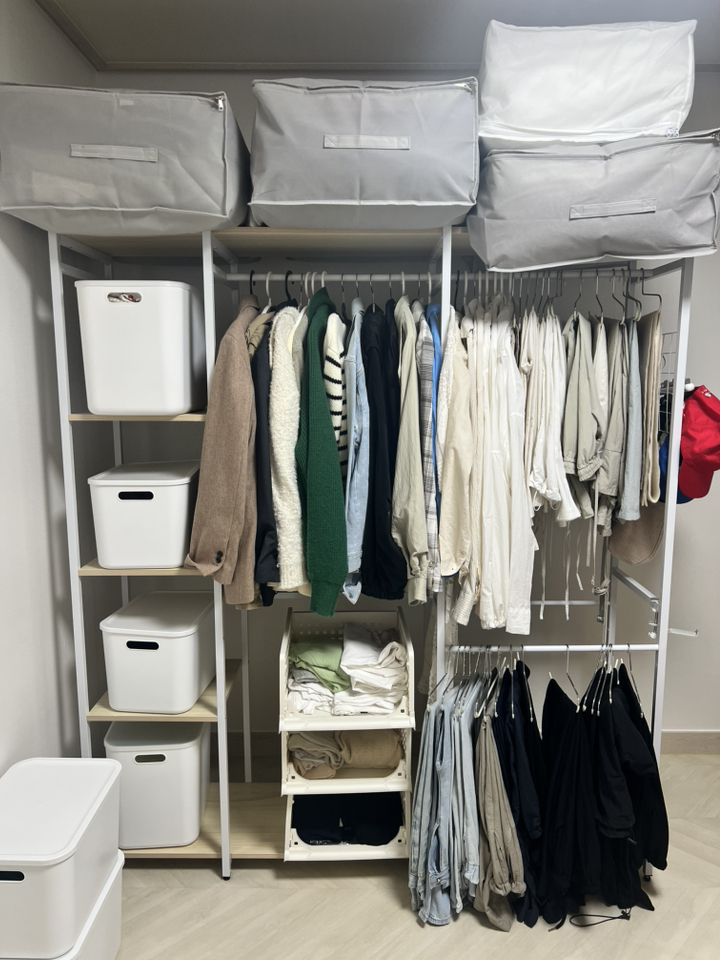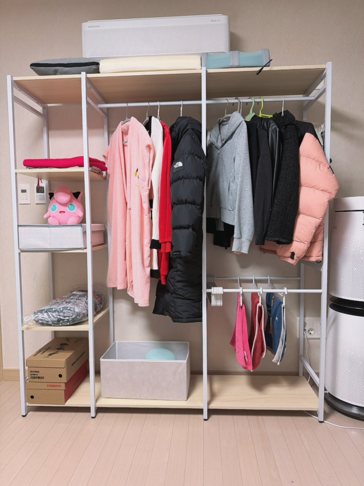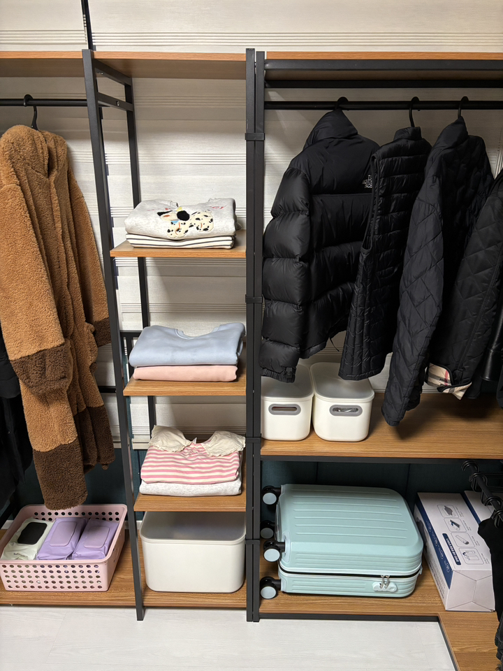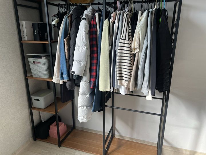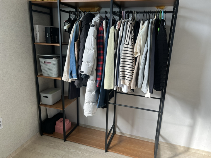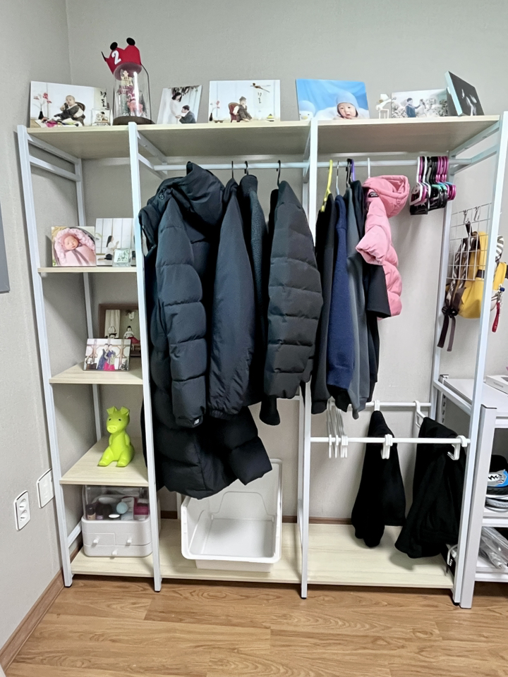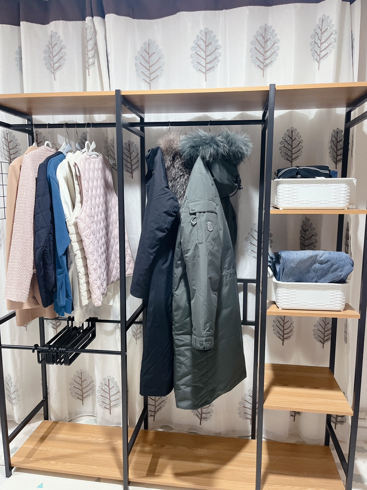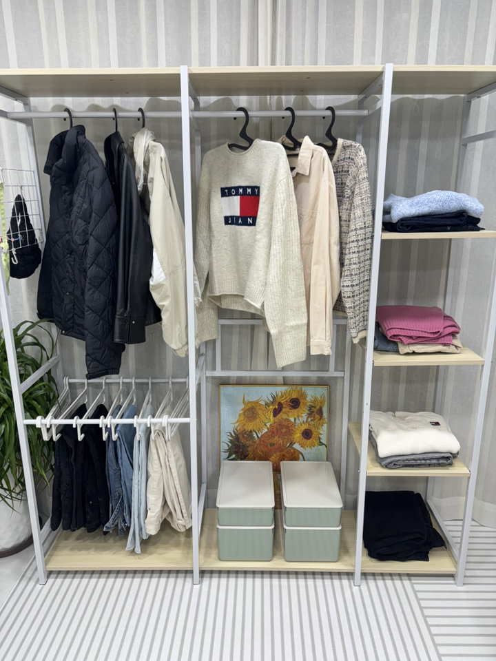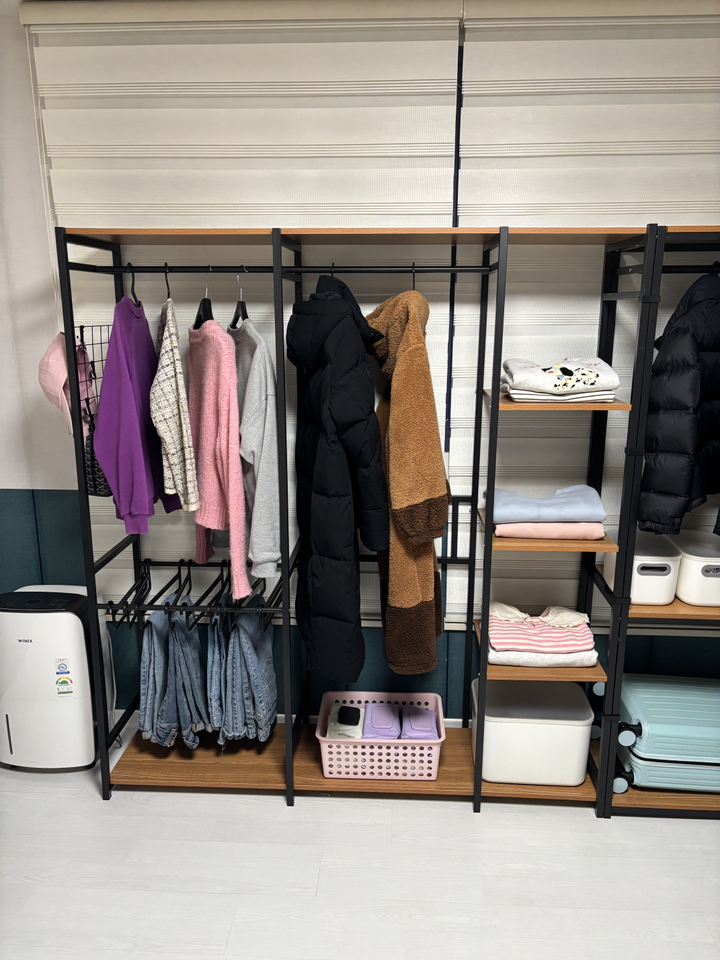 다양한 크기의 옷을 보관할수 있도록 조절 가능한 구조라 활용도가 높았어요. 저는 자주 입는 코트와 자켓은 행거에 걸고, 선반에는 접어서 보관할수 있는 니트와 가방을 정리했는데, 정말 깔끔하게 정리되더라고요.