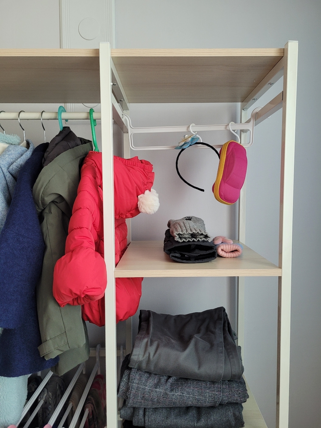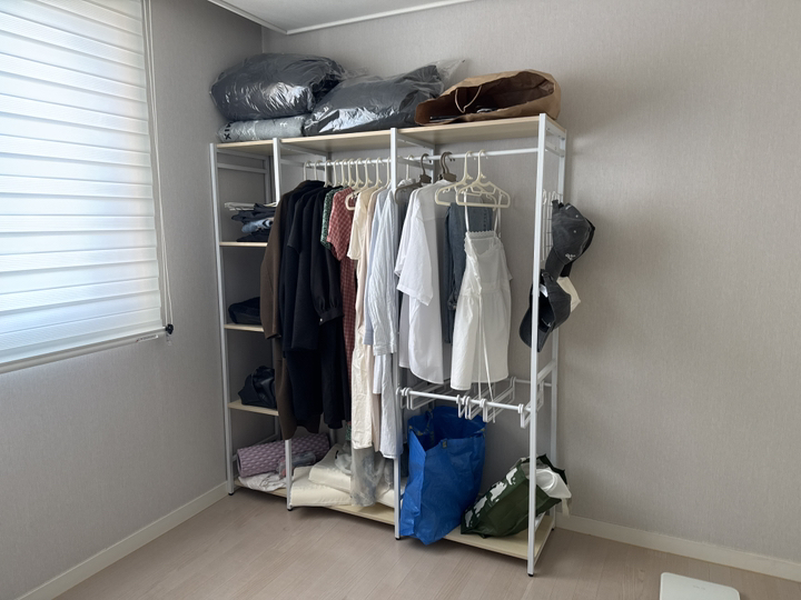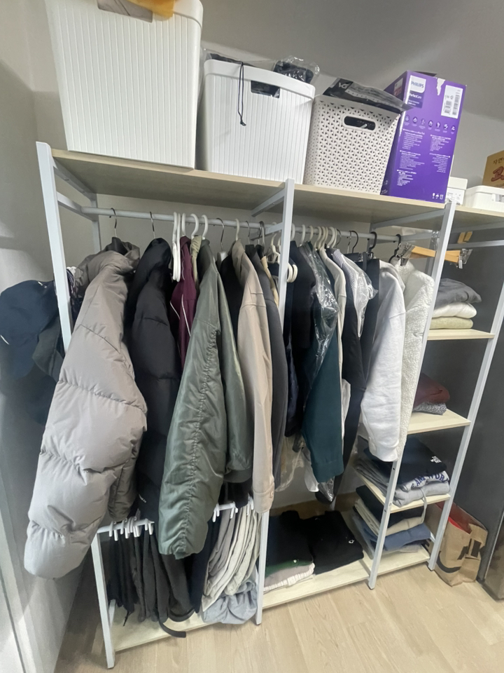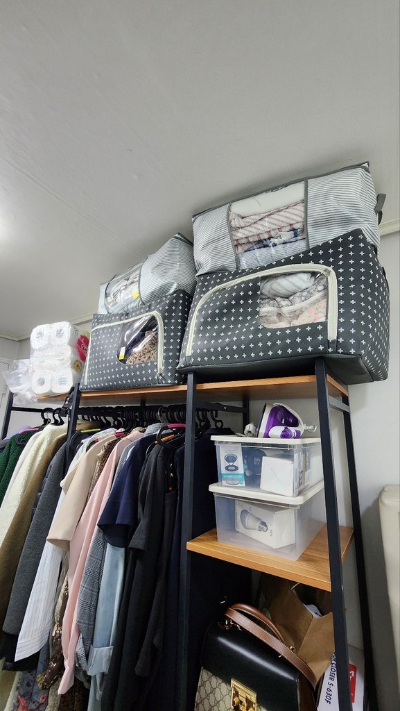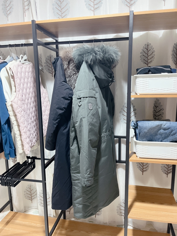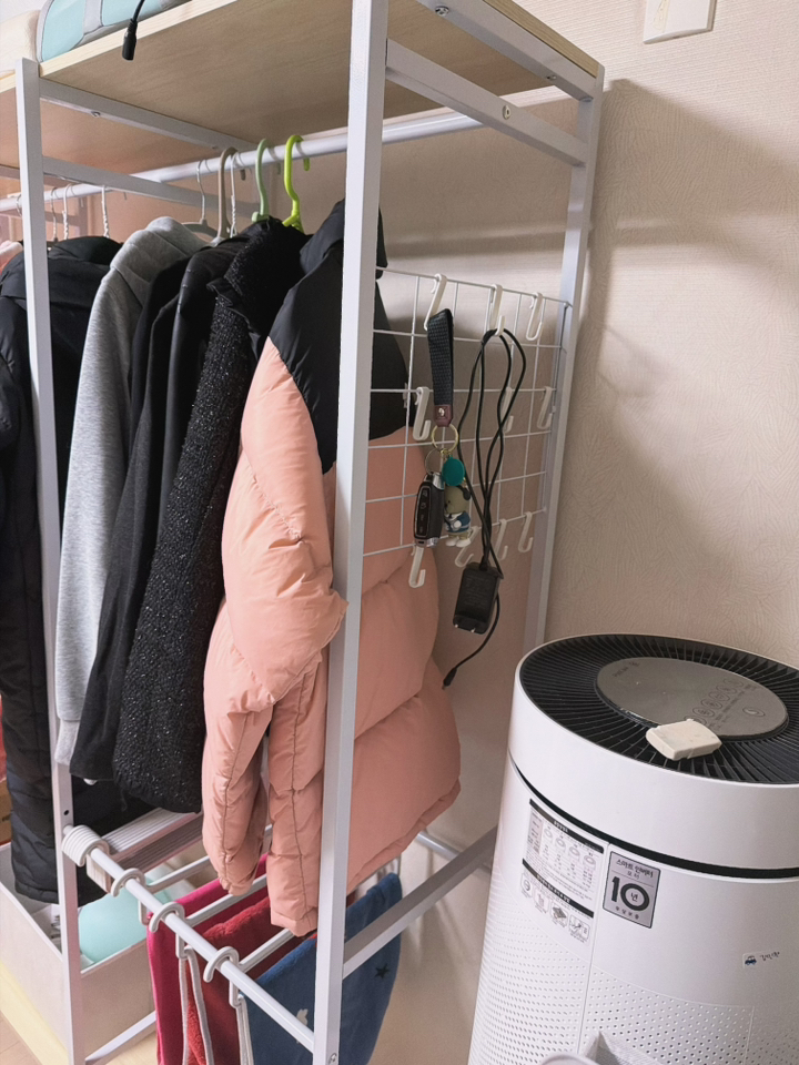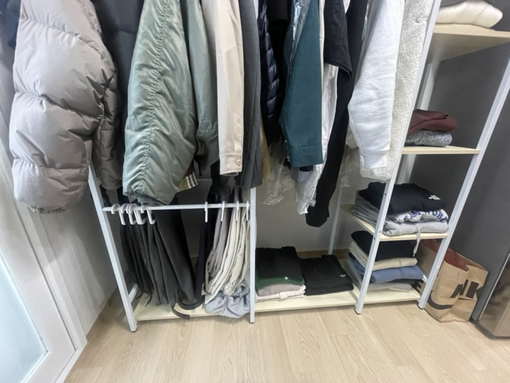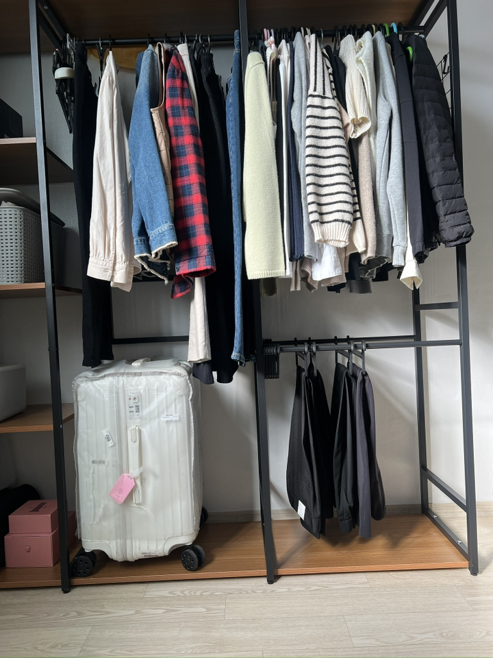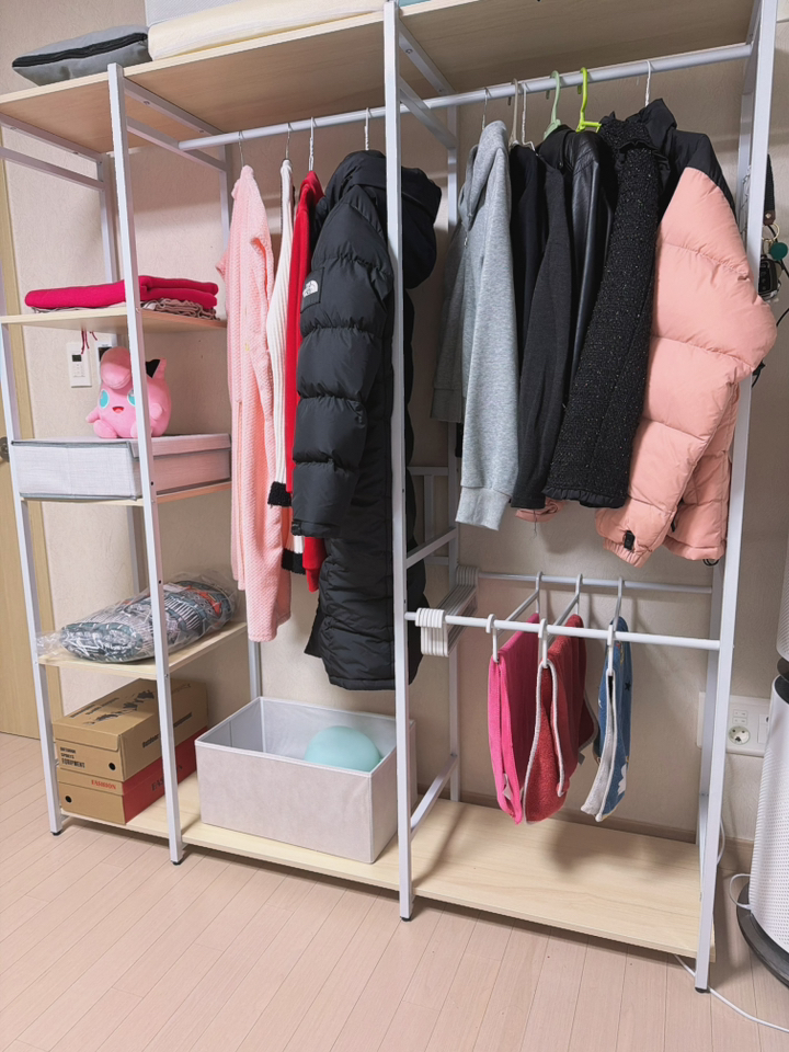 다양한 크기의 옷을 보관할수 있도록 조절 가능한 구조라 활용도가 높았어요. 저는 자주 입는 코트와 자켓은 행거에 걸고, 선반에는 접어서 보관할수 있는 니트와 가방을 정리했는데, 정말 깔끔하게 정리되더라고요.