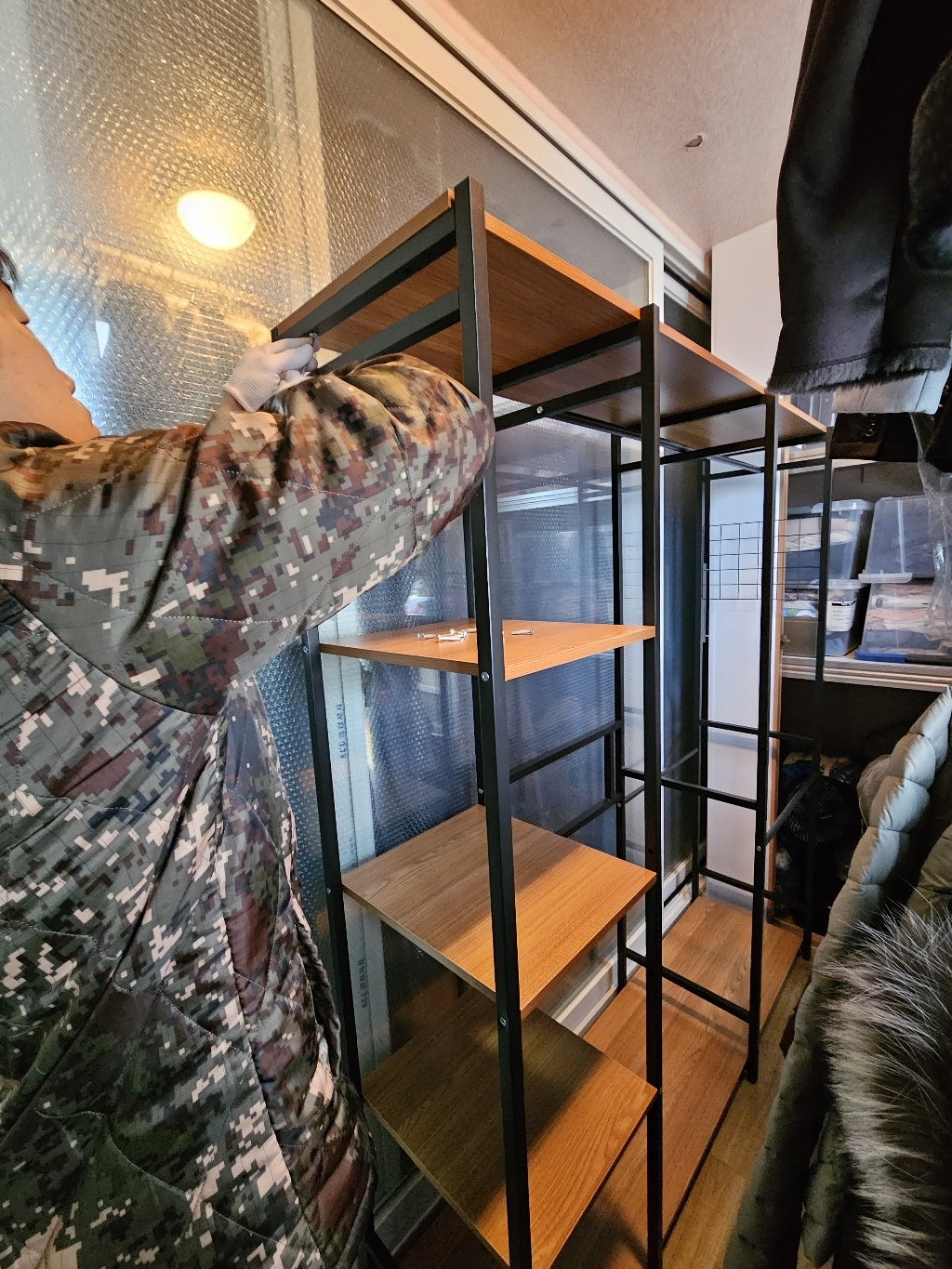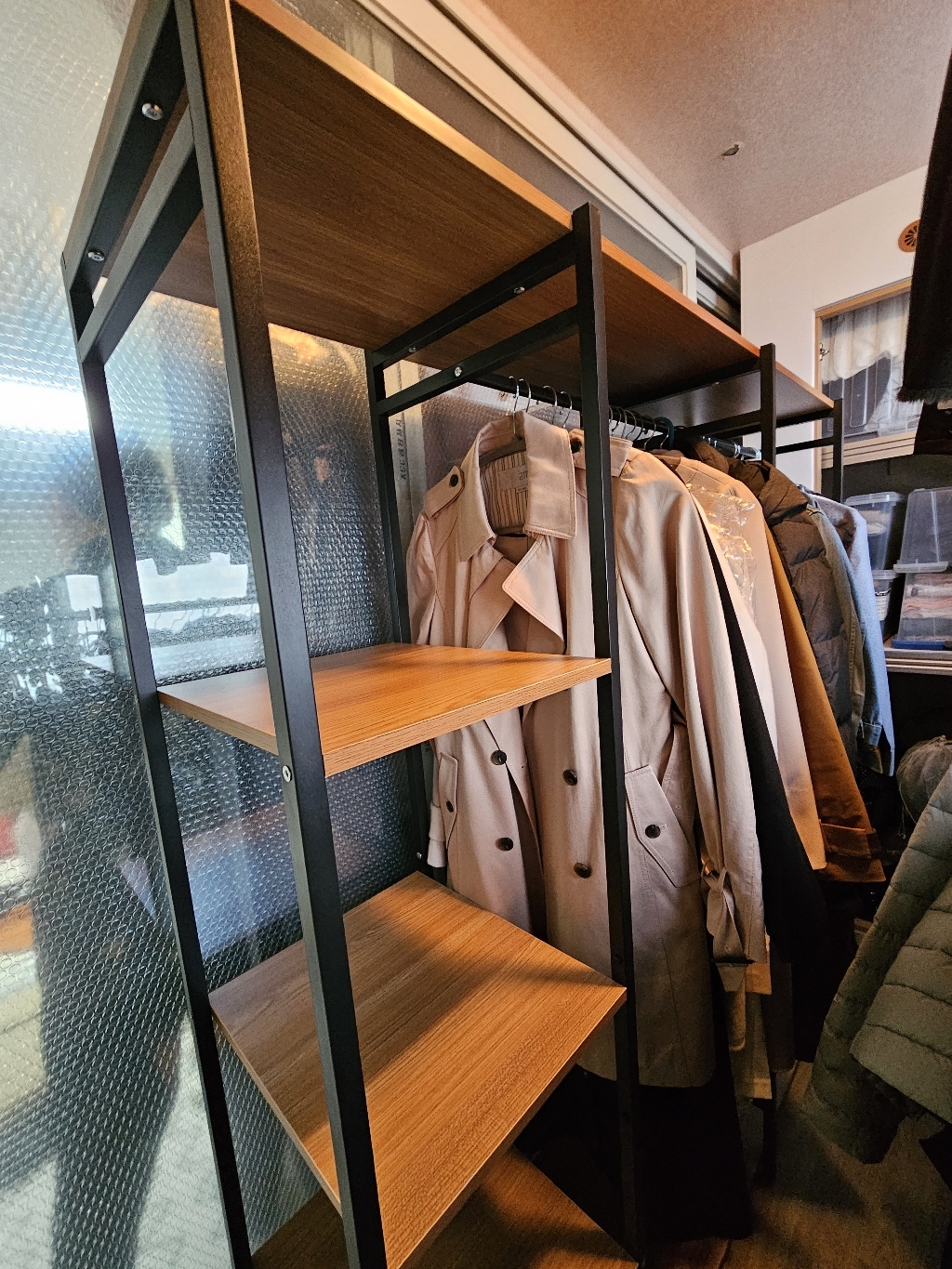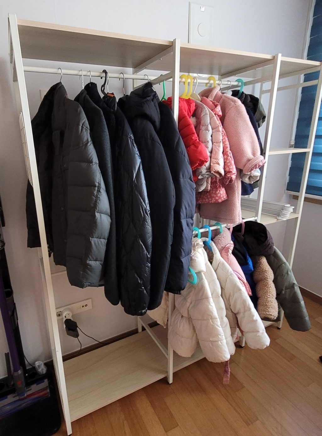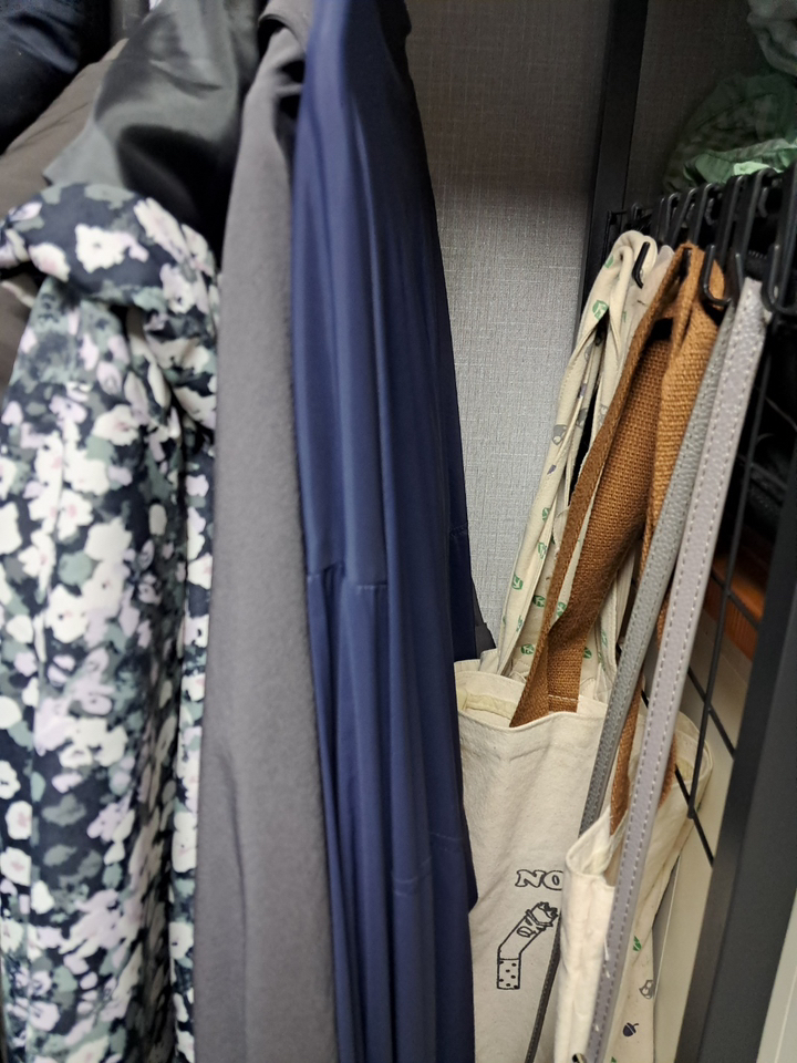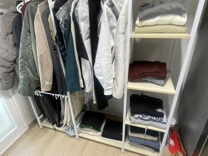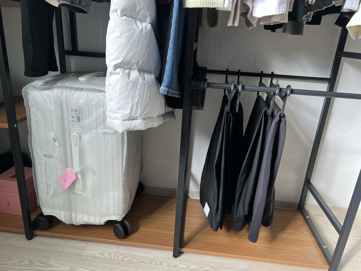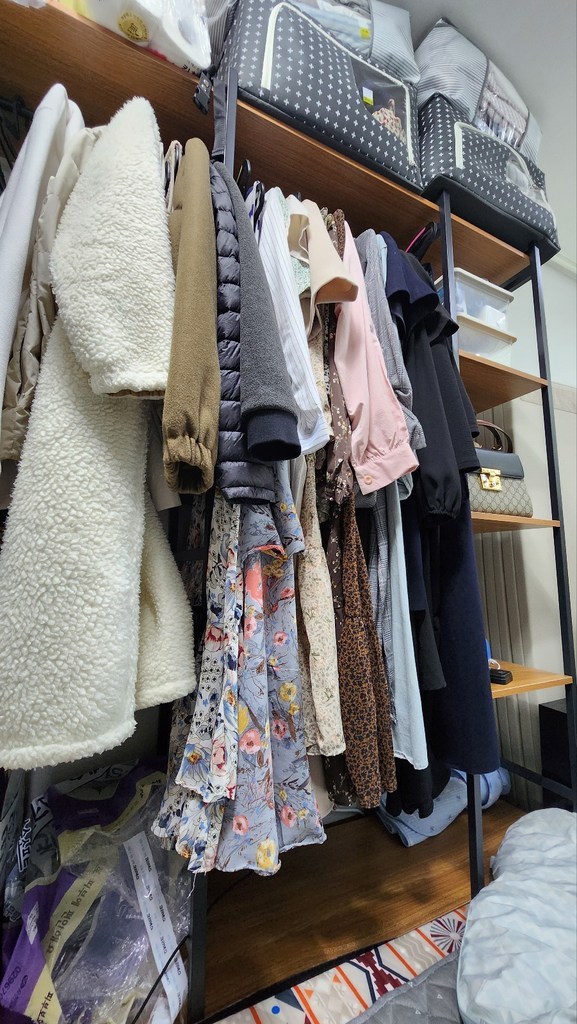 다양한 크기의 옷을 보관할수 있도록 조절 가능한 구조라 활용도가 높았어요. 저는 자주 입는 코트와 자켓은 행거에 걸고, 선반에는 접어서 보관할수 있는 니트와 가방을 정리했는데, 정말 깔끔하게 정리되더라고요.