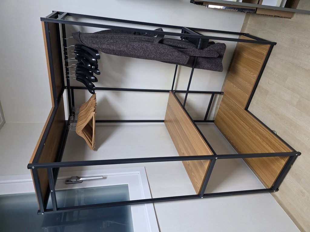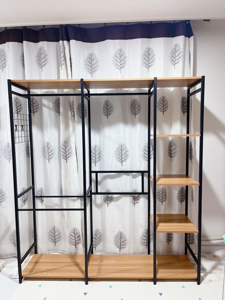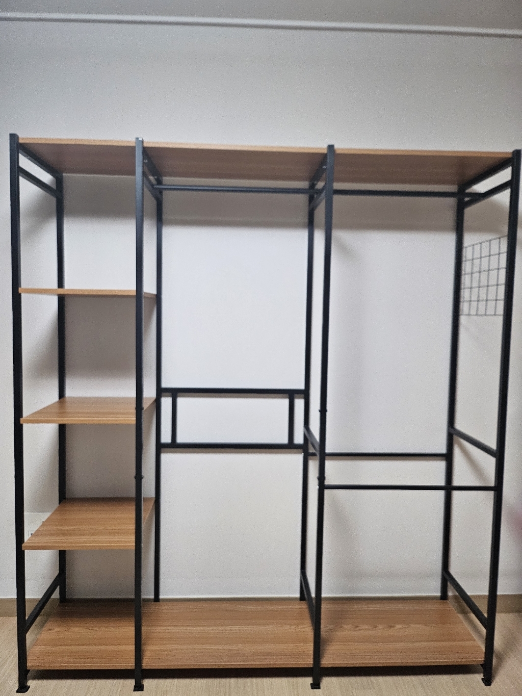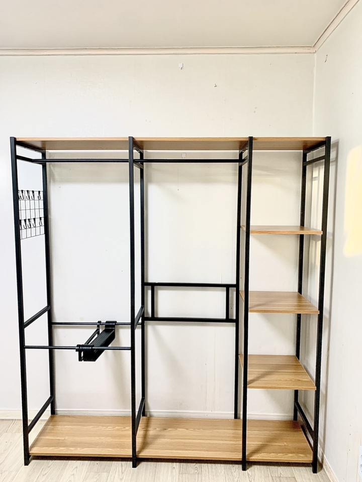 색상은 검정색 철제 프레임과 원목색 나무판자를 조합했어요.원래 집에 있는 옷장 화이트 위주로 되어 있었는데 이 검정색이랑 원목색이 너무 예뻐 보여서 이 색을 골랐는데 진짜 사진 처럼 너무 예뻐서 진짜 고급스러워 보이더라고요. 이 가격에 이렇게 예쁜 옷장을 살 수 있다니 정말 가성비가 좋은 것 같아요.