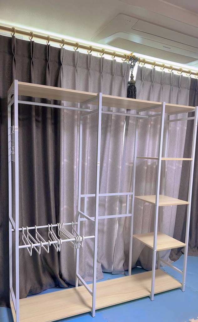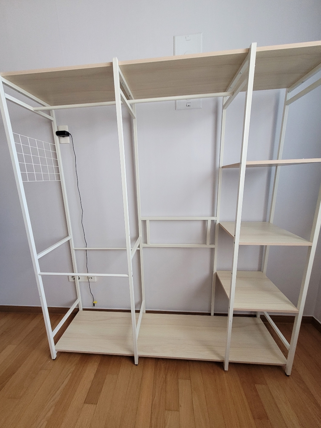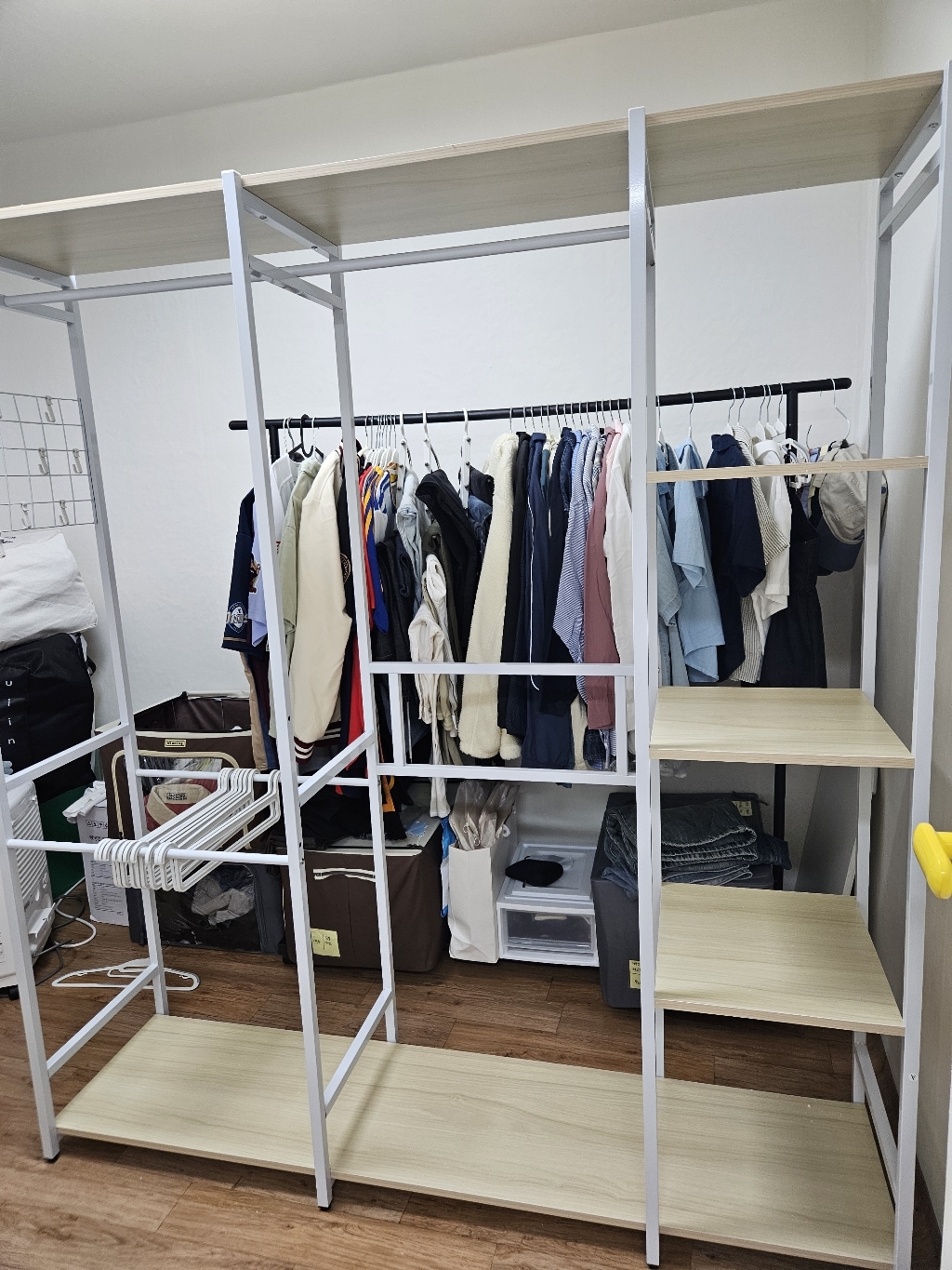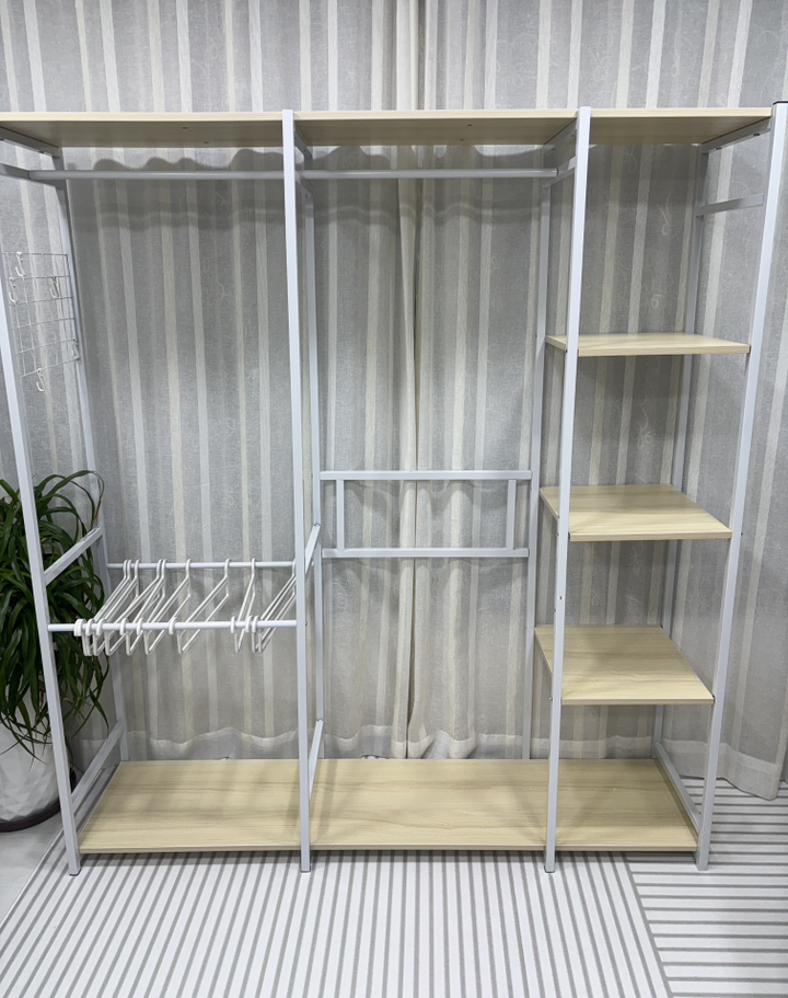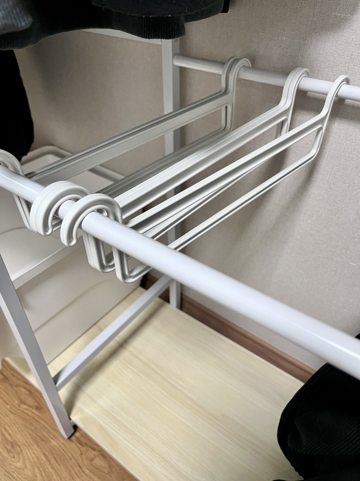 ️이 제품은 긴옷공간 짧은옷공간 바지공간까지 다나누어져있어서 너무 좋아요 어던옷이랑도 어떻게 걸어도 지저분하지않고 깔끔하고 좋아요 옆에 선반도 있어서 바구니나 옷이 개서 정리하기도 편하구요