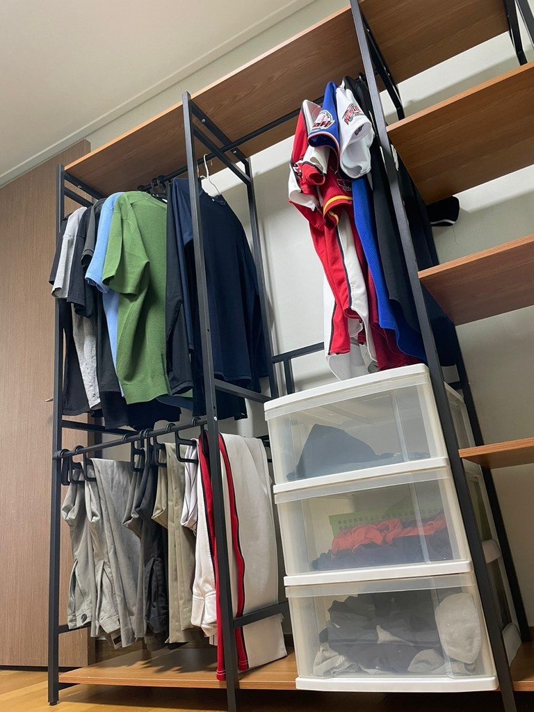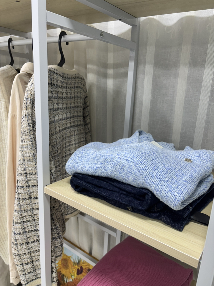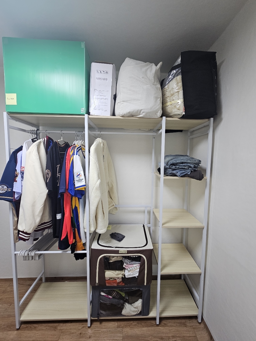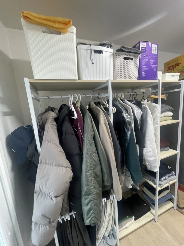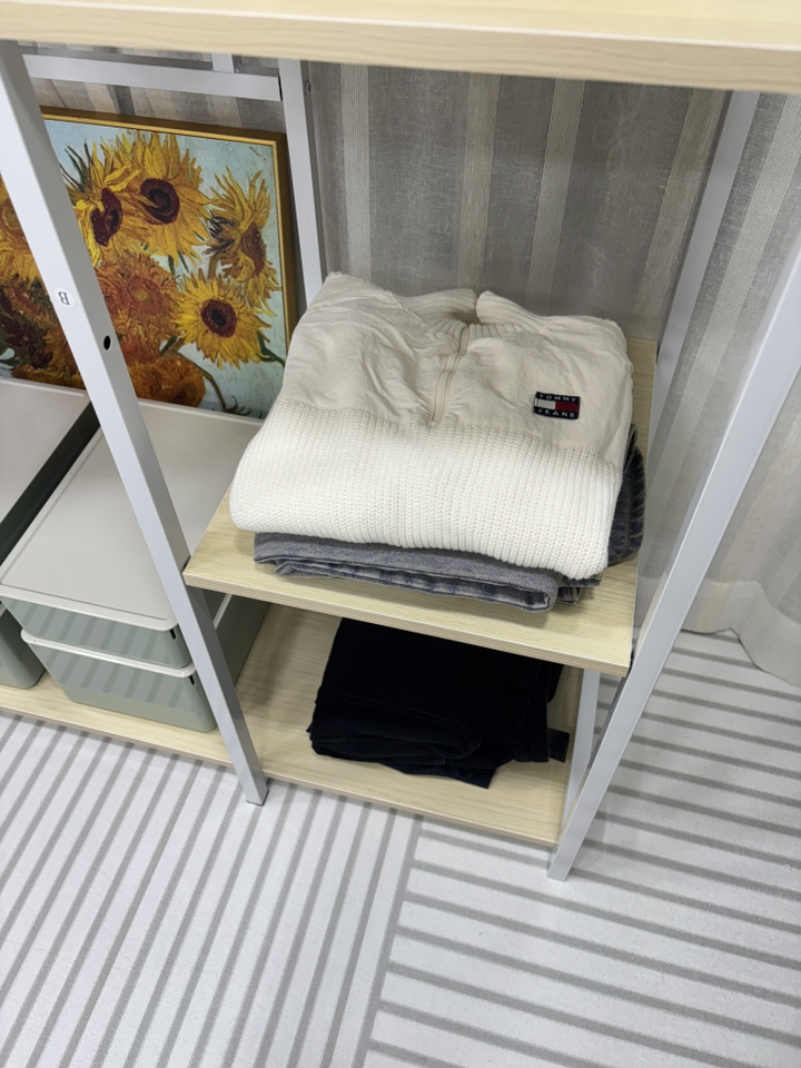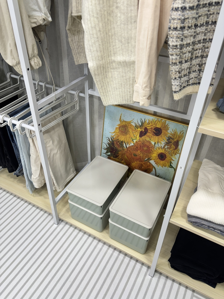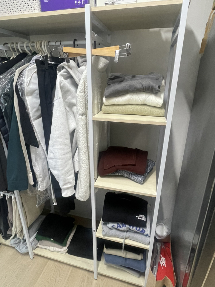 • 선반 공간: 접어놓은 니트, 스웨터 같은 옷이나 수납 박스를 올려놓기에도 적합해요. 선반이 여러 층으로 나뉘어 있어서 활용도가 정말 높아요.