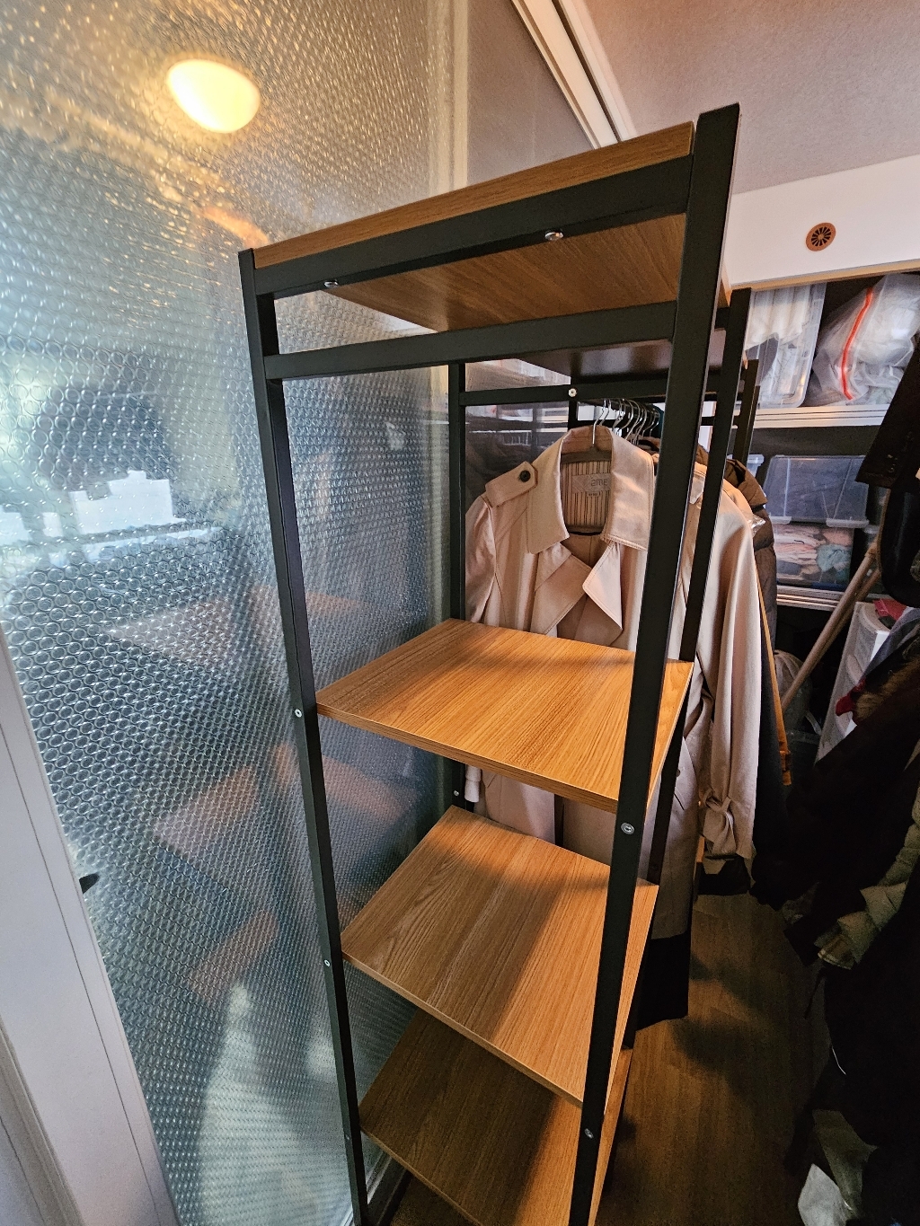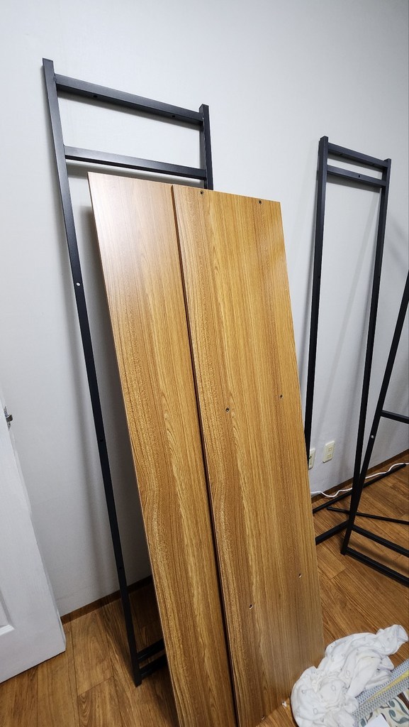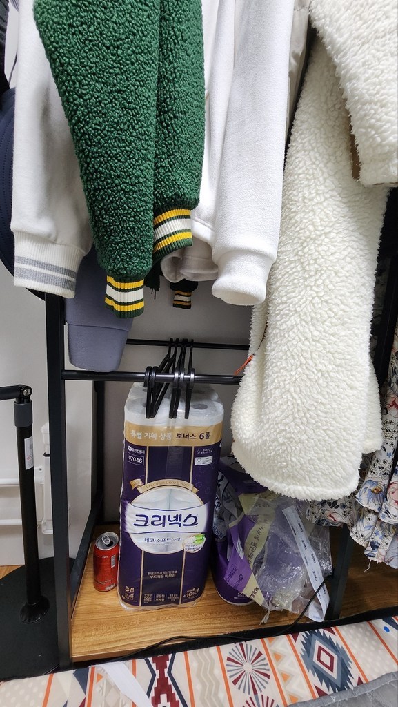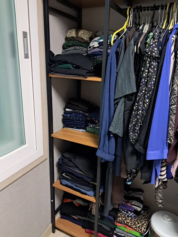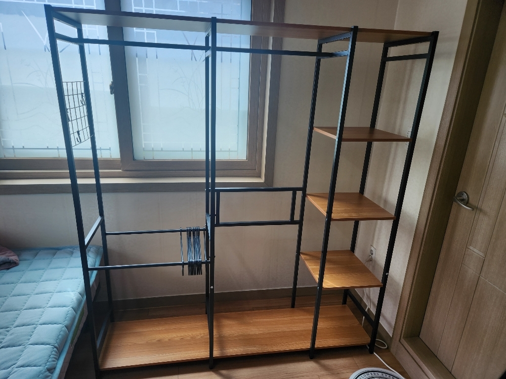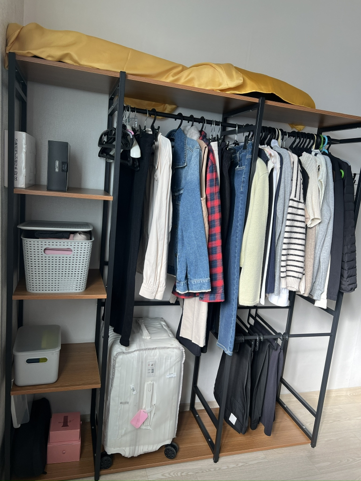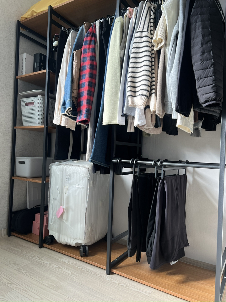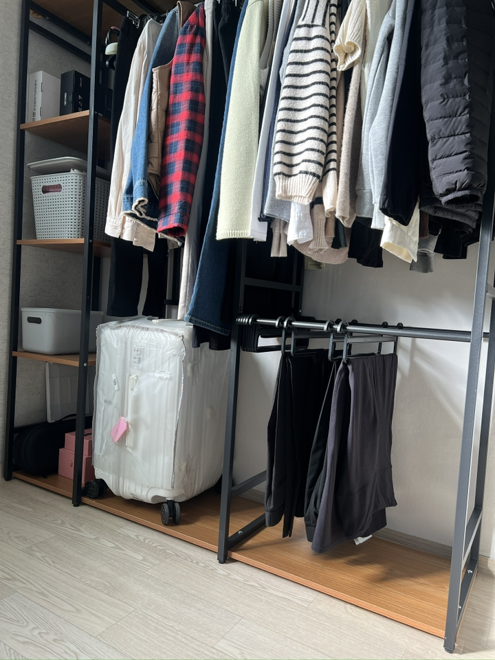 조립해놓고 보니 밝은 우드 컬러가 공간을 확 화사하게 만들어줘서, 미니 투룸 같은 작은 공간에서도 훨씬 더 트여보였어요 물론 옷을 가득 걸게되니 다시 좁아보이게됐지만 그래도 검정색 쓰던때보단 나아요!