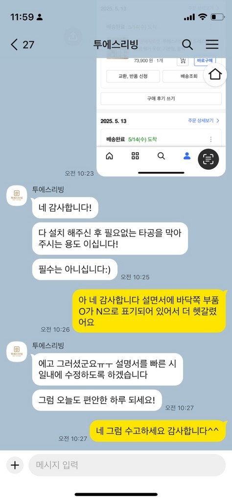 쿠팡에 연락해보니 다시 분해하고, 포장해서 전체 교환하거나 새 상품 받아서 부품 하나 빼고 되돌려보내라더라고요. 이거 포장 전체 랩핑돼있어서 부품빼려면 다 풀러야하는데.. 제 노고도 손해, 판매자도 새상품의 부품빼고 반품되면 손해인데.. 게다가 전 이미 앞전에 불량으로 교환 한번해서 그 고생 이미 했는데요… 그래서 판매자에게 얘기라도 해봐달라니 상담사가 안된다고 해서 제가 판매자에게 직접 문의했더니 부품만 보내준다 하네요. 얘기하자마자 바로 보내주셨어요.