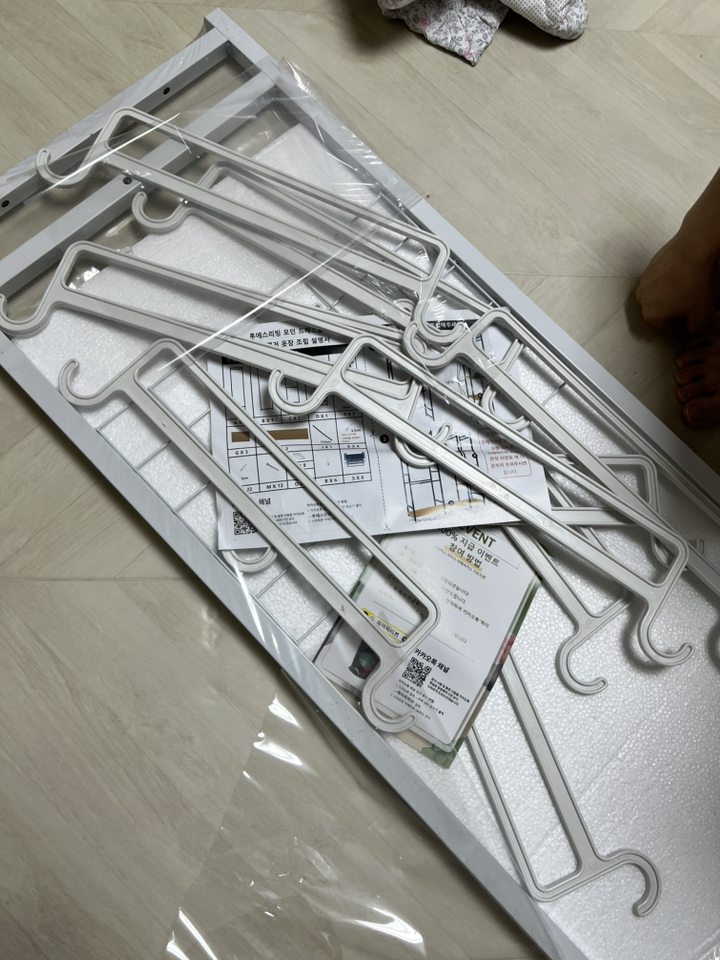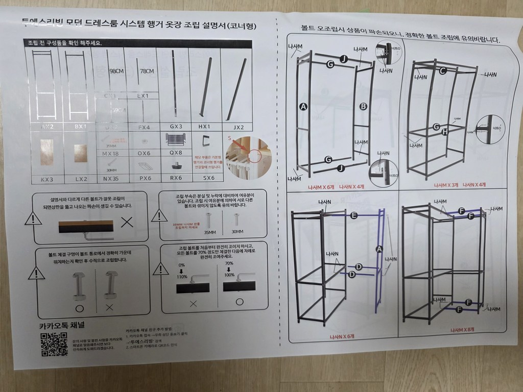 설명서가 자세히 나와 있어서 혼자서도 어렵지 않게 설치할수 있었고, 튼튼한 프레임 덕분에 무게를 잘 견뎌서 옷을 많이 걸어도 안정감 있게 사용할수 있었어요.
