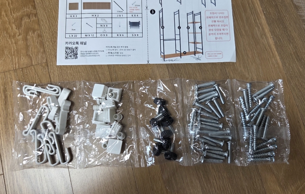 공구는 완전 자세하게 분류되어 있어요, 설치하기 전에 모든 부품을 확인했어요.부족한 부품은 하나도 없어요. 증정하는 작은 설치 도구 하나로 옷장 전체를 쉽고 빠르게 설치할 수 있어요.
