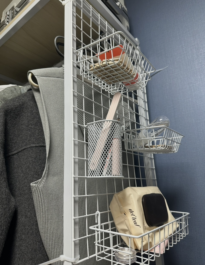 튼튼한 봉덕에 네트망 달고 화장품, 소형 소품들을 걸어두고있어요 헤헤 네트망은 다이소꺼고 케이블타이는 쿠팡꺼예요!