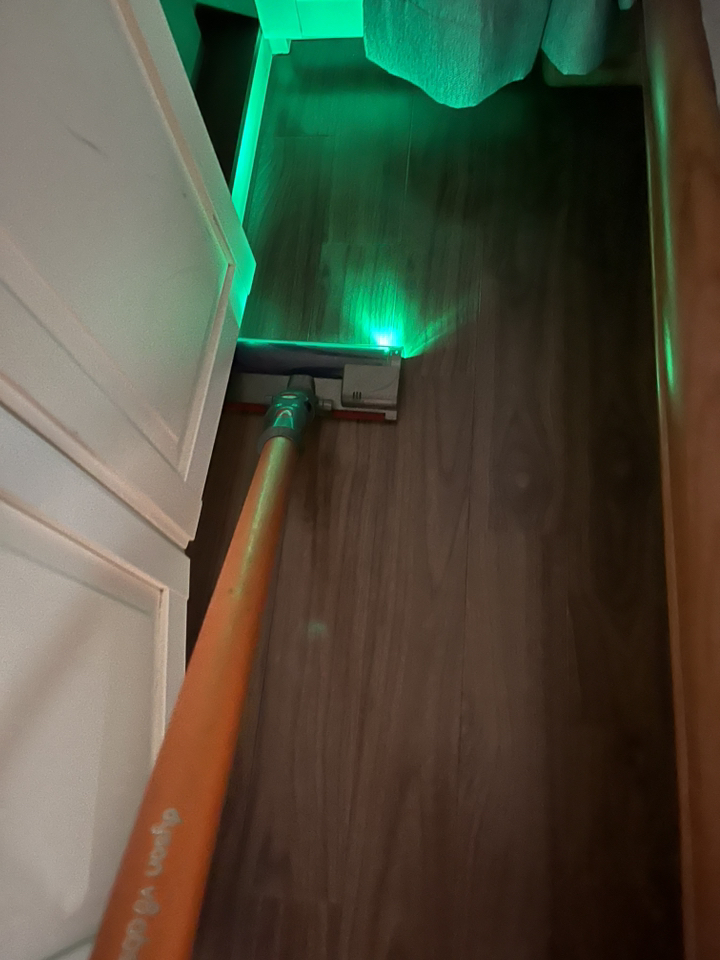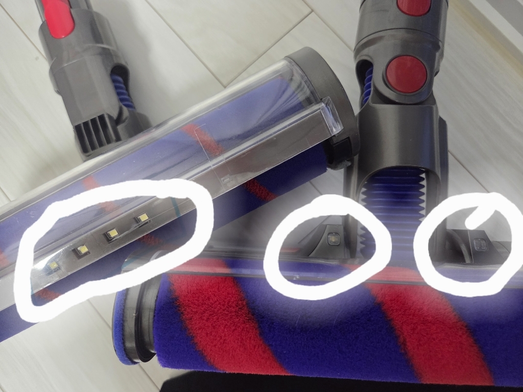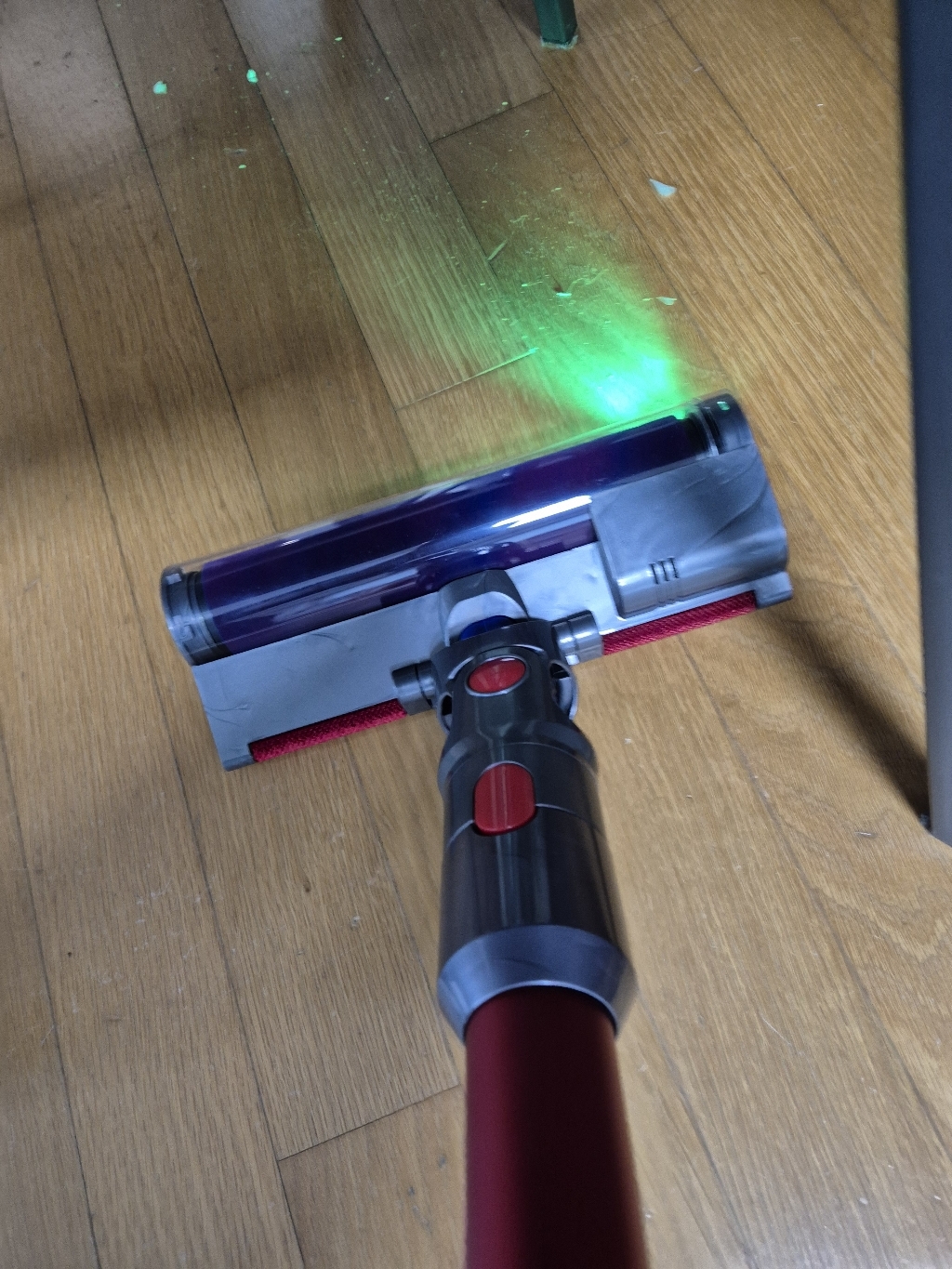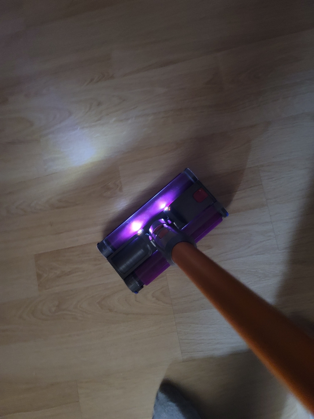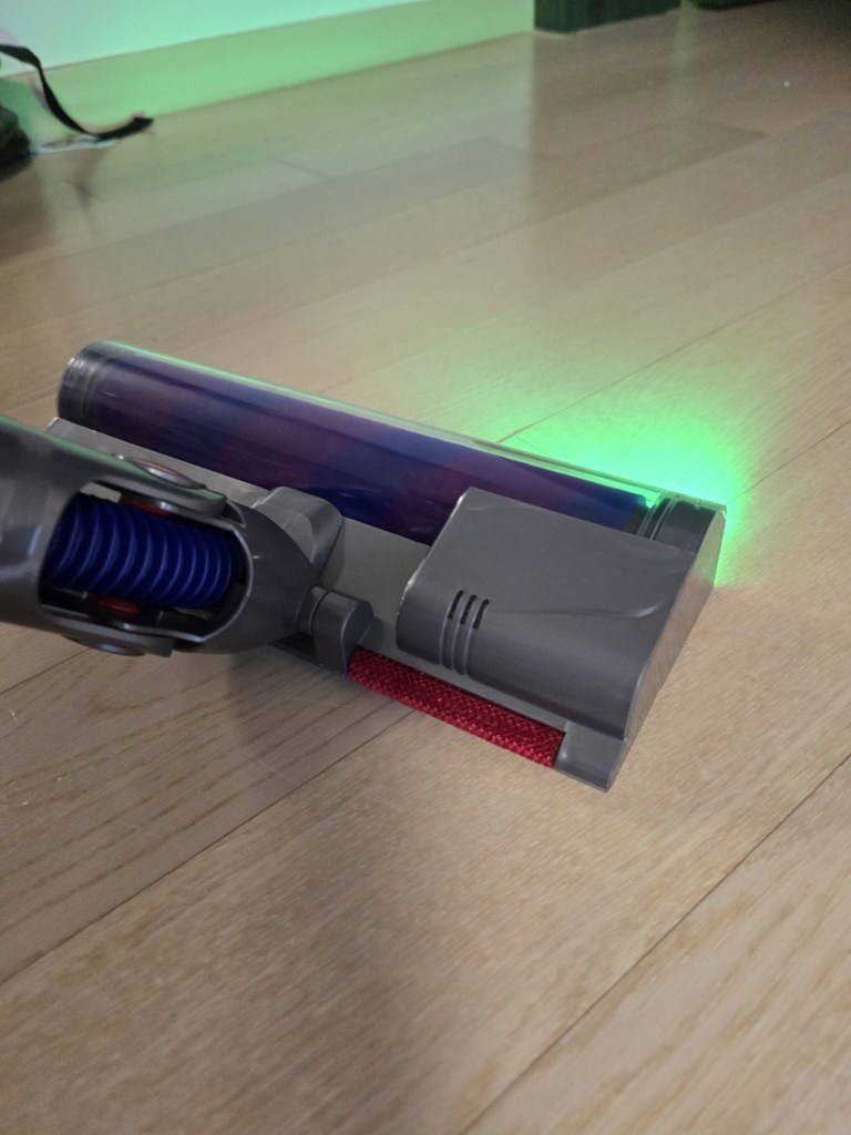 아쉬운 점도 있었습니다. 먼저 소음이 기존 정품 헤드보다 약간 더 크게 느껴졌습니다. 청소할 때 크게 거슬릴 정도는 아니지만, 조용한 시간대에는 확실히 차이가 있었습니다. 또 LED가 바닥 전체를 골고루 밝히는 건 아니고, 앞쪽 부분만 집중적으로 비춰 주다 보니 넓은 공간을 한 번에 청소할 때는 LED 효과가 덜 느껴졌습니다.