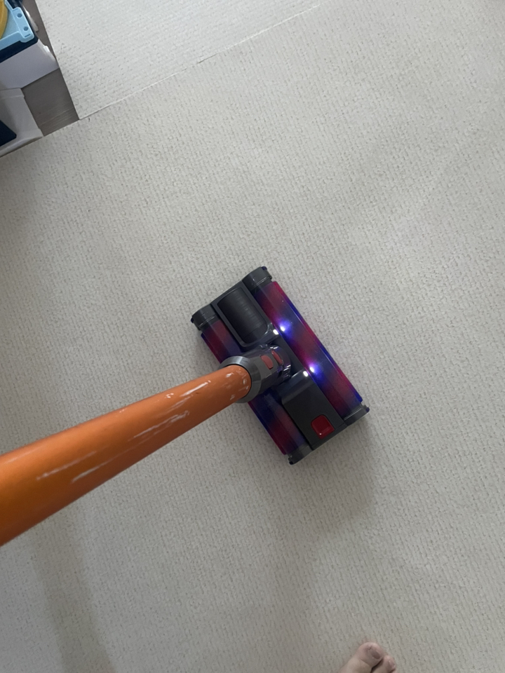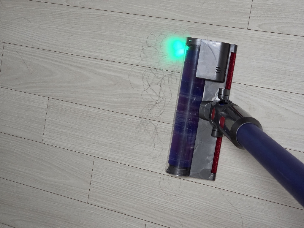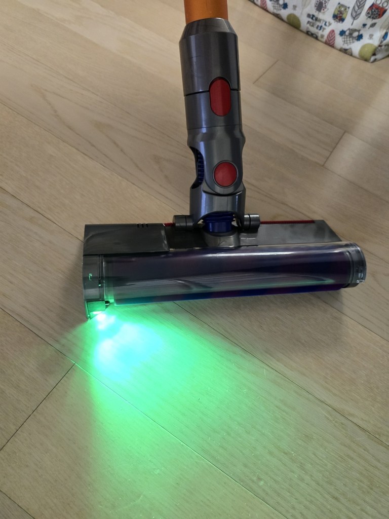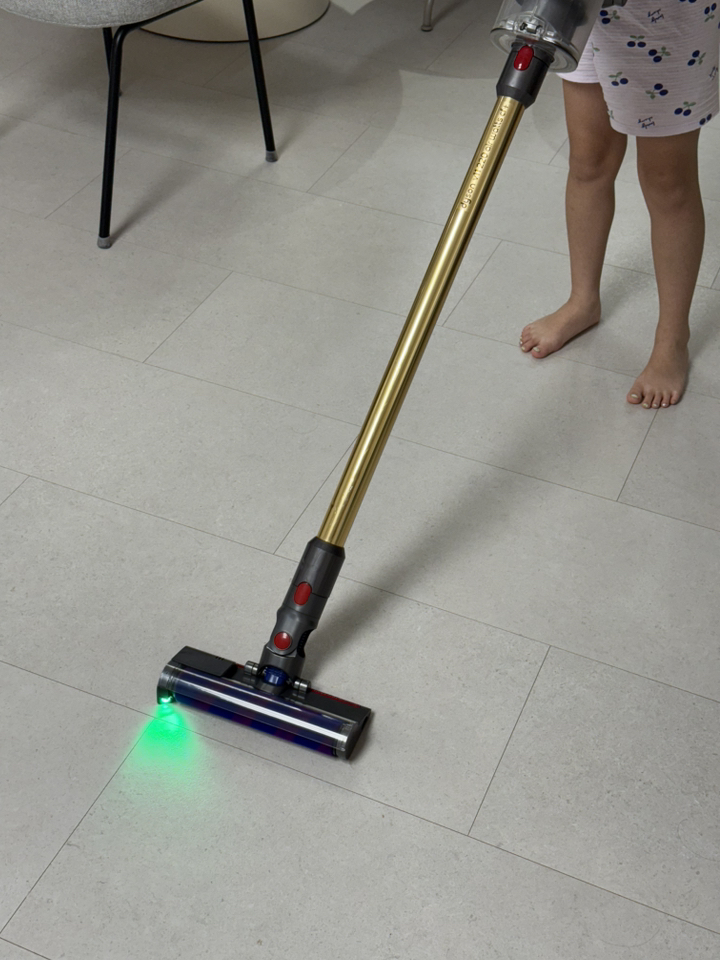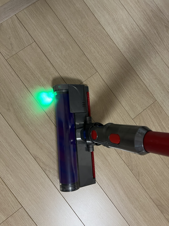 가장 큰 장점은 청소할 때 놓치기 쉬운 먼지를 LED가 비춰 주어 바로바로 확인할 수 있다는 점입니다. 덕분에 청소가 더 꼼꼼해졌고, 바닥에 머리카락이 덜 굴러다니니 아이가 놀 때도 마음이 놓였습니다. 또 회전 브러시가 잘 돌아가고 바닥 밀착력이 좋아서 먼지가 잘 빨려 들어갔습니다. 기본 정품 헤드보다 가볍게 느껴지는 것도 장점이라 오래 들고 있어도 팔이 편했습니다.