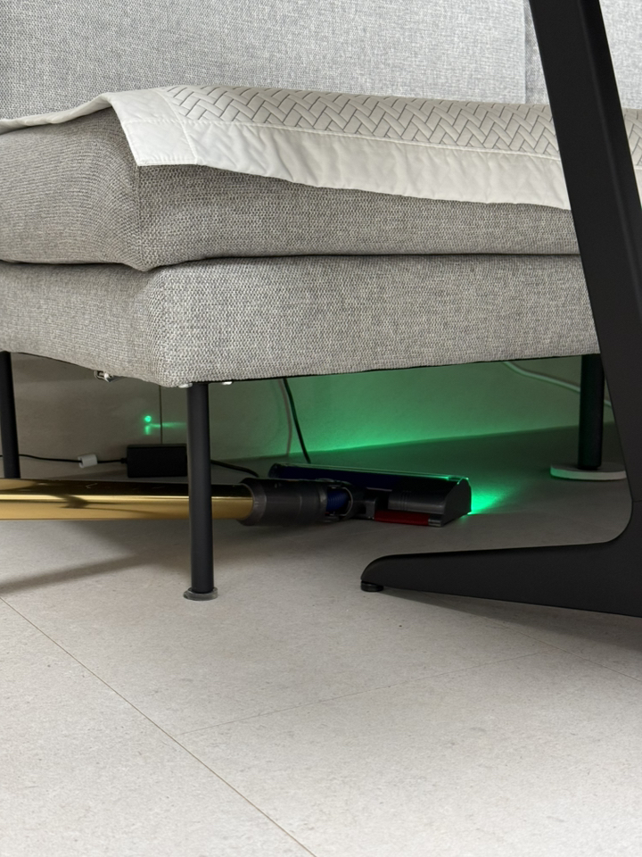 무엇보다 편한점은 LED 불빛 덕분에 먼지가 눈에 잘 들어오니까, 대충 밀던 청소 습관도 저절로 고쳐지더라구요. 덕분에 놓치는 곳 없이 꼼꼼하게 청소하게 되고, 같은 시간을 청소해도 훨씬 깔끔해지는 느낌입니다. 이젠 청소할 때마다 숨어있던 먼지들 찾아내는 재미가 쏠쏠해요. 특히 밤에 청소할 때, 거실 불 끄고 청소해도 모든 먼지가 선명하게 보이니까 한번에 청소 끝!완전 효율적이에요.