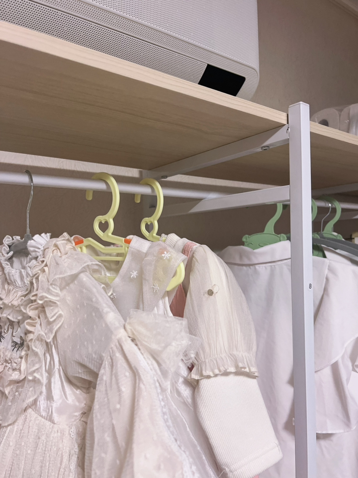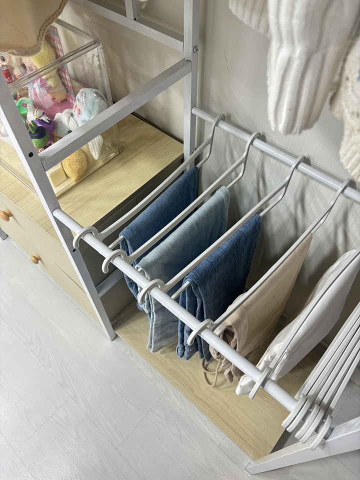 구성도 아주 합리적이에요. 긴 원피스부터 짧은 상의까지 각각 알맞은 공간이 있어서 정리하기 편하고, 사은품으로 바지걸이까지 주셔서 큰 도움이 됐습니다. 바지를 따로 보관할 수 있는 전용 공간이 생겨서 정말 속이 다 시원하네요.