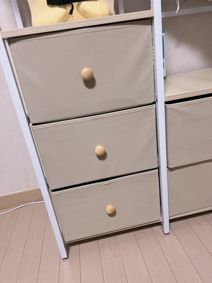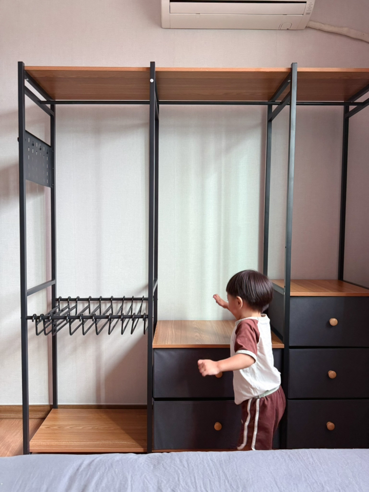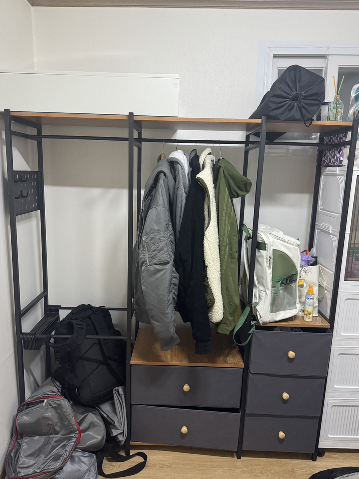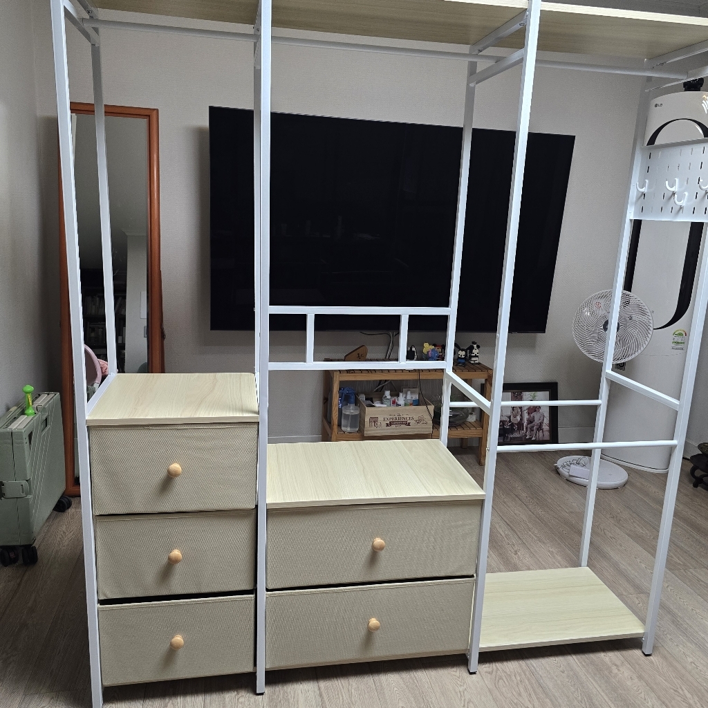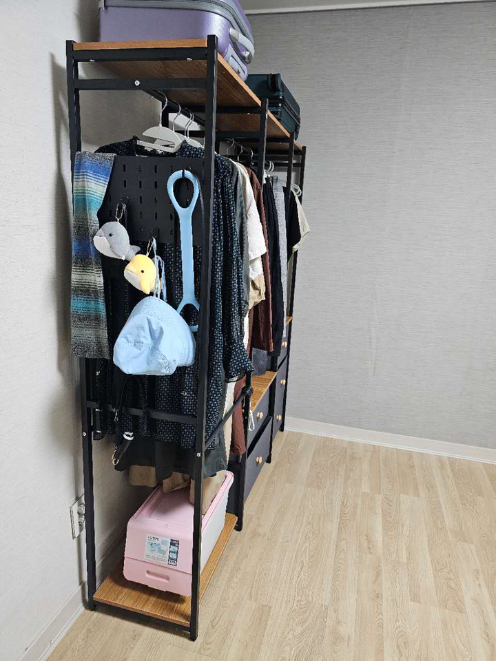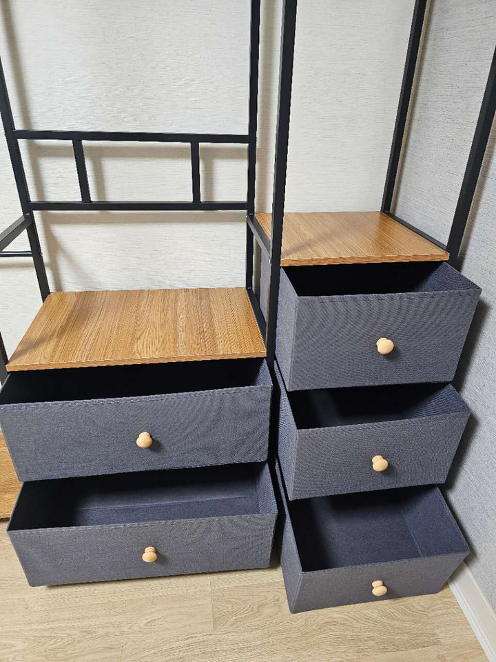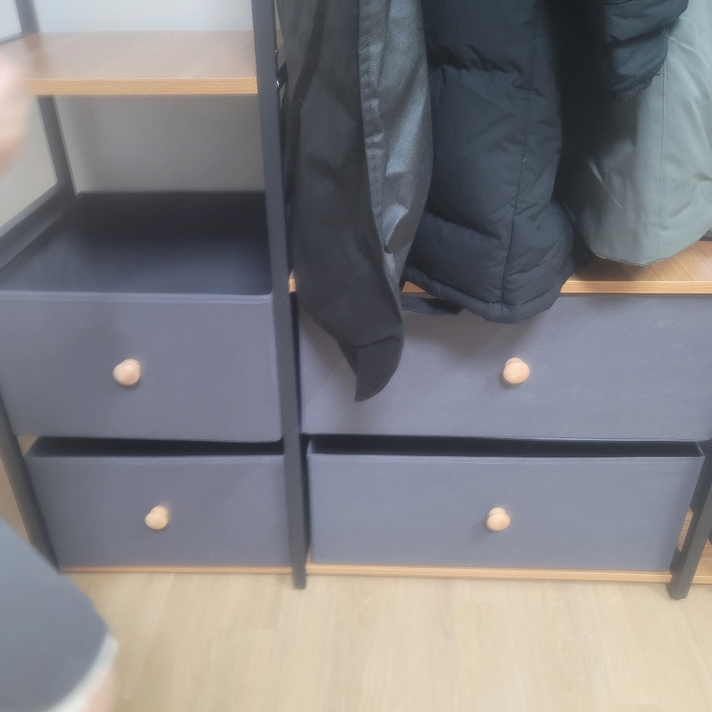 특히 마음에 드는 점은 옆면에 타공판이 있어서 자잘한 액세서리나 가방을 걸 수 있다는 거예요. 원래는 이런 자잘한 것들을 어디에 둬야 할지 늘 고민이었는데, 이제는 깔끔하게 정리할 수 있어서 너무 좋아요. 또한 서랍형 수납도 굉장히 편리합니다. 서랍이 원목이 아니라 부직포 소재라서 가격 부담은 줄이면서도 사용에는 전혀 지장이 없어요. 오히려 가볍고 실용적이라 만족스럽습니다.