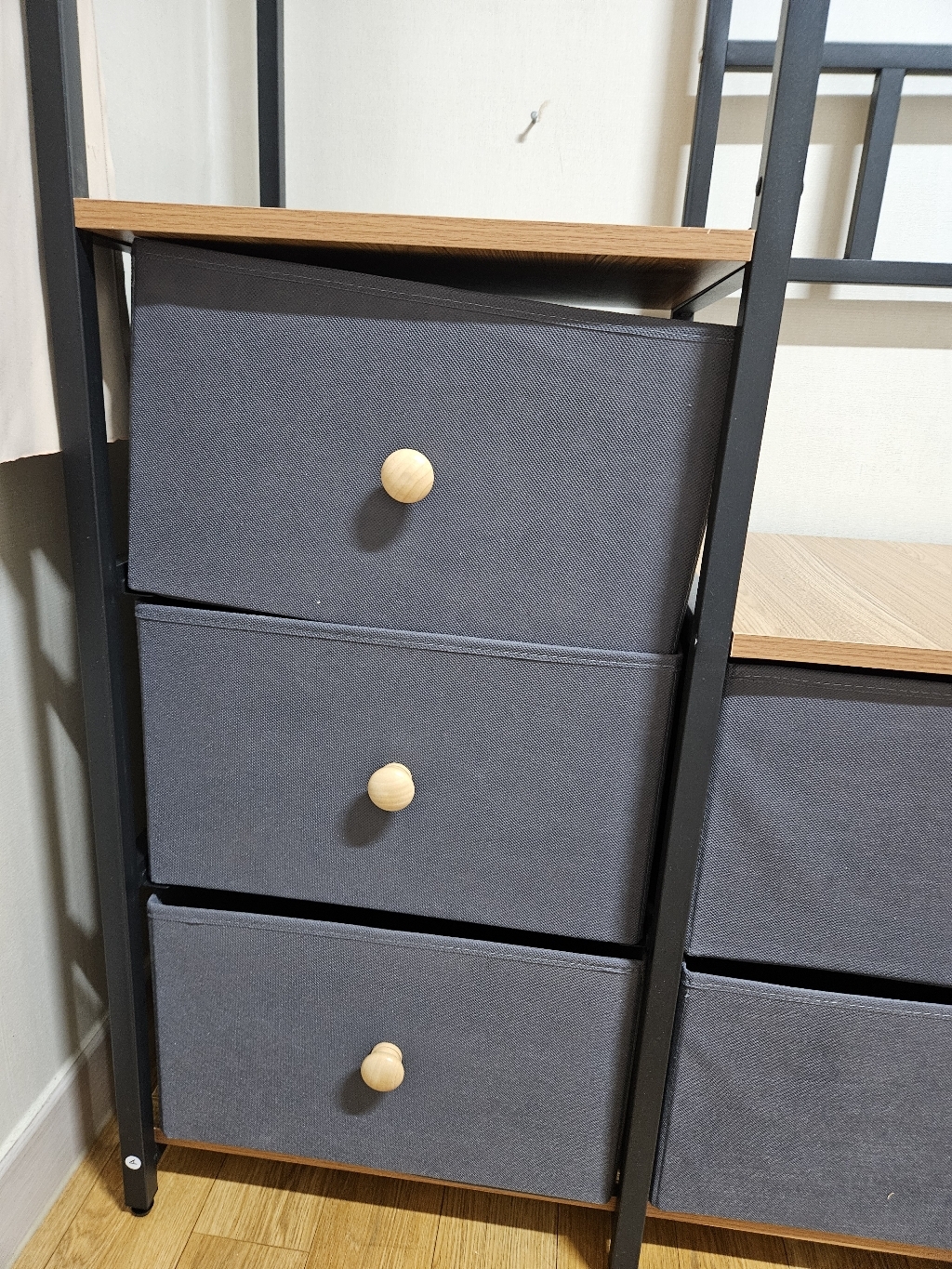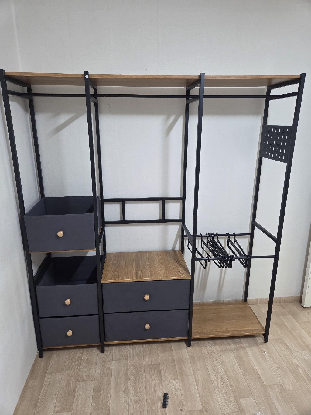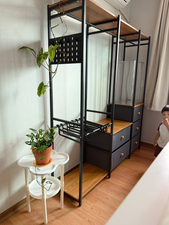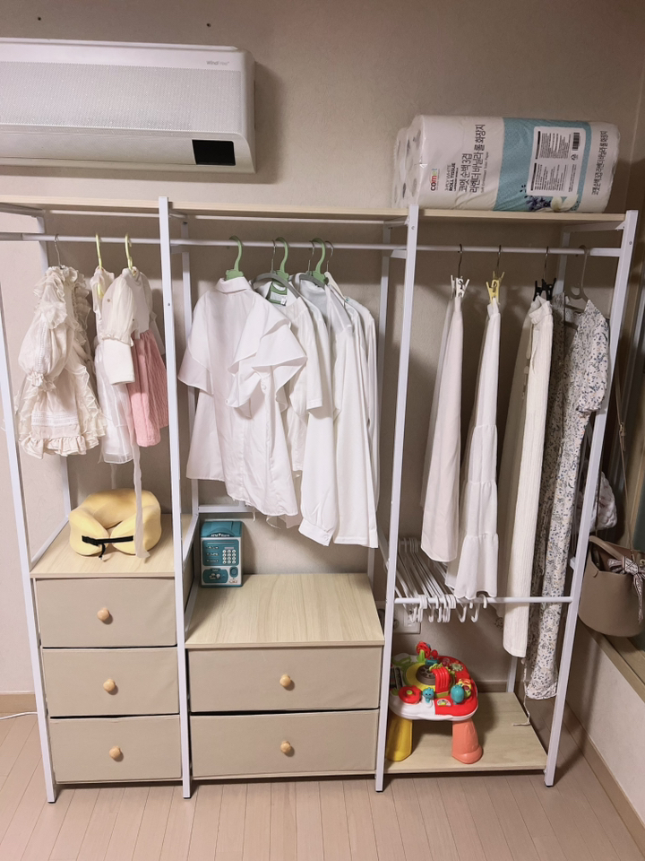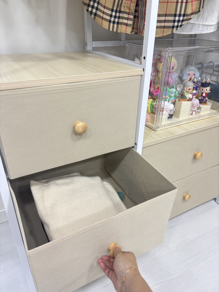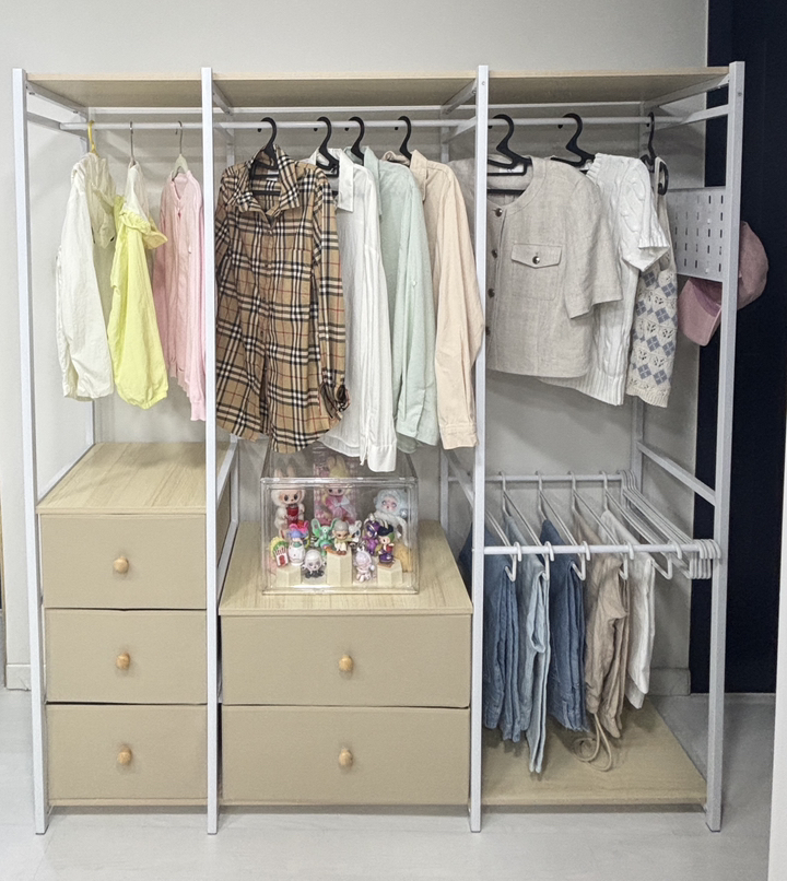 특히 마음에 드는 점은 옆면에 타공판이 있어서 자잘한 액세서리나 가방을 걸 수 있다는 거예요. 원래는 이런 자잘한 것들을 어디에 둬야 할지 늘 고민이었는데, 이제는 깔끔하게 정리할 수 있어서 너무 좋아요. 또한 서랍형 수납도 굉장히 편리합니다. 서랍이 원목이 아니라 부직포 소재라서 가격 부담은 줄이면서도 사용에는 전혀 지장이 없어요. 오히려 가볍고 실용적이라 만족스럽습니다.