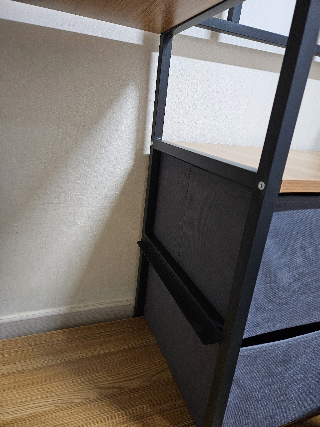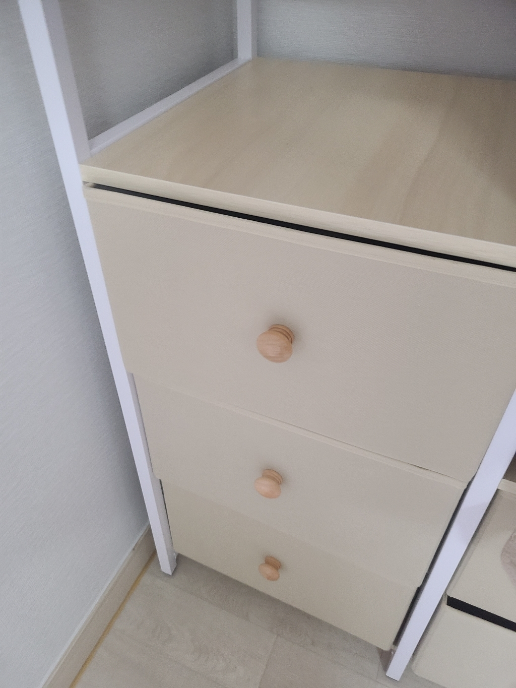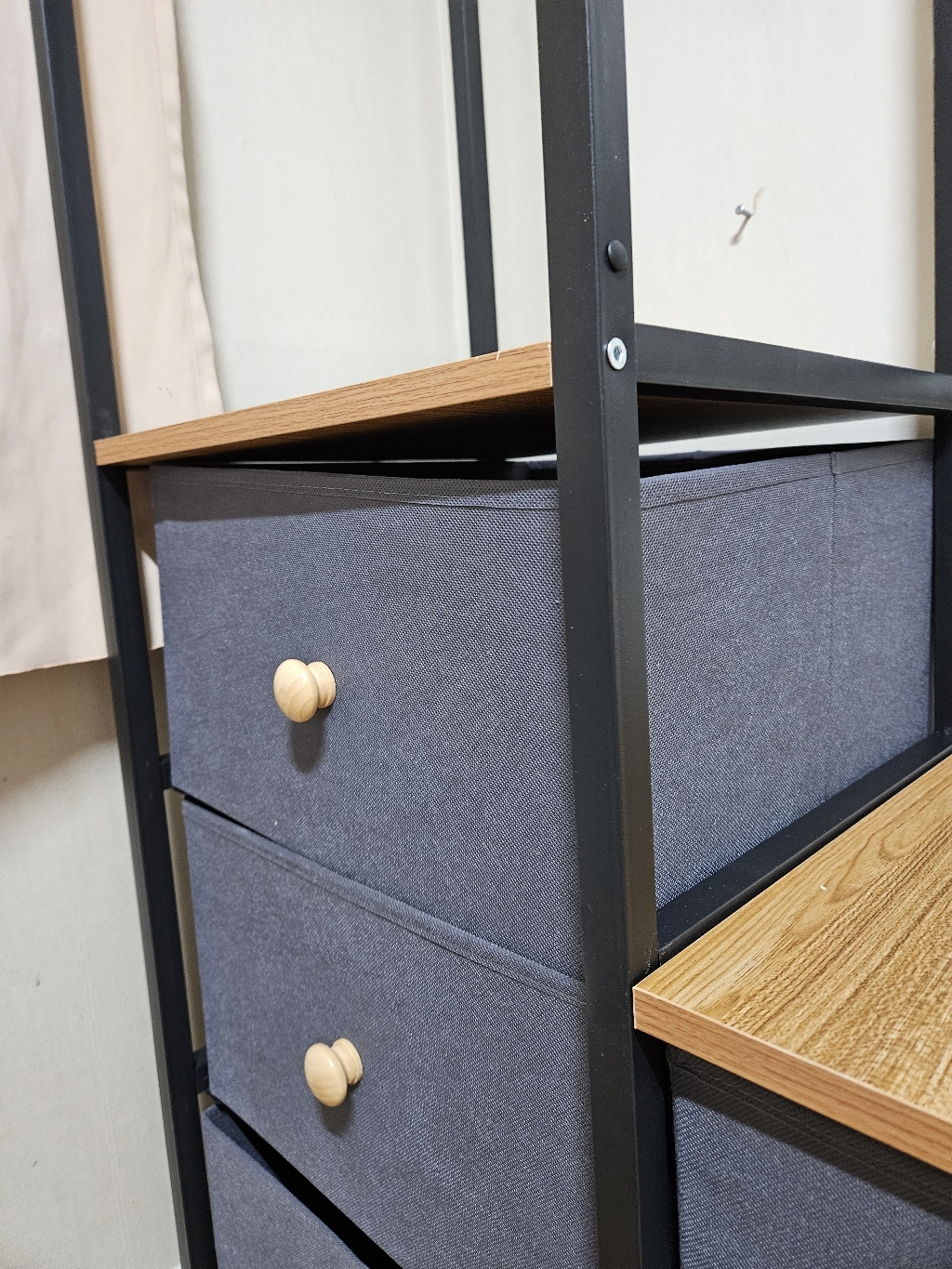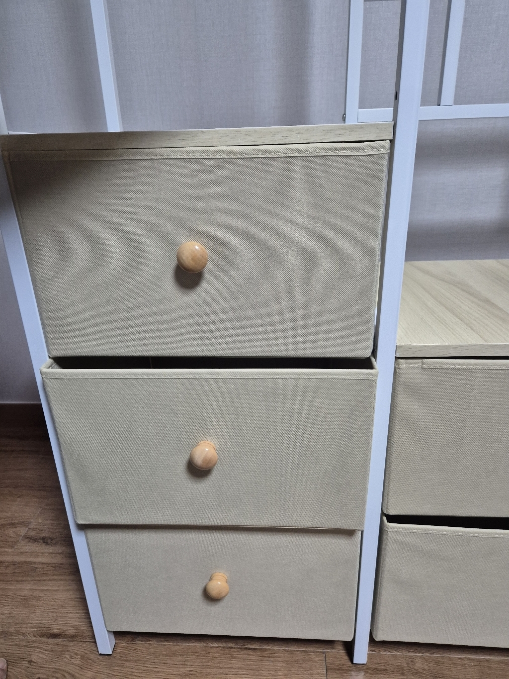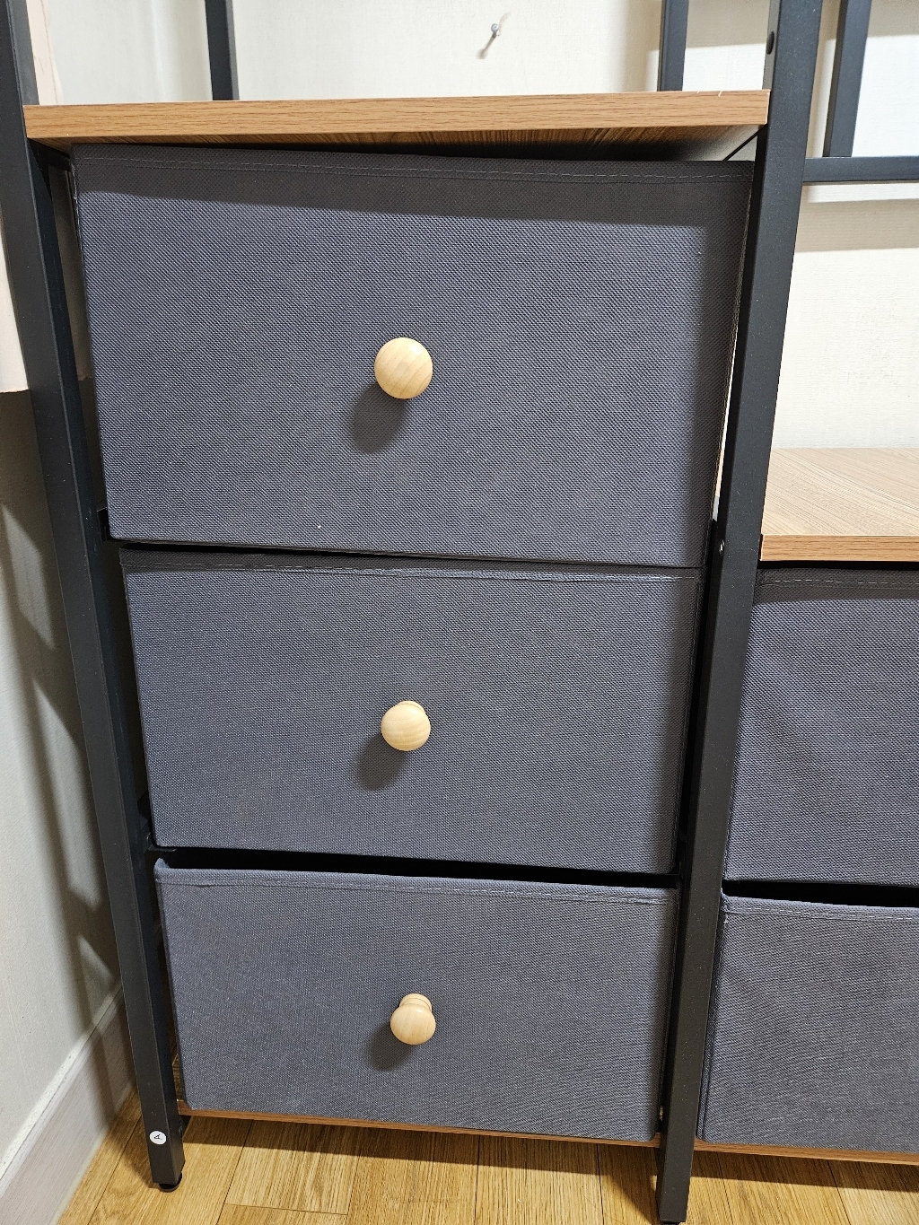 특히 마음에 드는 점은 옆면에 타공판이 있어서 자잘한 액세서리나 가방을 걸 수 있다는 거예요. 원래는 이런 자잘한 것들을 어디에 둬야 할지 늘 고민이었는데, 이제는 깔끔하게 정리할 수 있어서 너무 좋아요. 또한 서랍형 수납도 굉장히 편리합니다. 서랍이 원목이 아니라 부직포 소재라서 가격 부담은 줄이면서도 사용에는 전혀 지장이 없어요. 오히려 가볍고 실용적이라 만족스럽습니다.