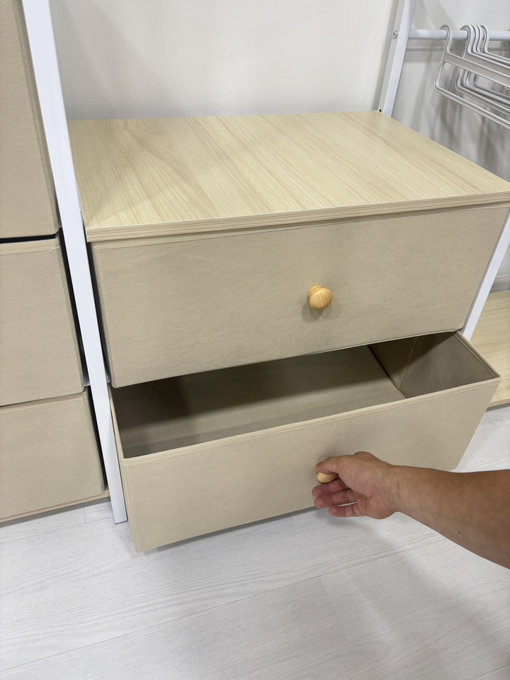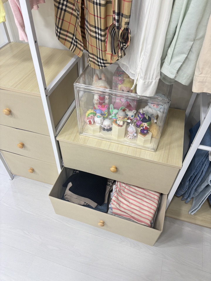 중간 및 하단 서랍: 외부로 노출되면 지저분해 보이기 쉬운 속옷, 양말, 가벼운 티셔츠 등을 수납할 수 있는 서랍형 구조가 포함되어 있습니다. 이는 별도의 수납함을 구매할 필요를 없애주어 경제적입니다.
