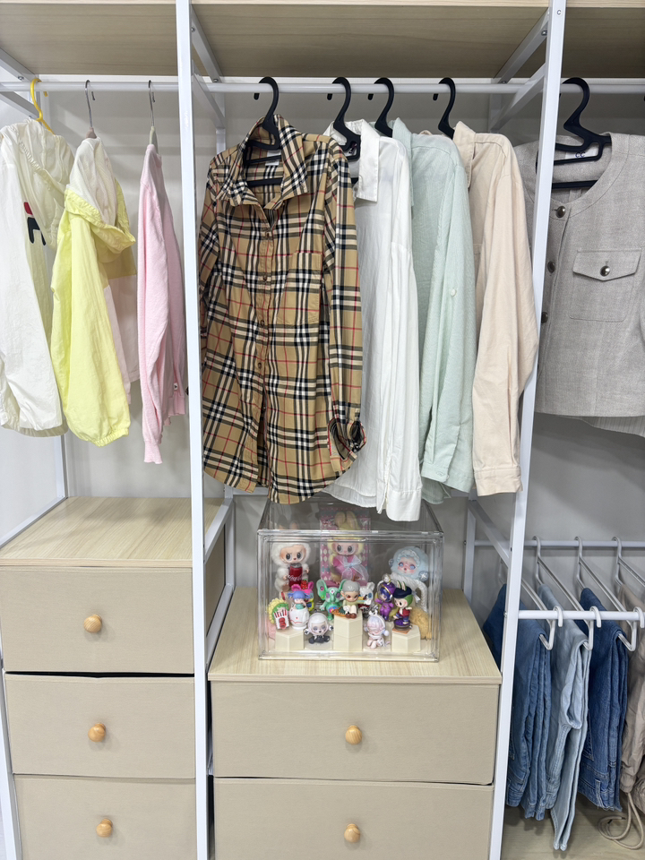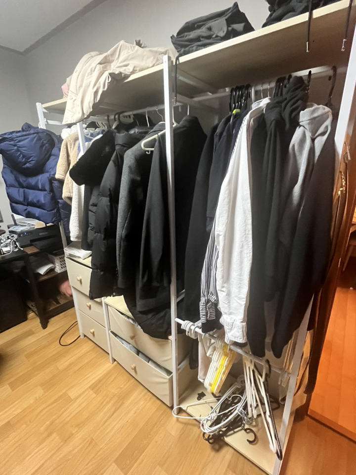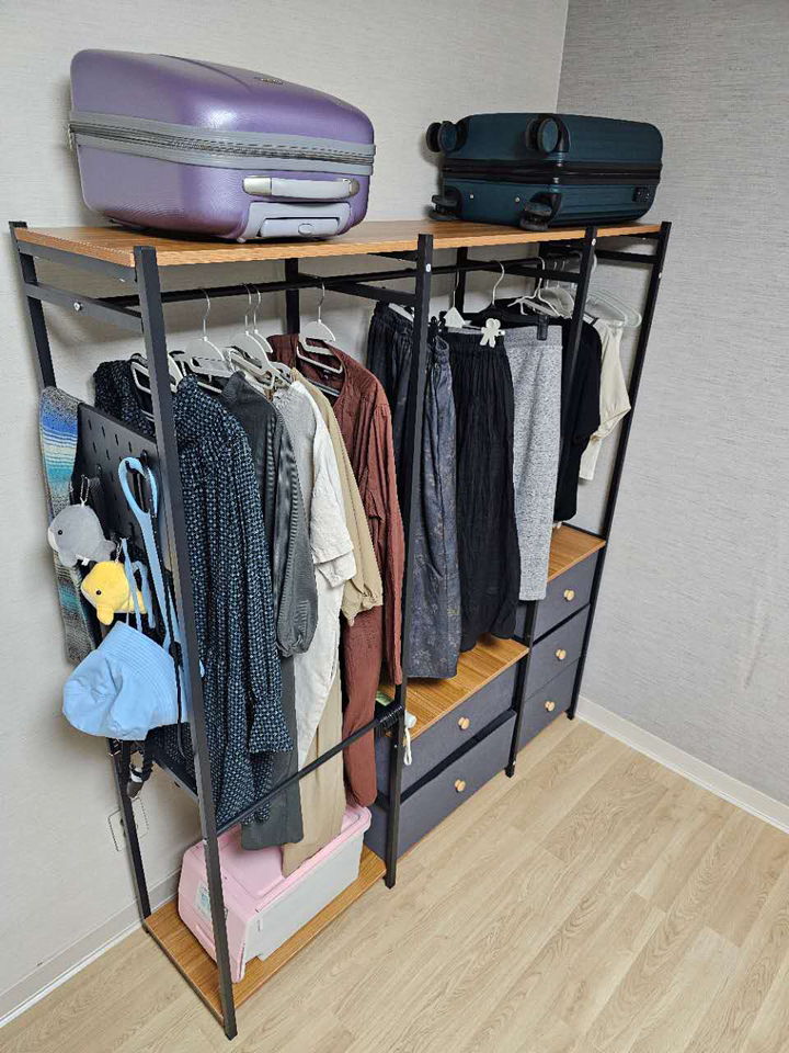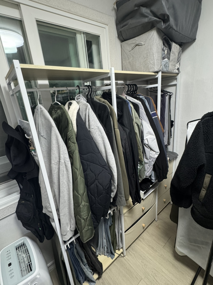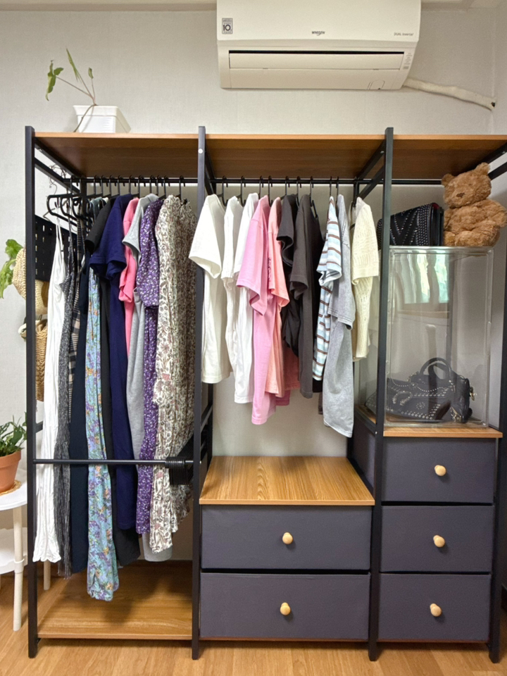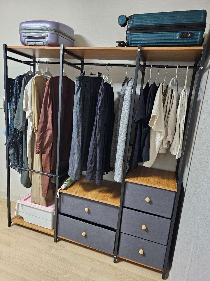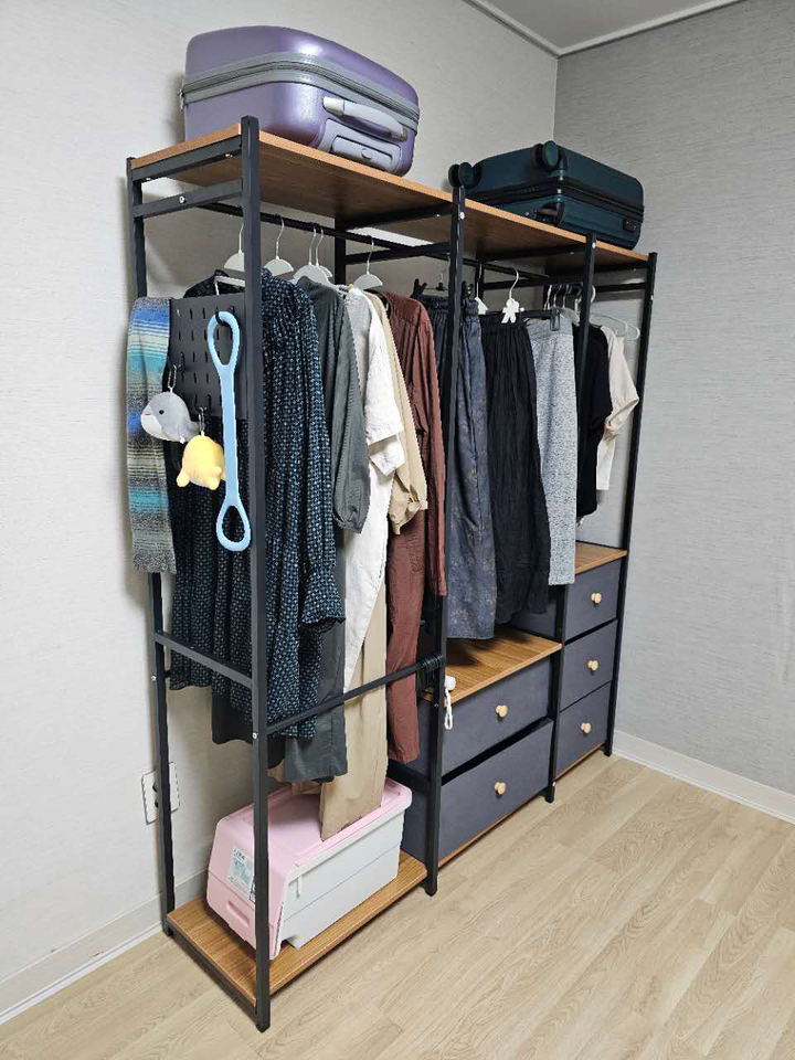 기존 옷장은 공간도 애매하고 서랍도 작아서 항상 꽉 차 있었는데, 이번엔 확장형이라 그런지 공간 활용이 훨씬 여유롭습니다.