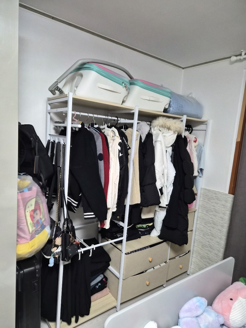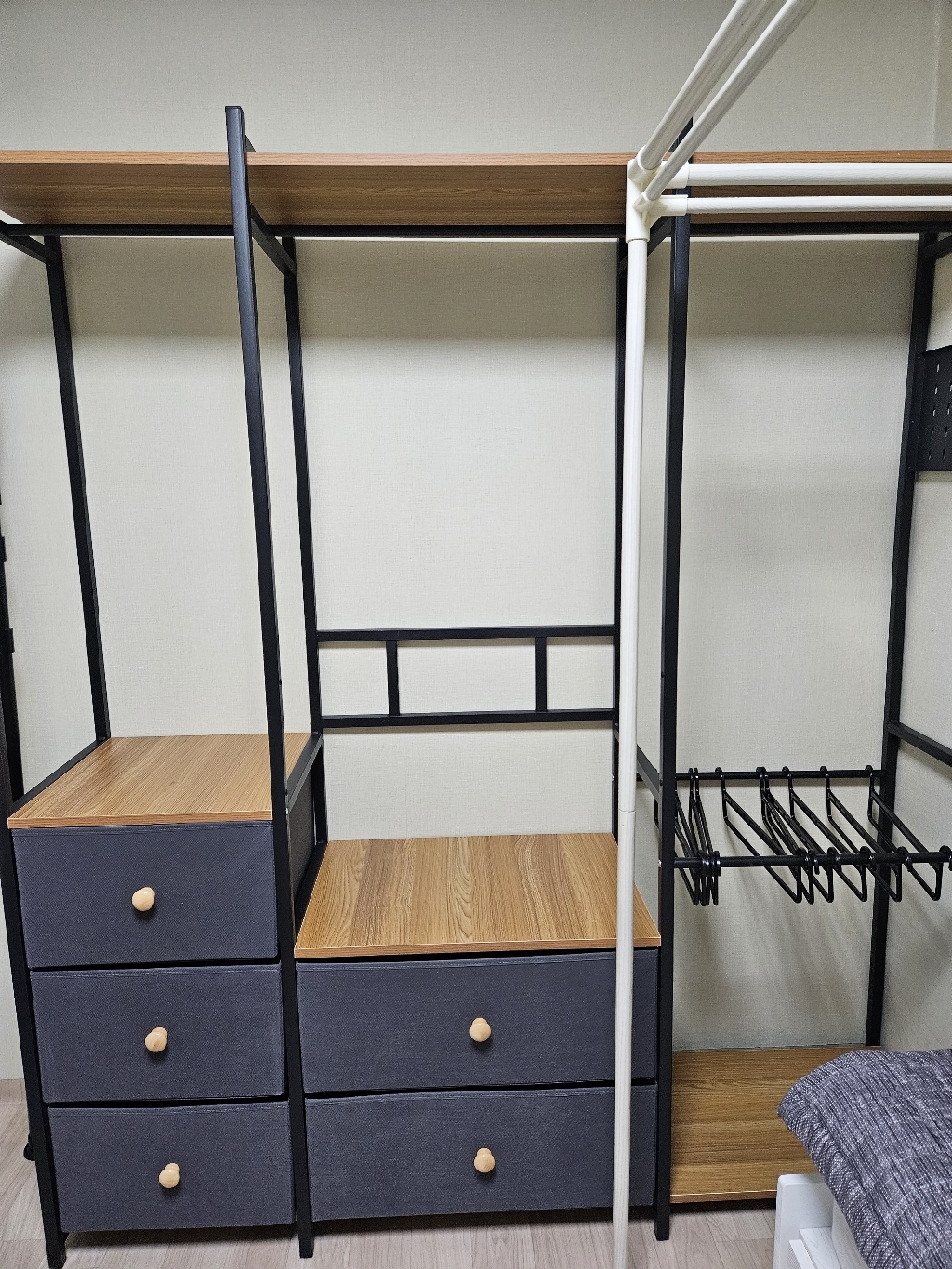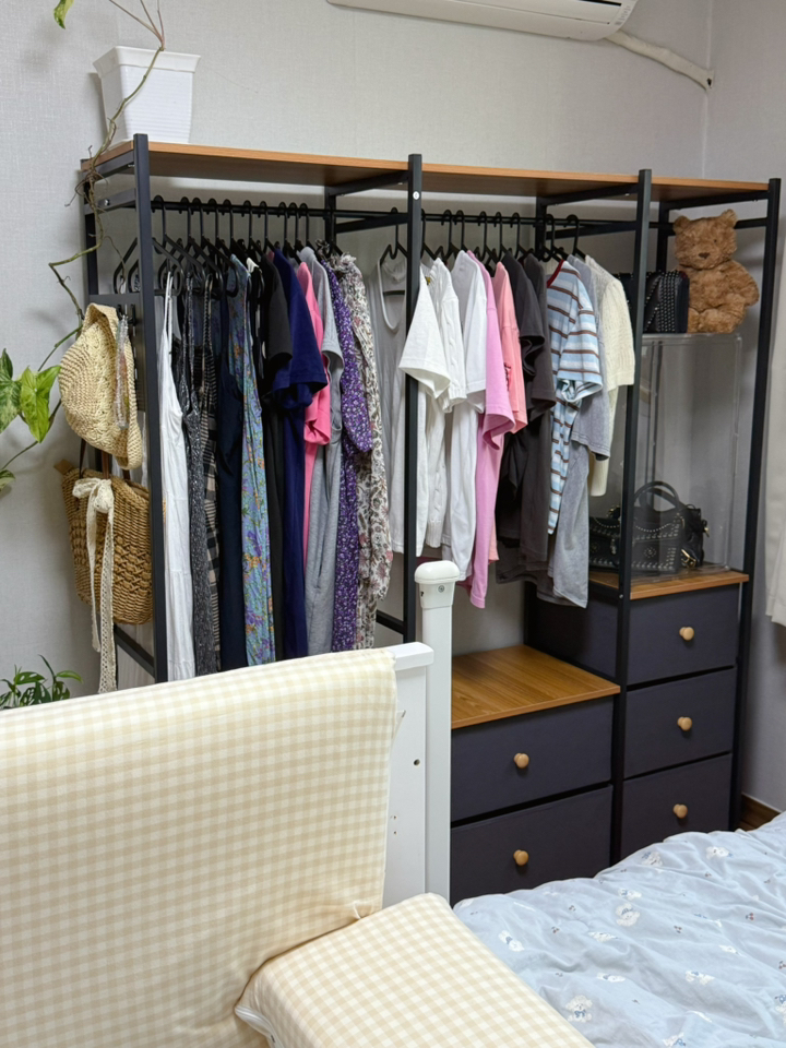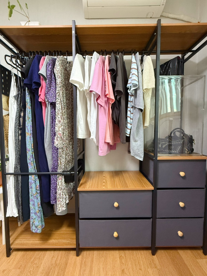 • [수납력 ] 옷걸이 공간도 넉넉하고, 서랍까지 있어서 속옷/양말/티셔츠까지 싹 정리 가능! 방이 훨씬 깔끔해졌어요~