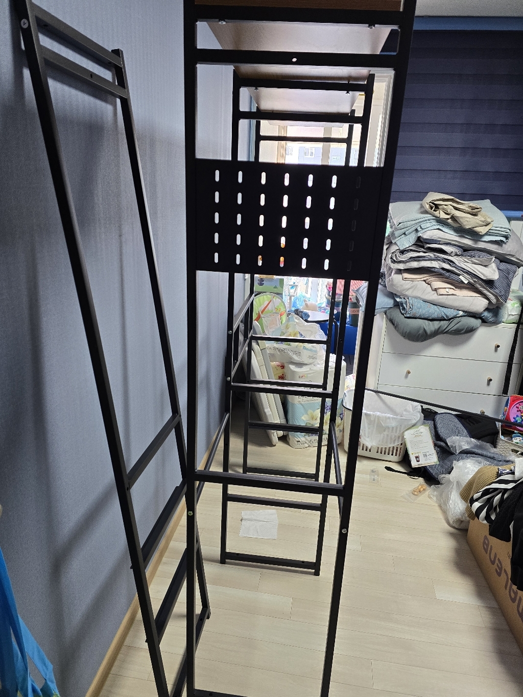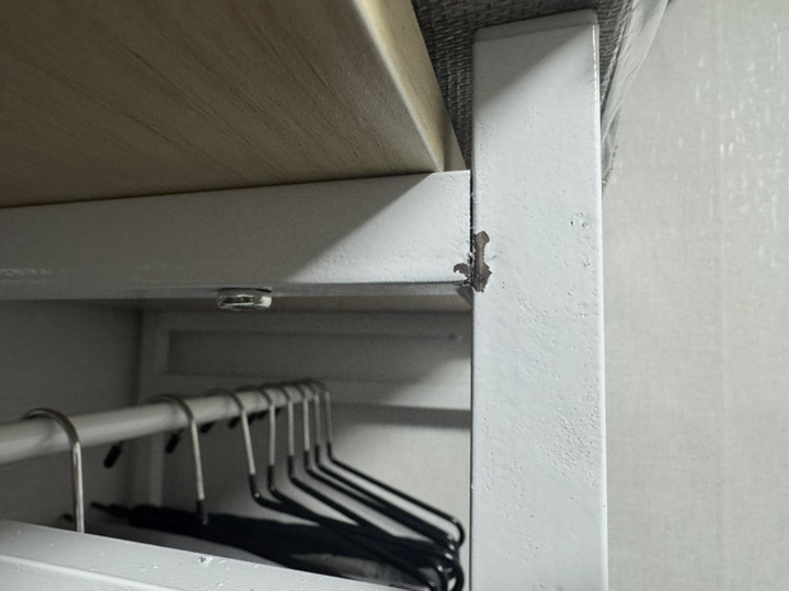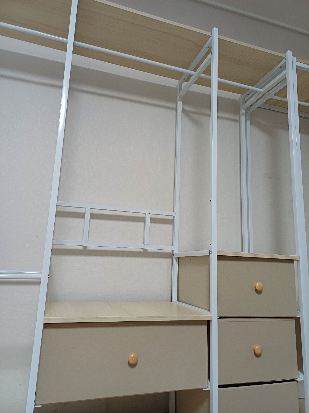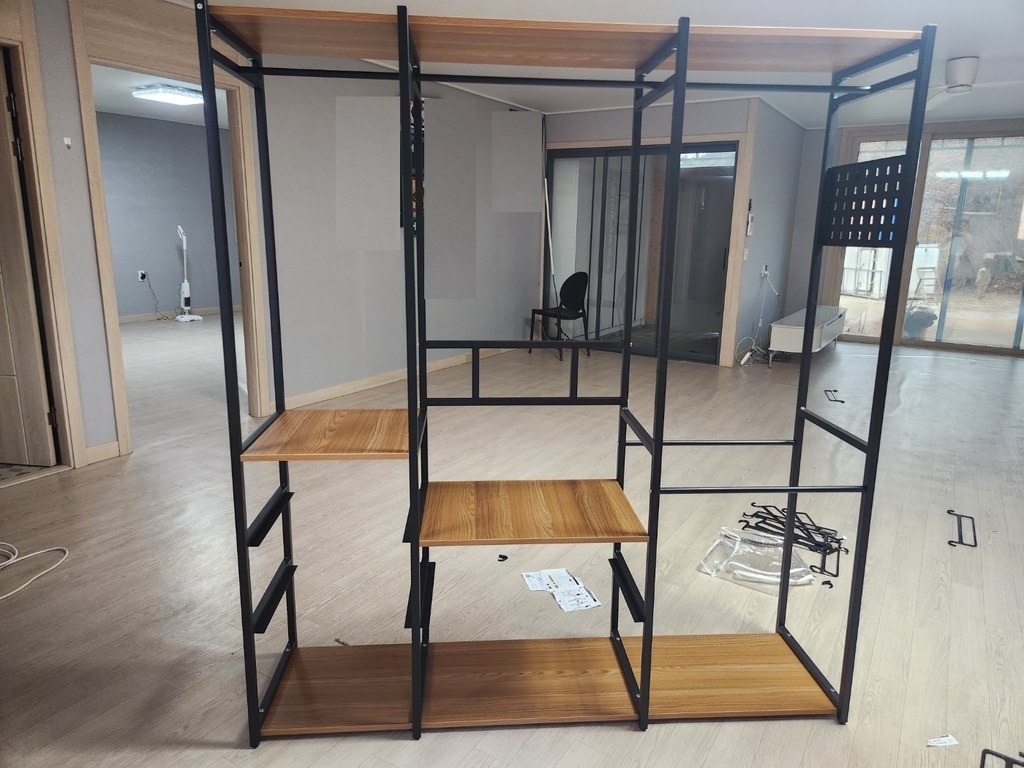 조립은 전체적으로 어렵지 않았지만, 후기에서 봤던 것처럼 저도 한 번 잘못 조립해서 다시 분해하고 재조립해야 했어요. 처음에 프레임 방향을 잘못 맞추면 나중에 선반이나 행거 봉 위치가 맞지 않을 수 있어서 설명서를 보면서 천천히 하는 게 중요합니다. 두 번째 조립할 때는 훨씬 수월했고, 고정 나사들도 흔들림 없게 잘 맞아 들어가서 안정감 있게 완성됐습니다.