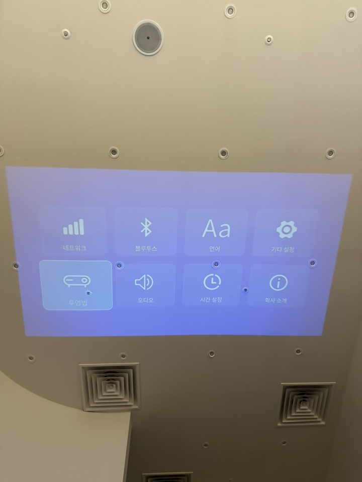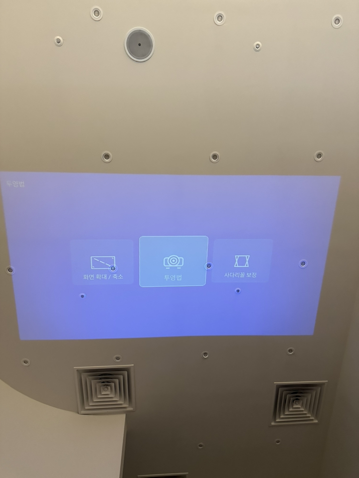 -책상위에 두고 천장에 쏘니 거리가 가까워 체감 사이즈가 태블릿보다 약간 큰 정도의 느낌임.