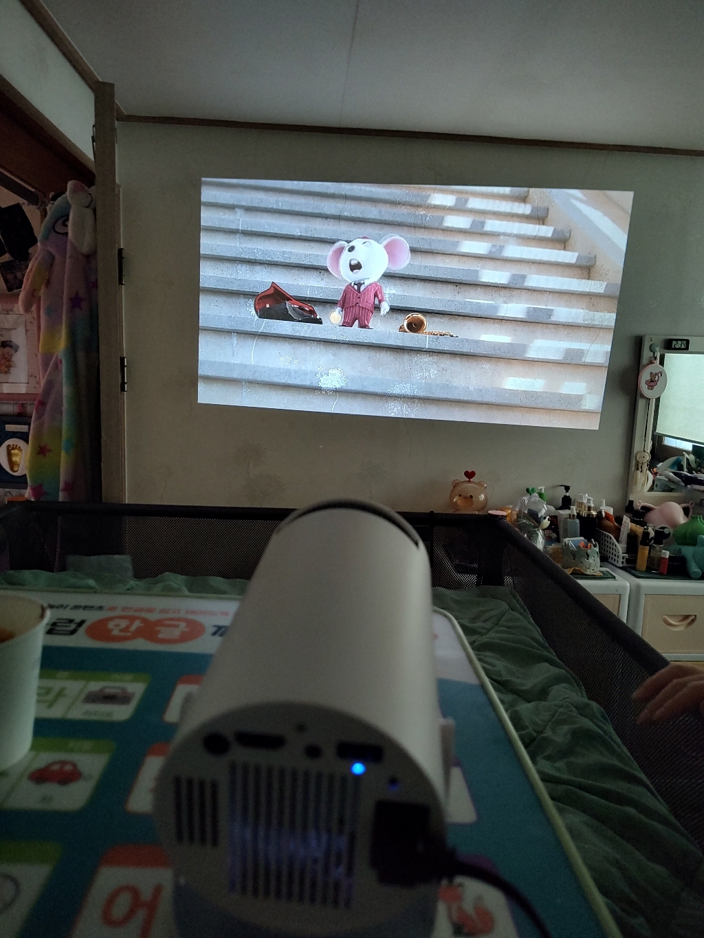 미친 가성비: 720P 해상도라 걱정했는데, 막눈인 내가 보기엔 꽤 선명하다. 200 안시 루멘이라 불 끄고 암막 커튼 치면 방구석 영화관 충분히 가능하다. 가격 생각하면 화질은 기대 이상이다.