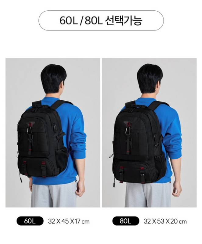 필요에 따라 60L → 80L로 확장할 수 있는 구조 덕분에 ‘짐이 적을 때는 가볍게, 짐이 많을 때는 많이 담는’ 유연한 사용이 가능합니다.