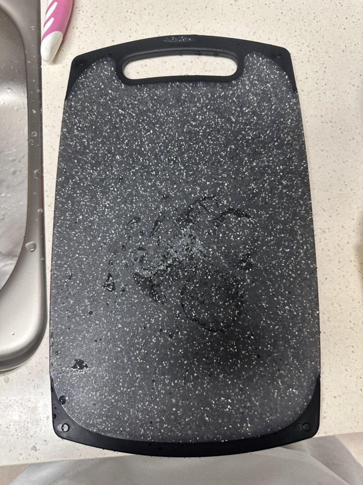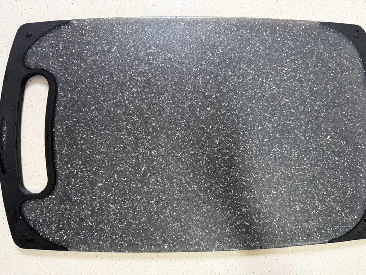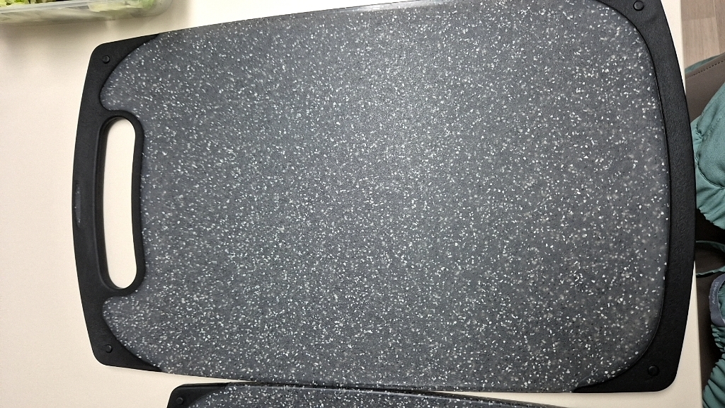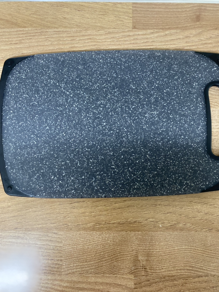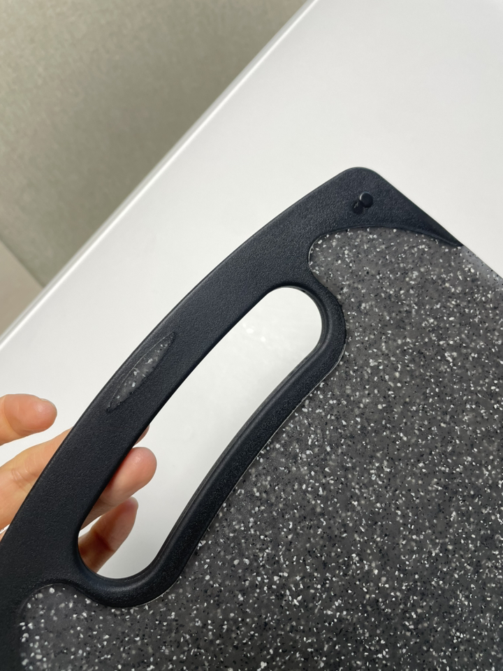 사용해보니 표면이 매끈하고 재질이 단단해서 일반 플라스틱 도마보다 확실히 칼이 덜 박히는 느낌이 있어요. 야채나 과일처럼 가벼운 재료를 썰 때는 거의 표면이 그대로 유지되더라고요. 물에 헹굴 때도 음식물이 잘 달라붙지 않아 세척이 간편했고, 냄새 배임도 적어서 깔끔하게 관리할 수 있었어요. 양면 사용이 가능하다 보니 생선이나 고기 작업은 한쪽 면, 채소 작업은 다른 면 이런 식으로 나눠 쓰기 편해요.