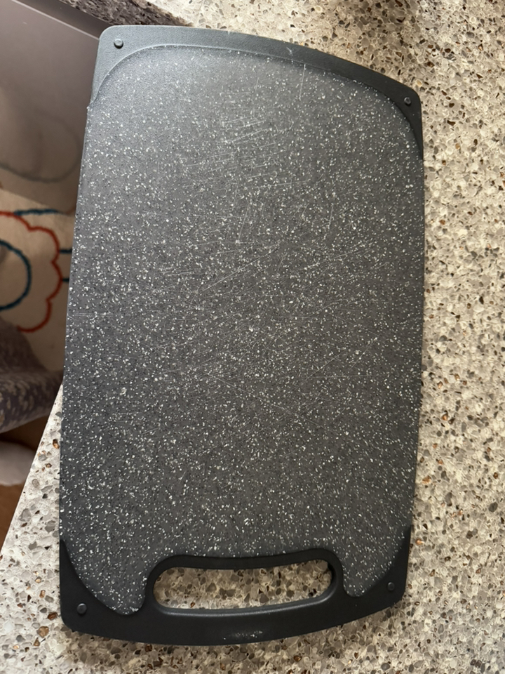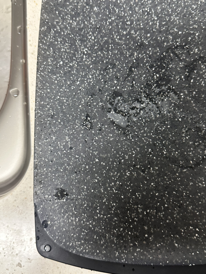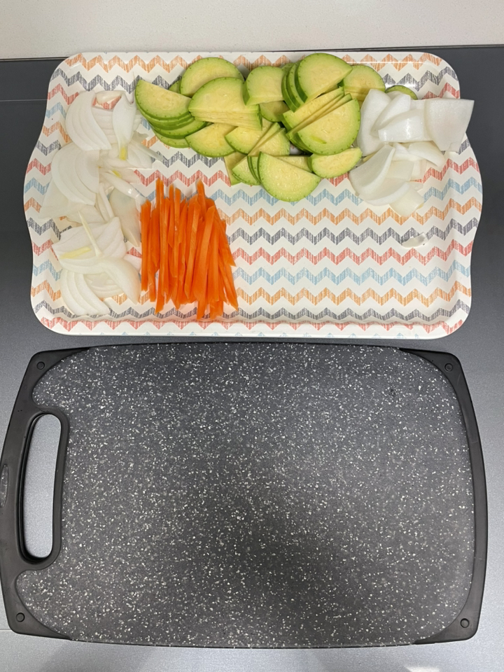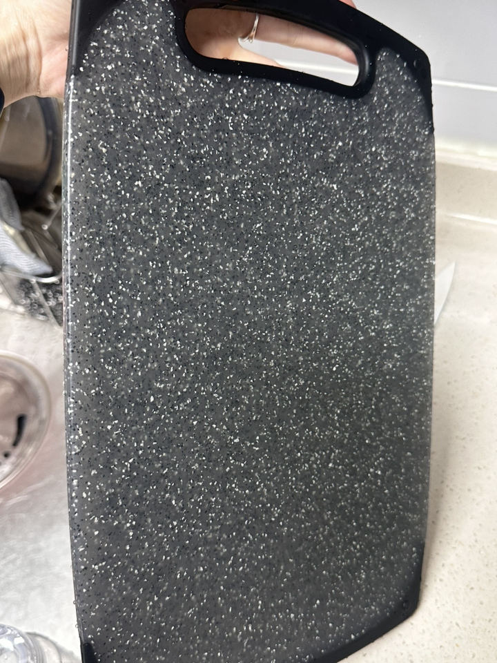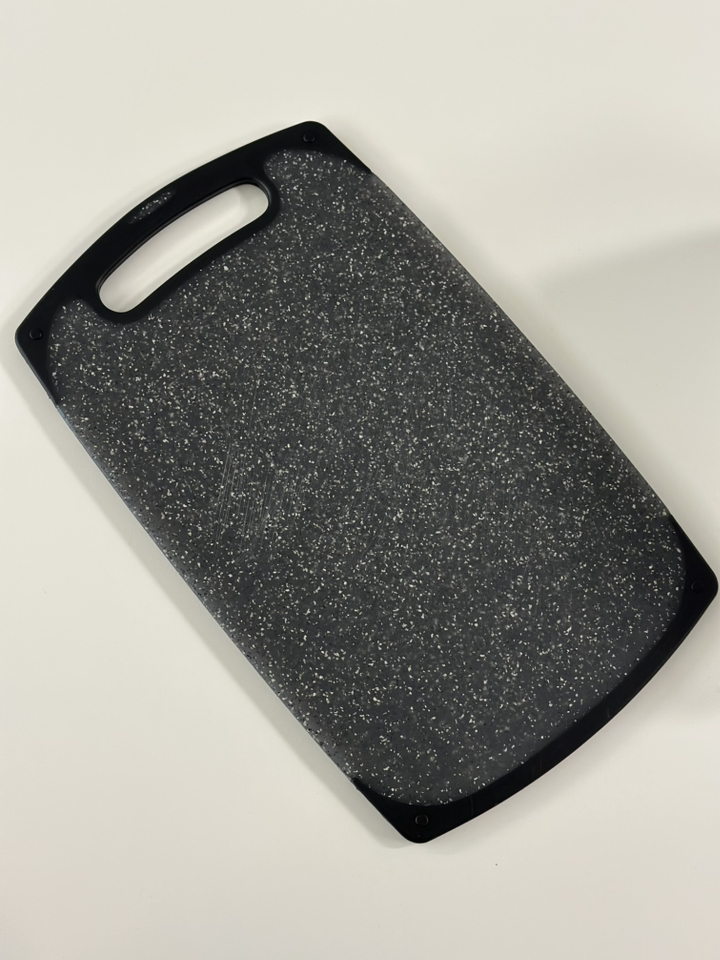 사용해보니 표면이 매끈하고 재질이 단단해서 일반 플라스틱 도마보다 확실히 칼이 덜 박히는 느낌이 있어요. 야채나 과일처럼 가벼운 재료를 썰 때는 거의 표면이 그대로 유지되더라고요. 물에 헹굴 때도 음식물이 잘 달라붙지 않아 세척이 간편했고, 냄새 배임도 적어서 깔끔하게 관리할 수 있었어요. 양면 사용이 가능하다 보니 생선이나 고기 작업은 한쪽 면, 채소 작업은 다른 면 이런 식으로 나눠 쓰기 편해요.
