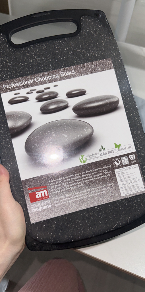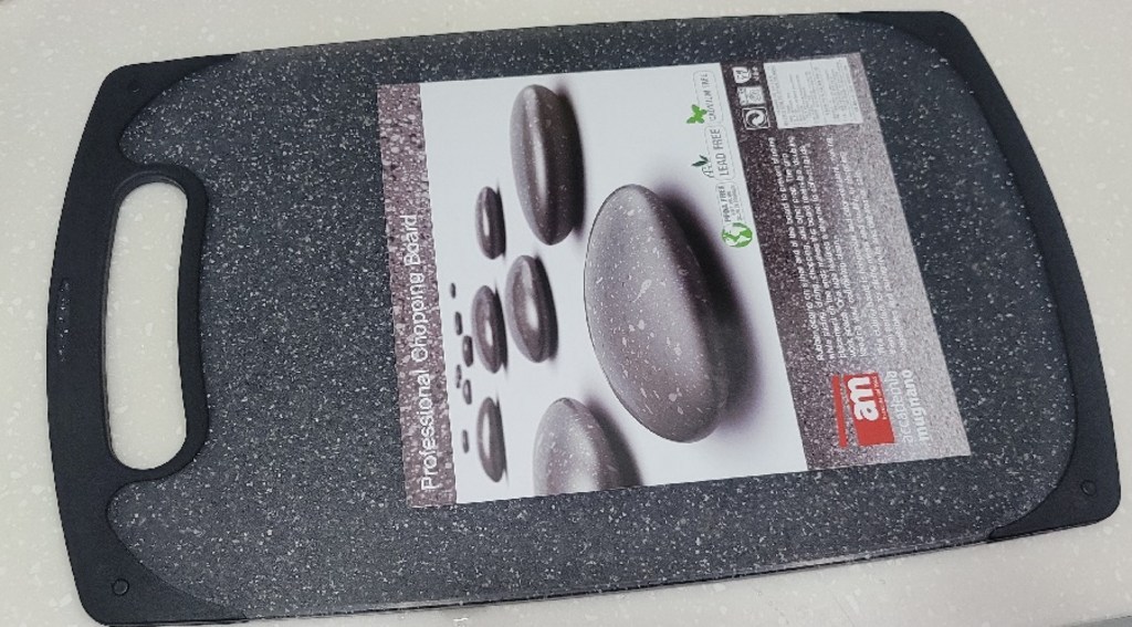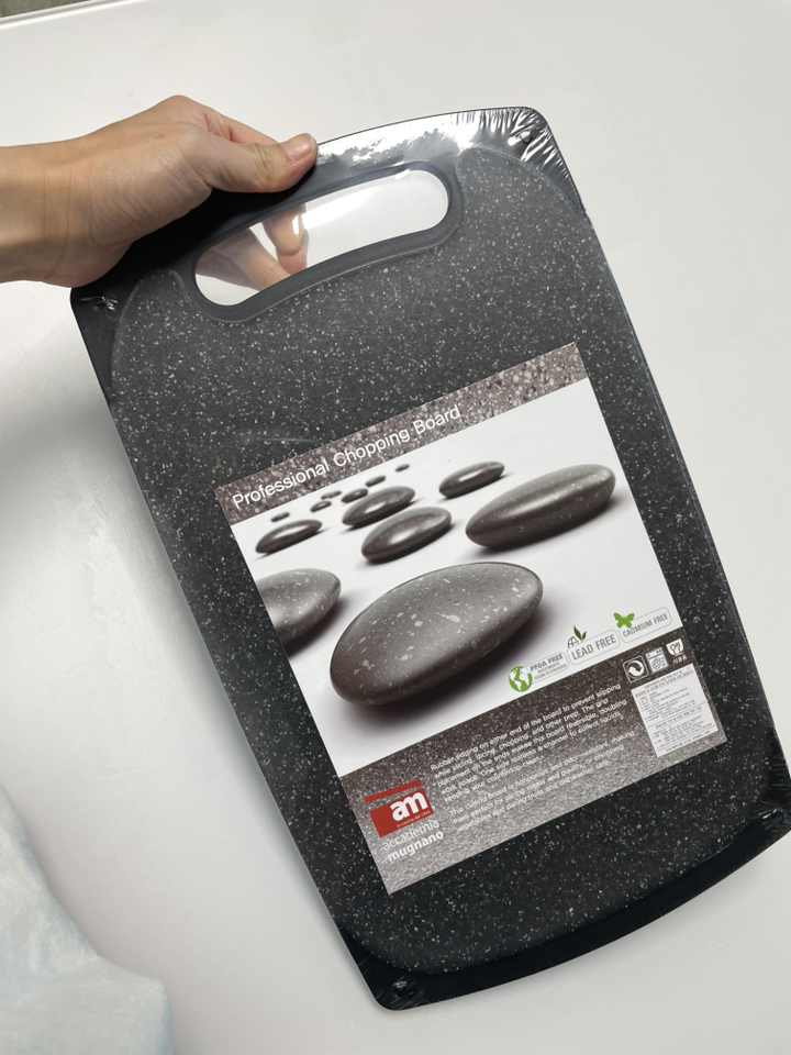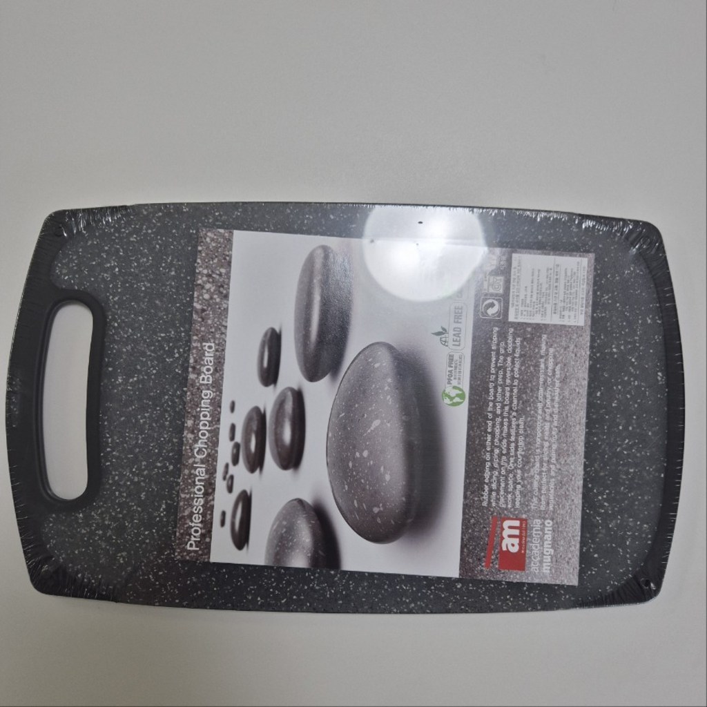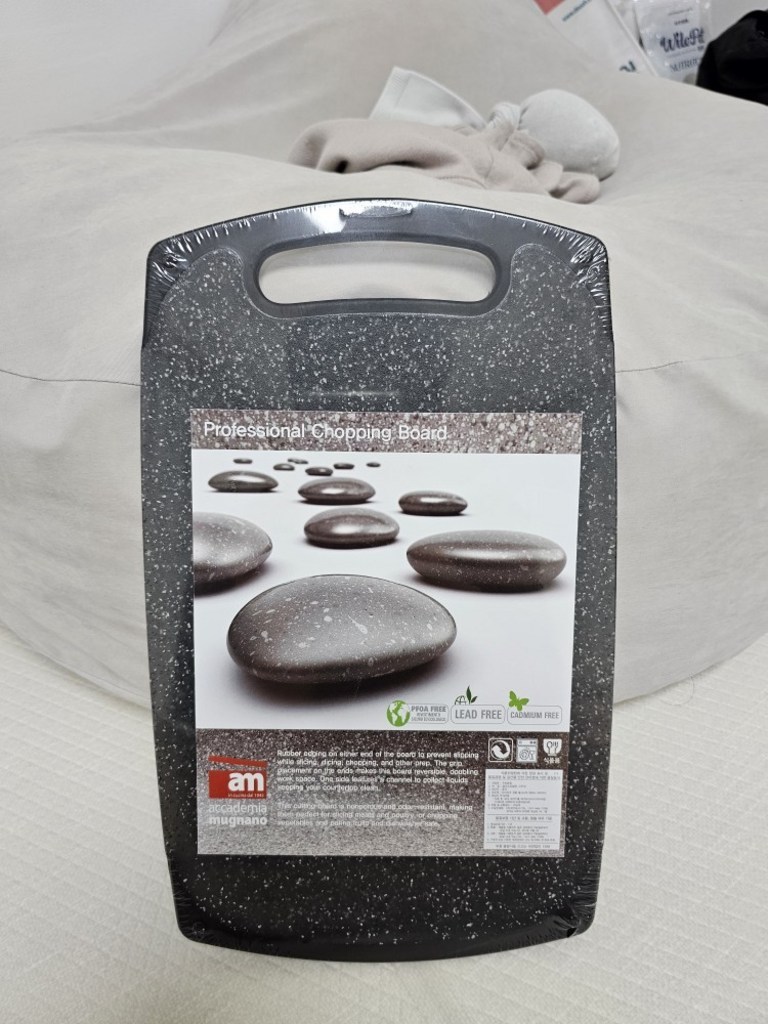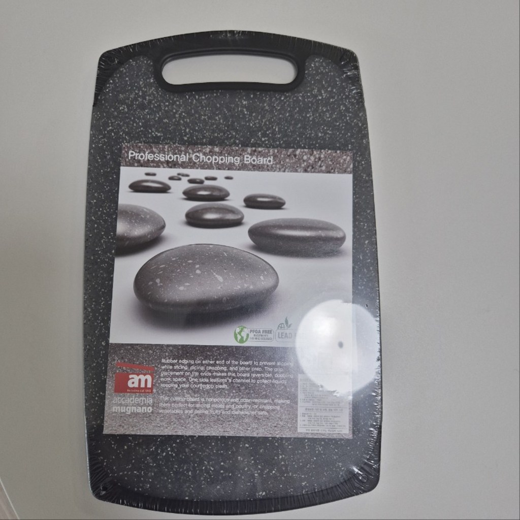기존에 쓰던 도마가 칼집이 너무 많이 생겨서 위생적인 도마를 찾다가, 깔끔하고 환경 호르몬 걱정이 없는 AM 이탈리아 제품으로 선택했습니다. ‘스톤 양면 도마’라는 이름처럼 일반 플라스틱 도마와 달리 조약돌 같은 고급스러운 표면 질감이 주방 분위기를 확 살려줍니다. 혼합색상이라 색감이 은은하고 세련된 느낌이 마음에 들었습니다.