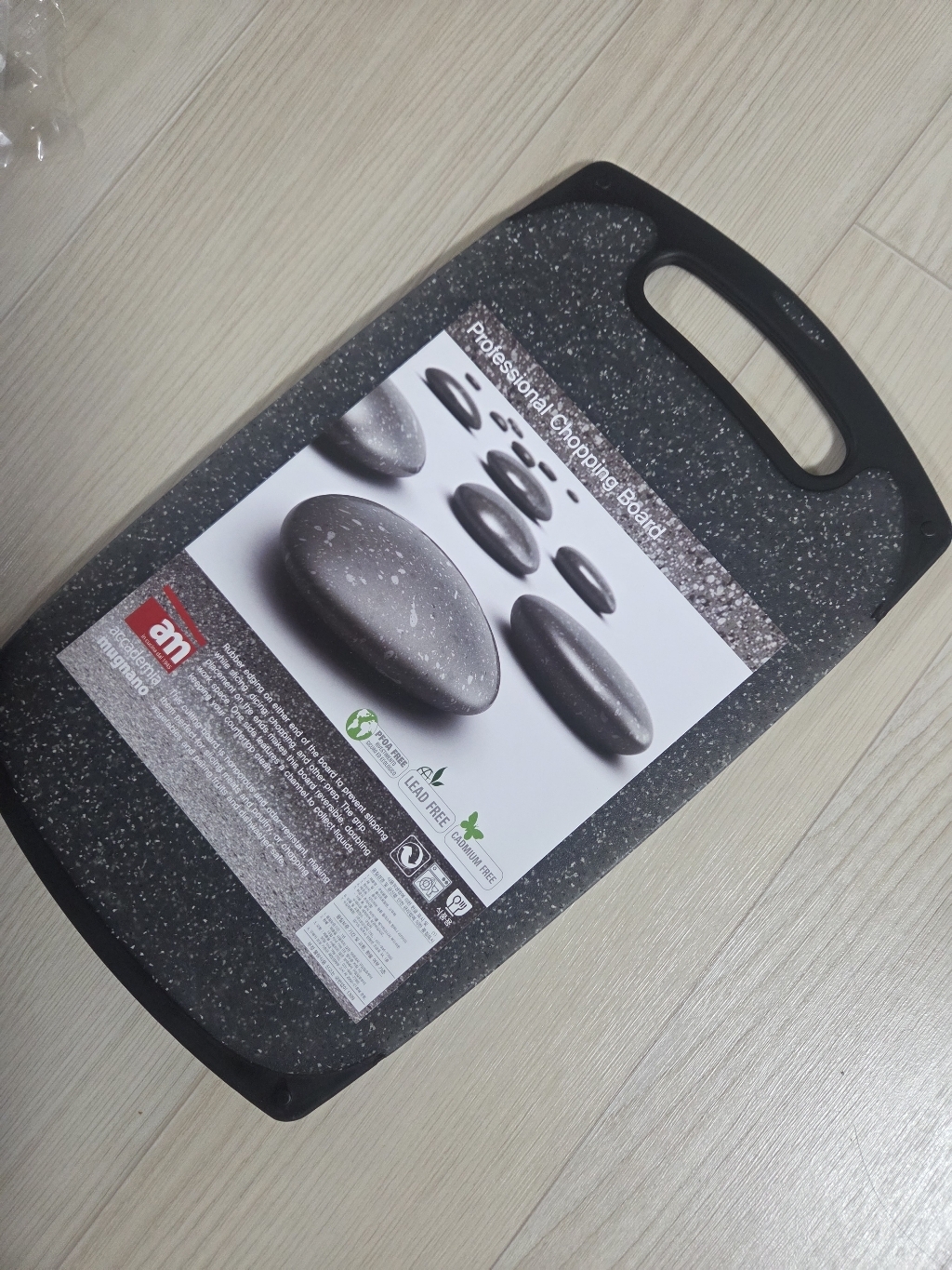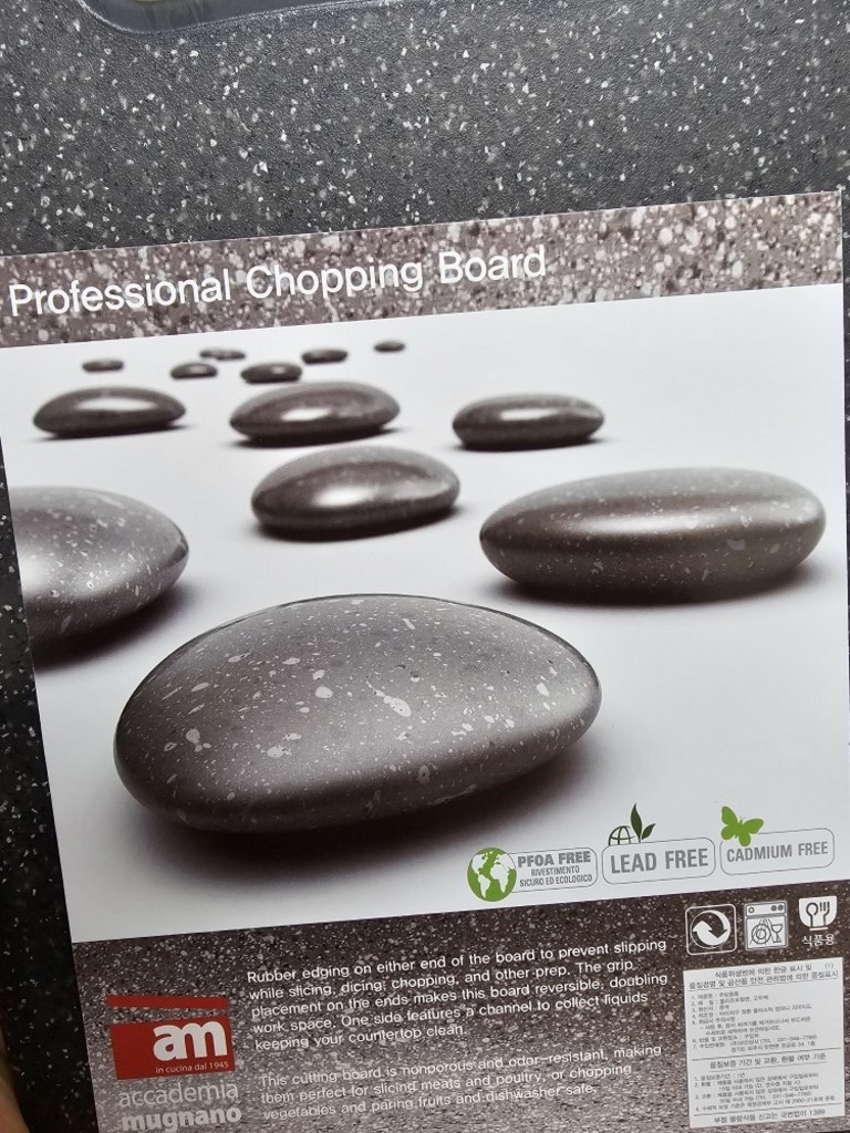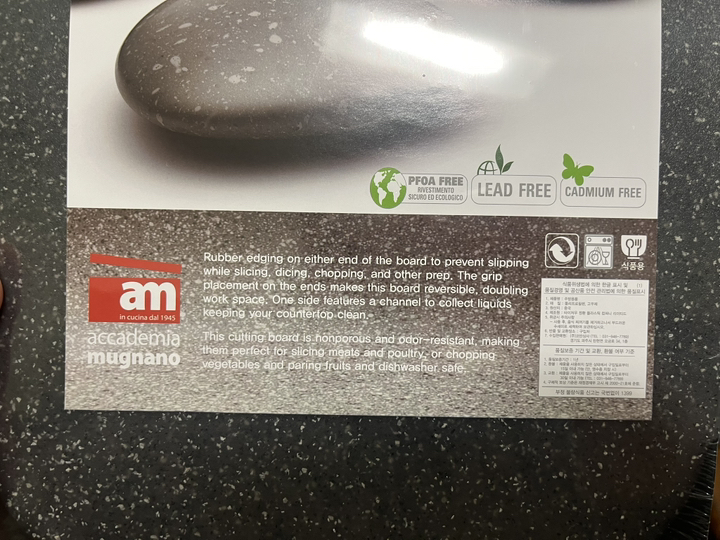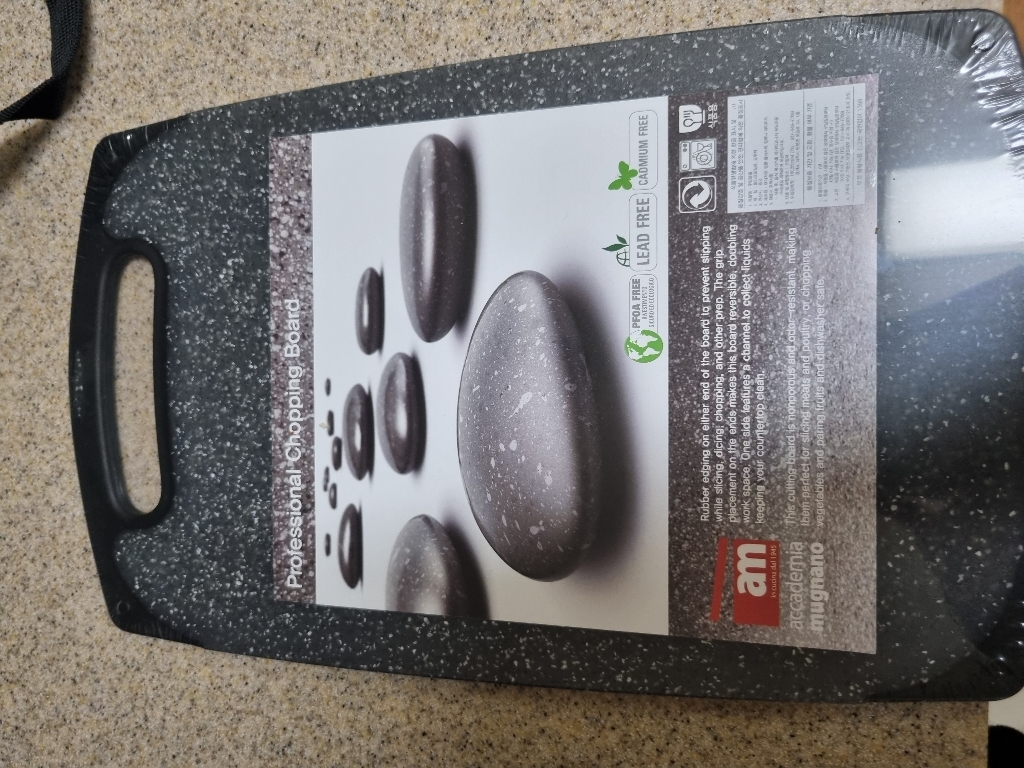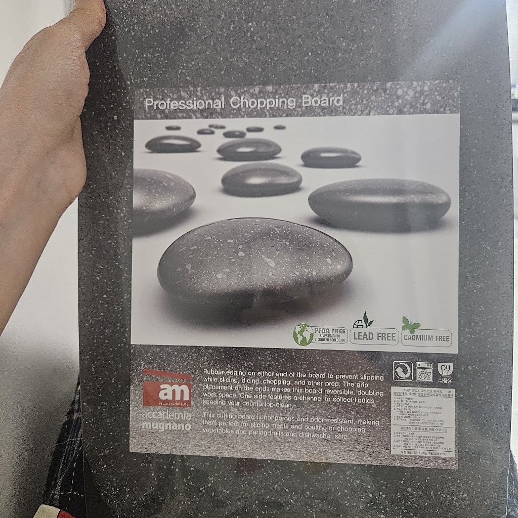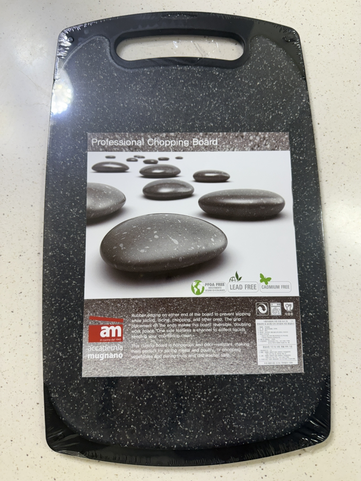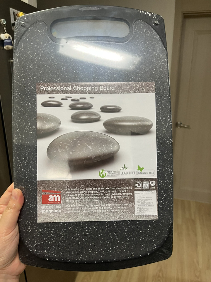 기존에 쓰던 도마가 칼집이 너무 많이 생겨서 위생적인 도마를 찾다가, 깔끔하고 환경 호르몬 걱정이 없는 AM 이탈리아 제품으로 선택했습니다. ‘스톤 양면 도마’라는 이름처럼 일반 플라스틱 도마와 달리 조약돌 같은 고급스러운 표면 질감이 주방 분위기를 확 살려줍니다. 혼합색상이라 색감이 은은하고 세련된 느낌이 마음에 들었습니다.