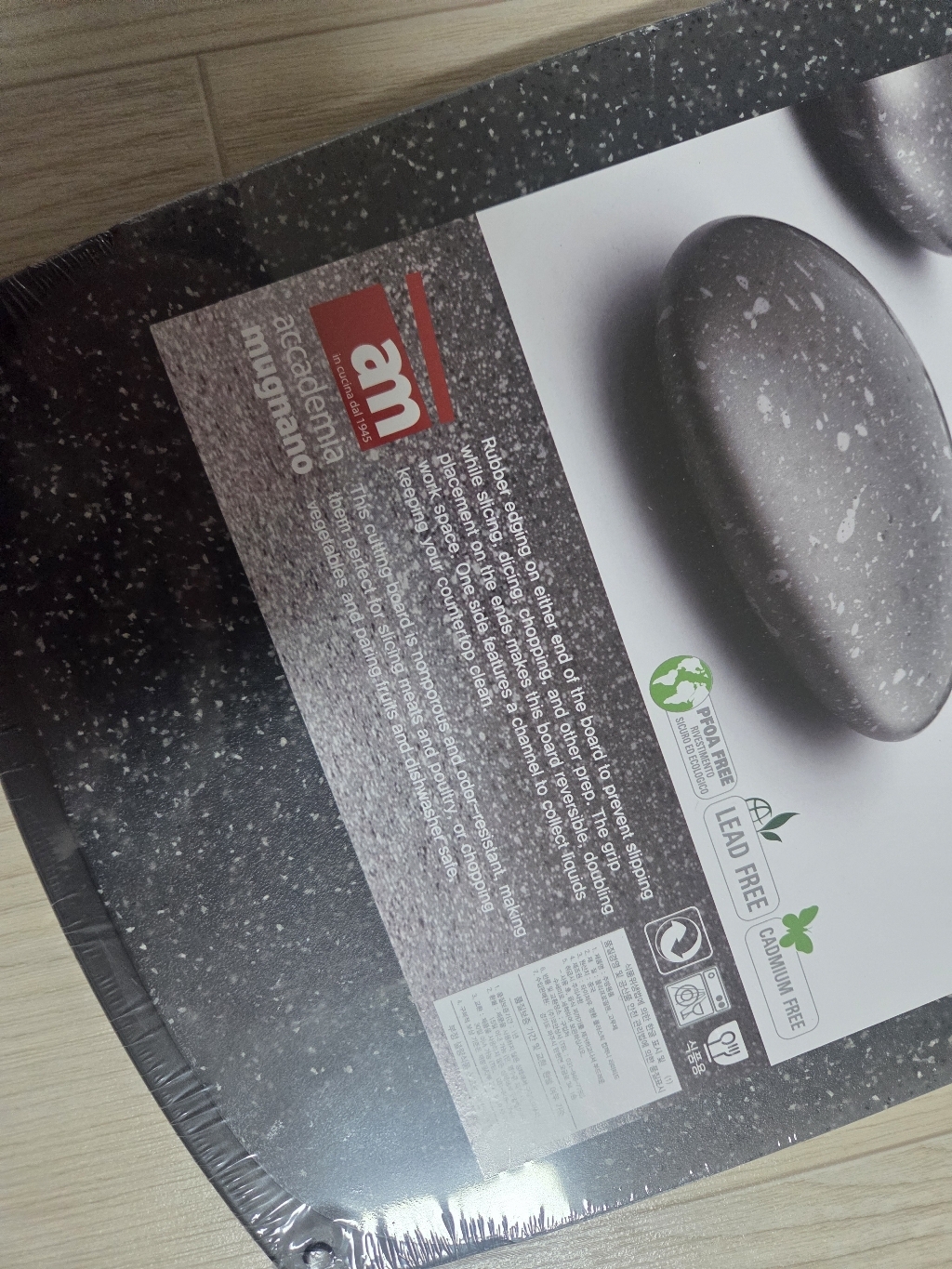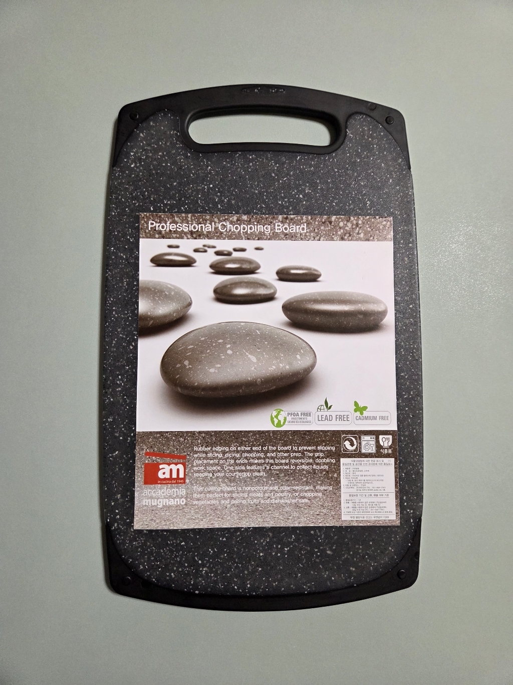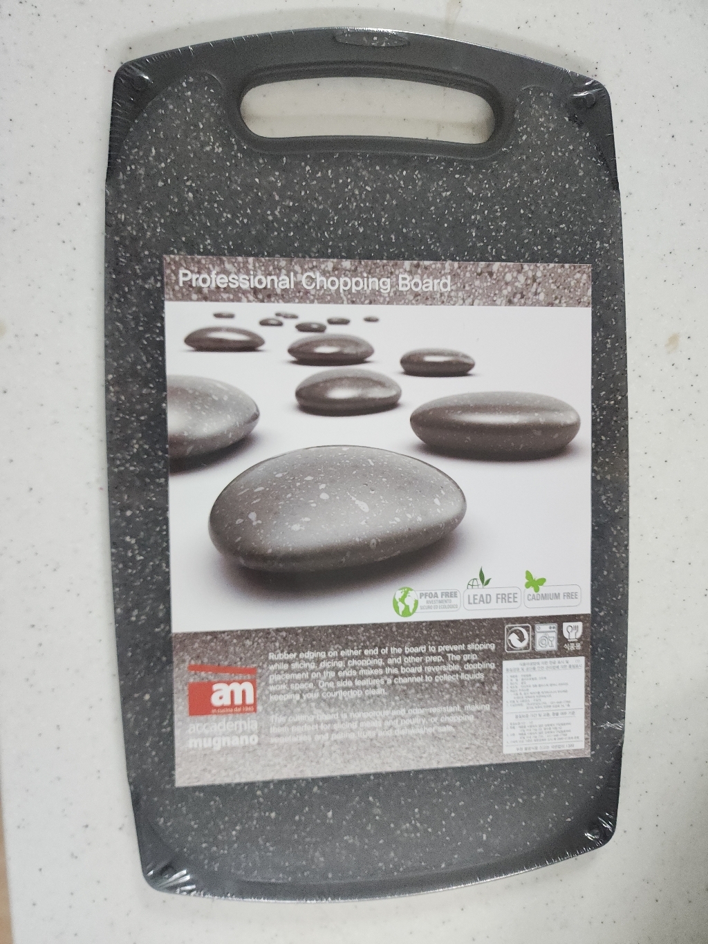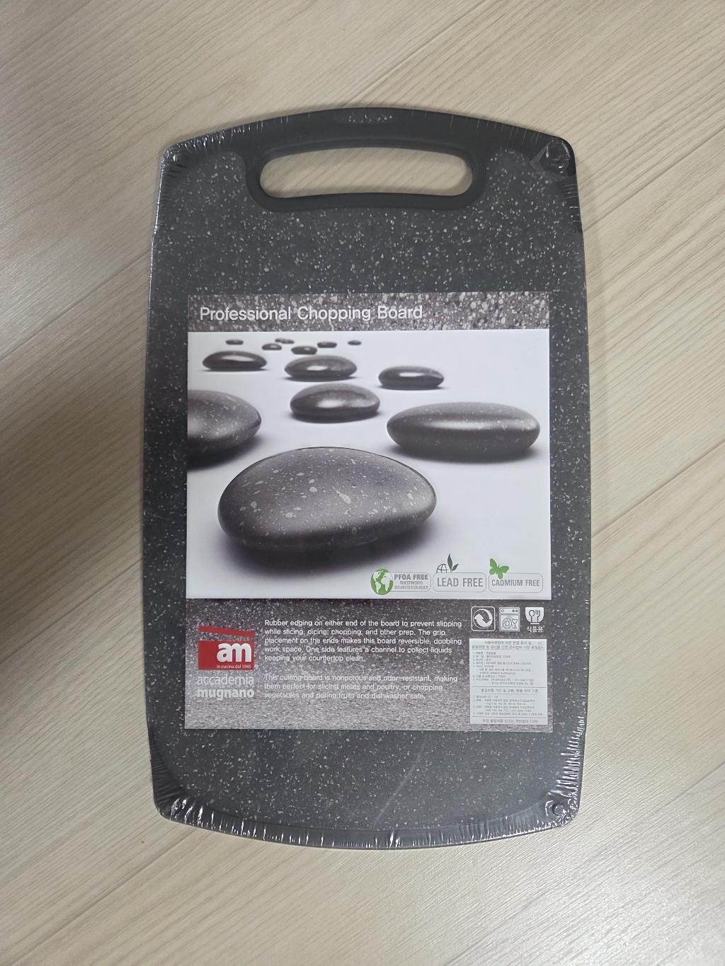 기존에 쓰던 도마가 칼집이 너무 많이 생겨서 위생적인 도마를 찾다가, 깔끔하고 환경 호르몬 걱정이 없는 AM 이탈리아 제품으로 선택했습니다. ‘스톤 양면 도마’라는 이름처럼 일반 플라스틱 도마와 달리 조약돌 같은 고급스러운 표면 질감이 주방 분위기를 확 살려줍니다. 혼합색상이라 색감이 은은하고 세련된 느낌이 마음에 들었습니다.