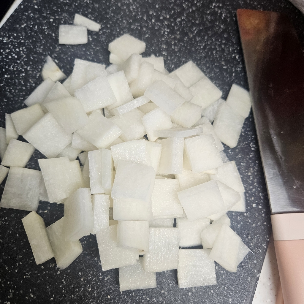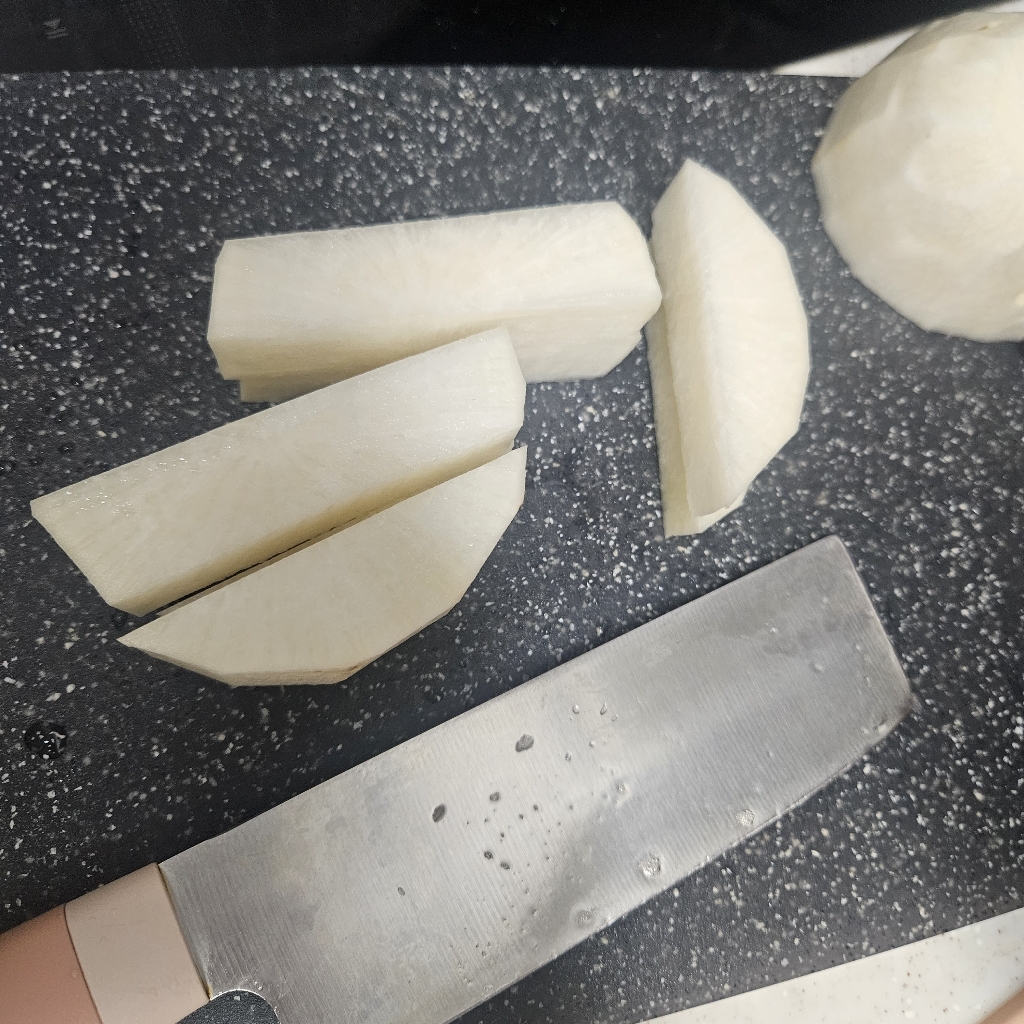 첫 사용기를 소고기뭇국을 끓이려고 무와 고기를 썰어봤는데 실리콘도마에서는 느끼지 못했던