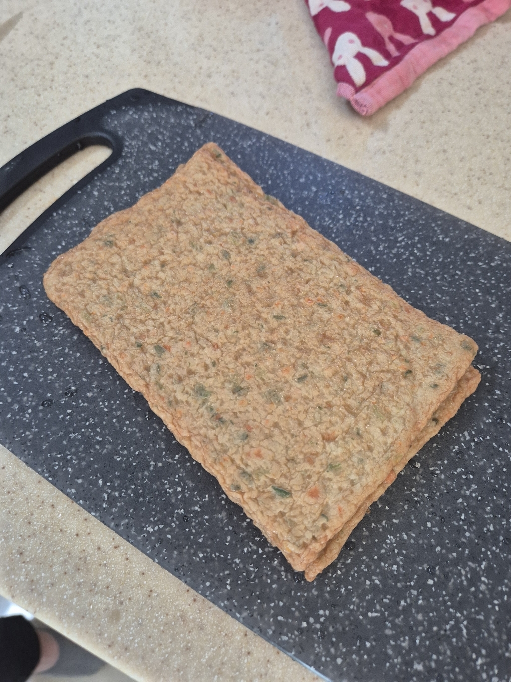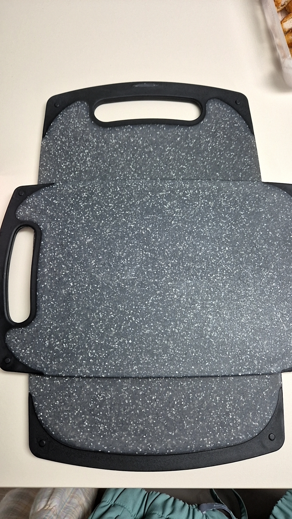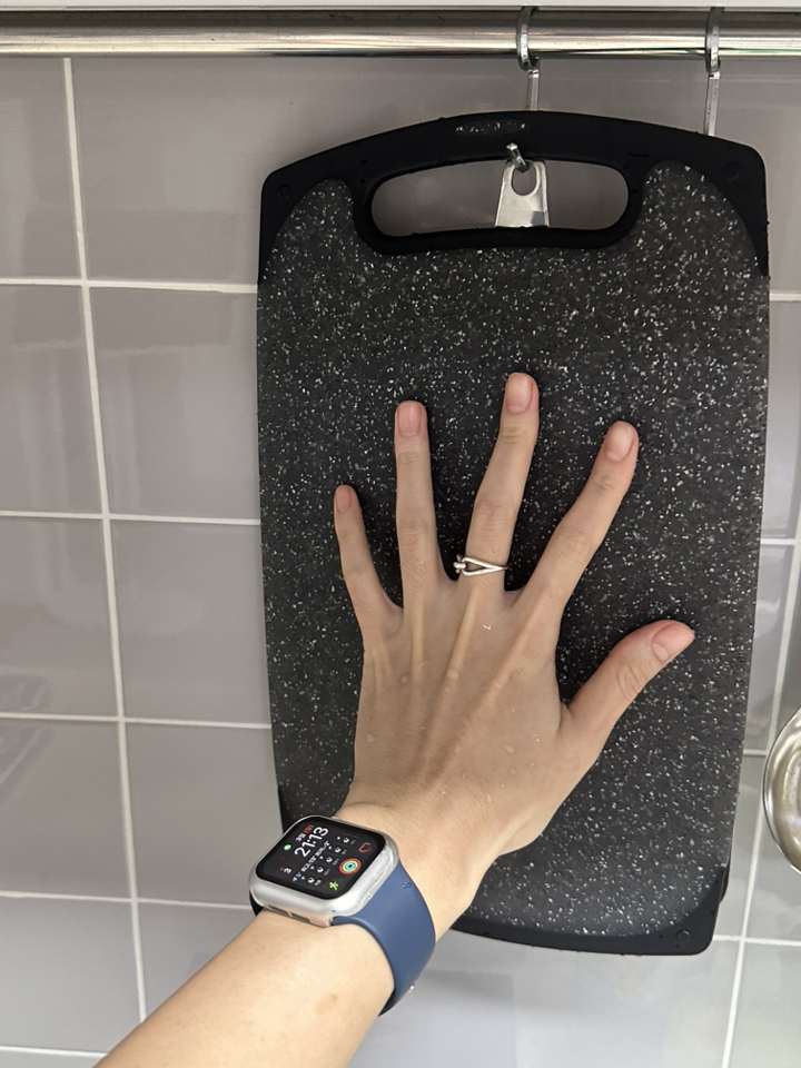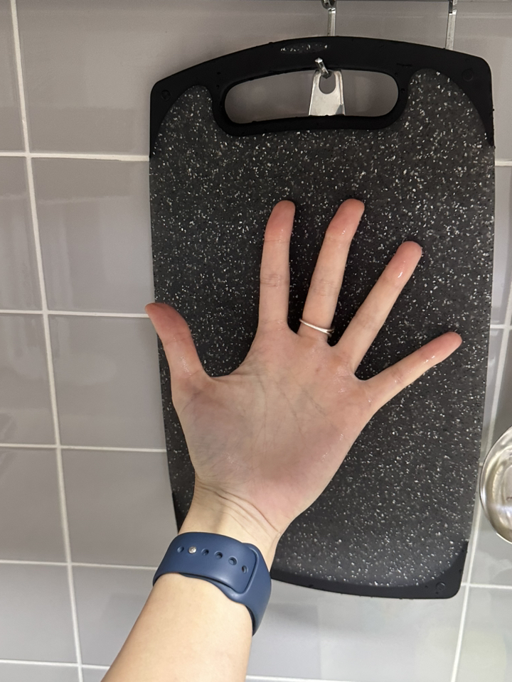 • 단단함과 두께: 후기에서 봤던 것처럼 두꺼운 나무 도마 같은 느낌보다는 얇고 단단한 소재입니다. 그래서 무게가 무겁지 않아 사용 후 싱크대에서 세척하고 말리기 편합니다. 다만, 단단해서 칼이 닿을 때 소리가 좀 크게 느껴질 수 있습니다.