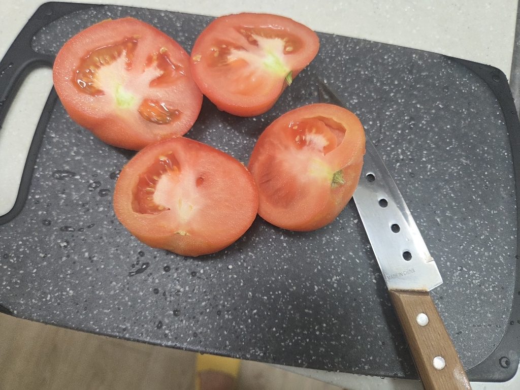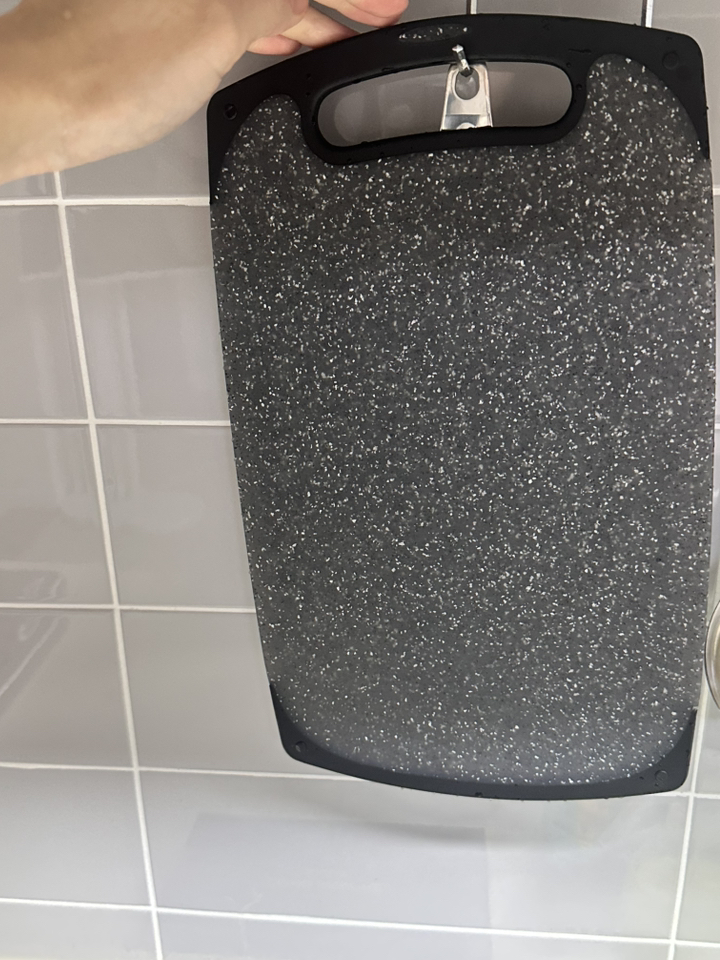 양면 사용이 가능한 도마라 식재료를 구분해 쓰기에도 편리합니다. 한 면은 육류나 생선 손질용으로, 다른 면은 채소나 과일용으로 나누어 사용하고 있어 여러개를 사지않아도 돼서 좋네요. 소재 특성 덕분에 핏물이나 수분이 쉽게 흡수되지 않아 세척도 편하게 할 수 있고요. 색깔이 어두워서 사용 흔적이나 생활 스크래치가 눈에 잘 띄지 않아 관리 스트레스가 적고 고리에 걸 수 있는 홀이 있어 걸어두고 사용해서 큰 공간 차지도 없습니다. 미끄러짐이 거의 없어 칼질은 편한데 물고임 홀은 없어요. 그래서 두부같은 재료를 자르면 물이 도마에 많이 고여요. 특대사이즈는 물고임 홀이 있더라구요. 이점이 불편하다면 특대를 구매하면 될 듯합니다.