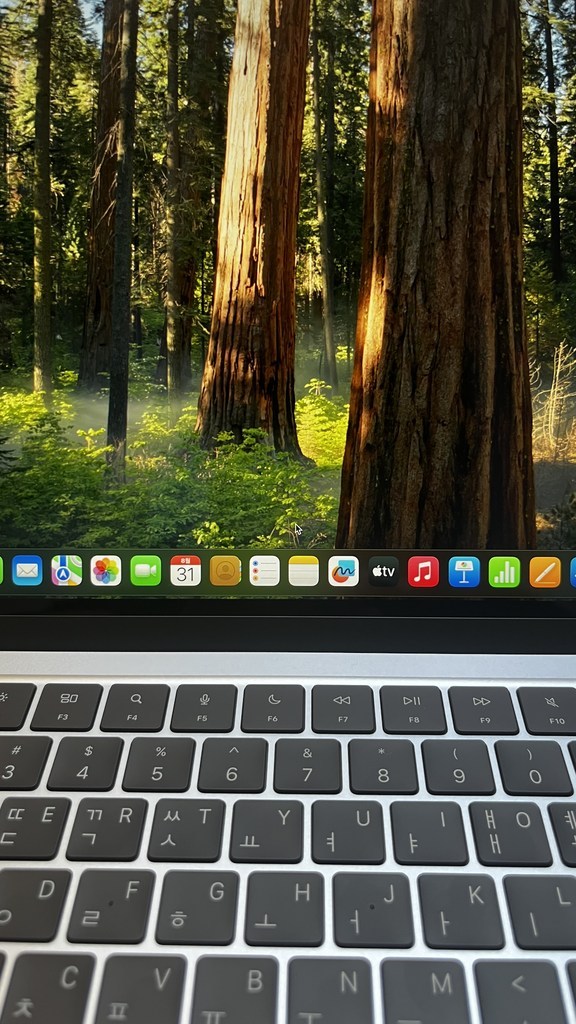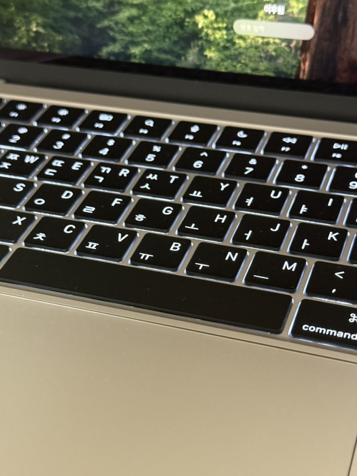 영문 키보드 처음 쓰는 분이라면 약간 어색할 수 있지만, 익숙해지면 깔끔한 배열에 만족하실 거예요. 디스플레이는 여전히 뛰어난 레티나 퀄리티! 트루톤 켜면 눈도 편안해요.