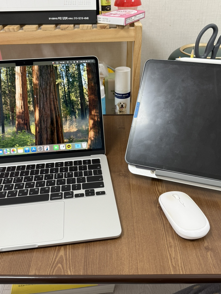 배터리도 맥북이 훨씬 오래가고, 따로 추가로 구입해야 할 부속품도 거의 없습니다. 외출 시 여러 가지를 챙겨야 하는 아이패드보다 오히려 맥북 하나만 들고 나가는 게 더 가볍고 편하게 느껴졌습니다. 실제로 아이패드를 사기 위해 애플 매장까지 갔다가 결국 쿠팡에서 맥북 에어 13을 구입하게 되었습니다.