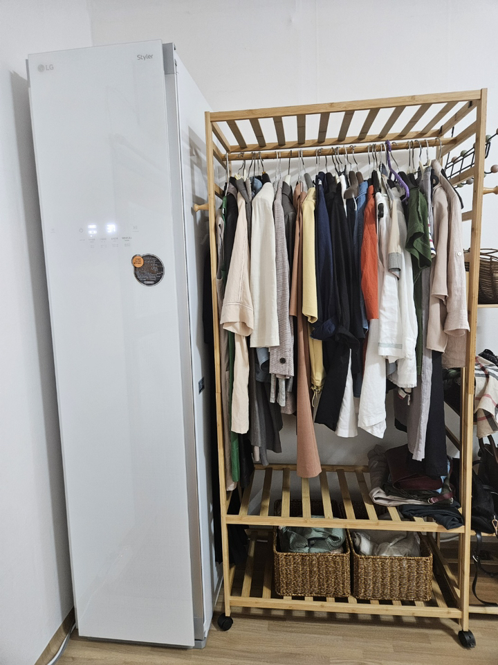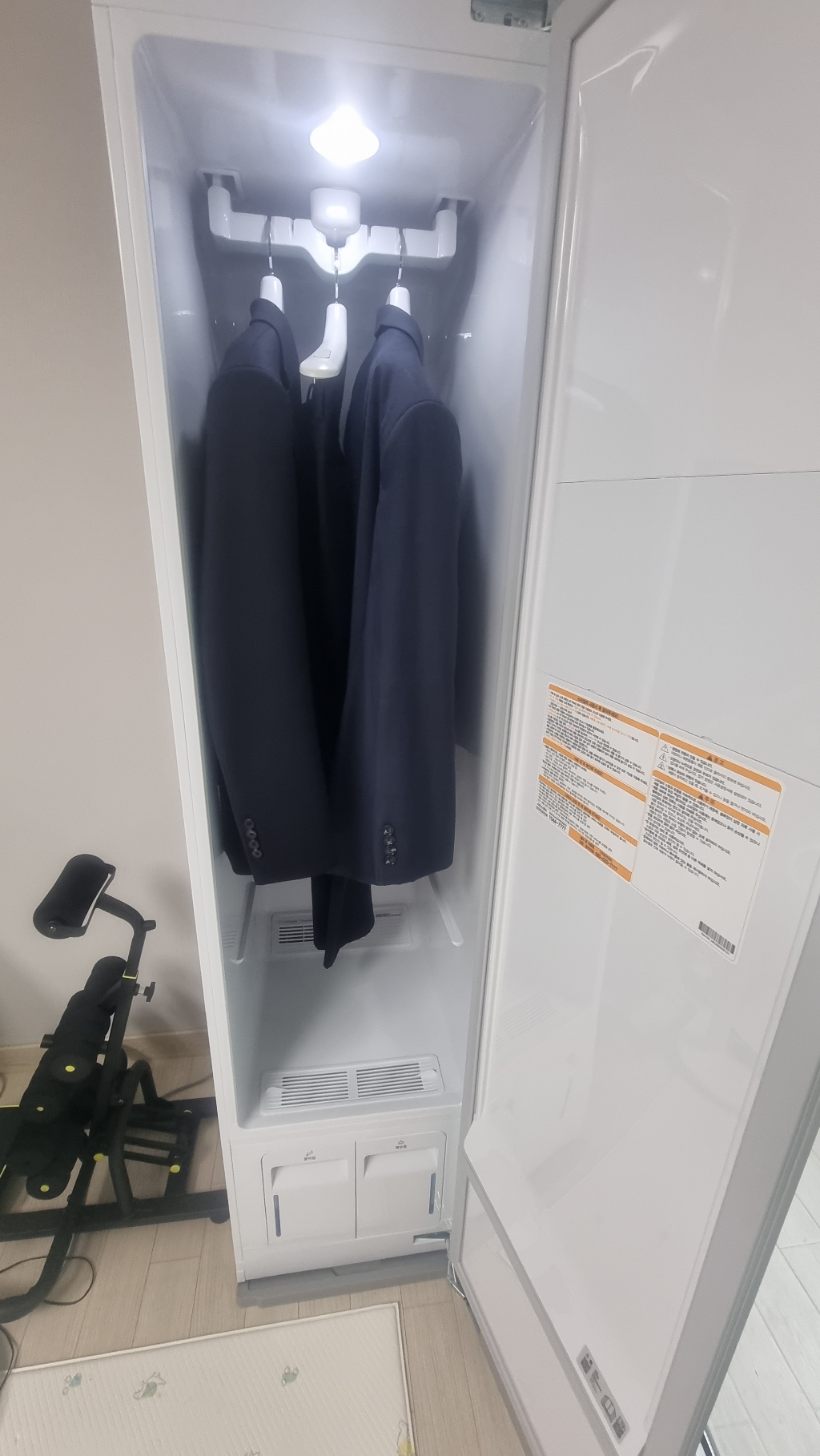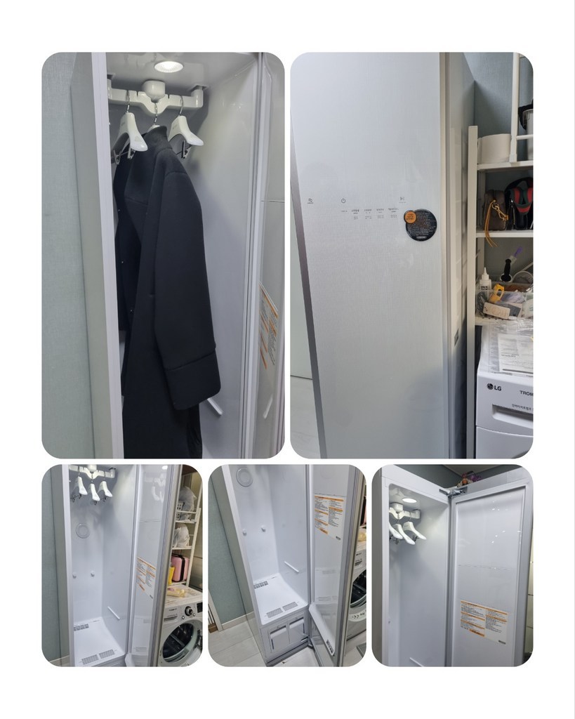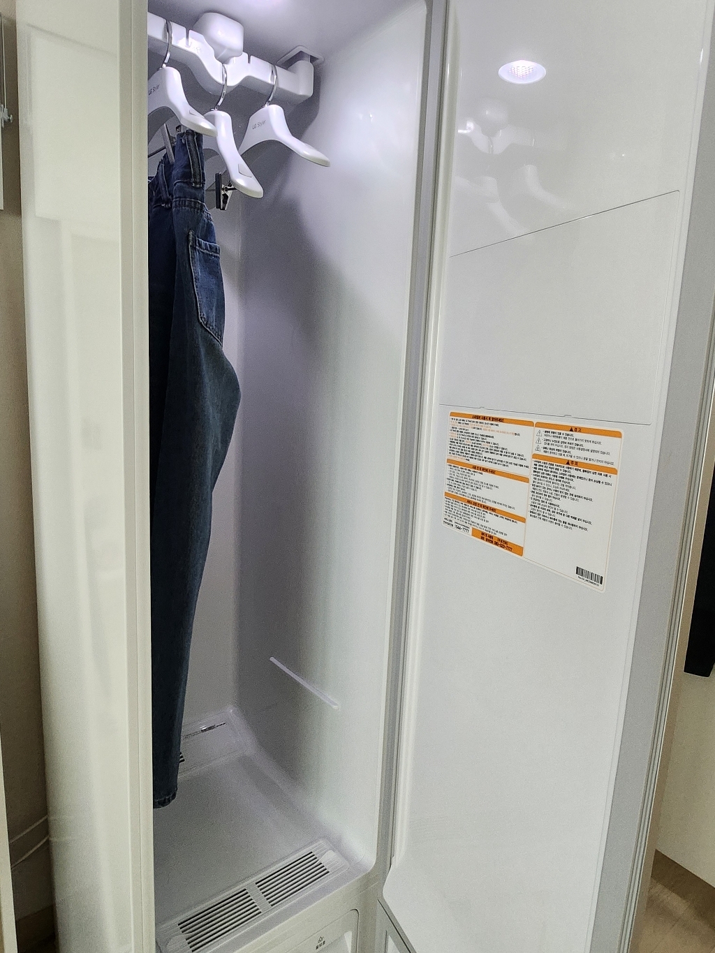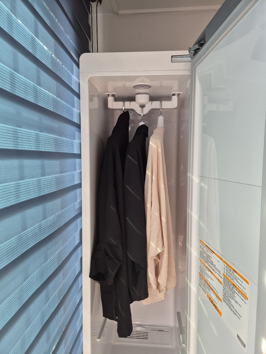 b.좁은 집에 행거까지 있으면 어수선해 보이는 게 싫어서 장롱 근처에 매일 입는 옷을 대충 걸어두곤 했는데 아예 스타일러에 넣어두어도 깔끔하고 괜찮더라고요