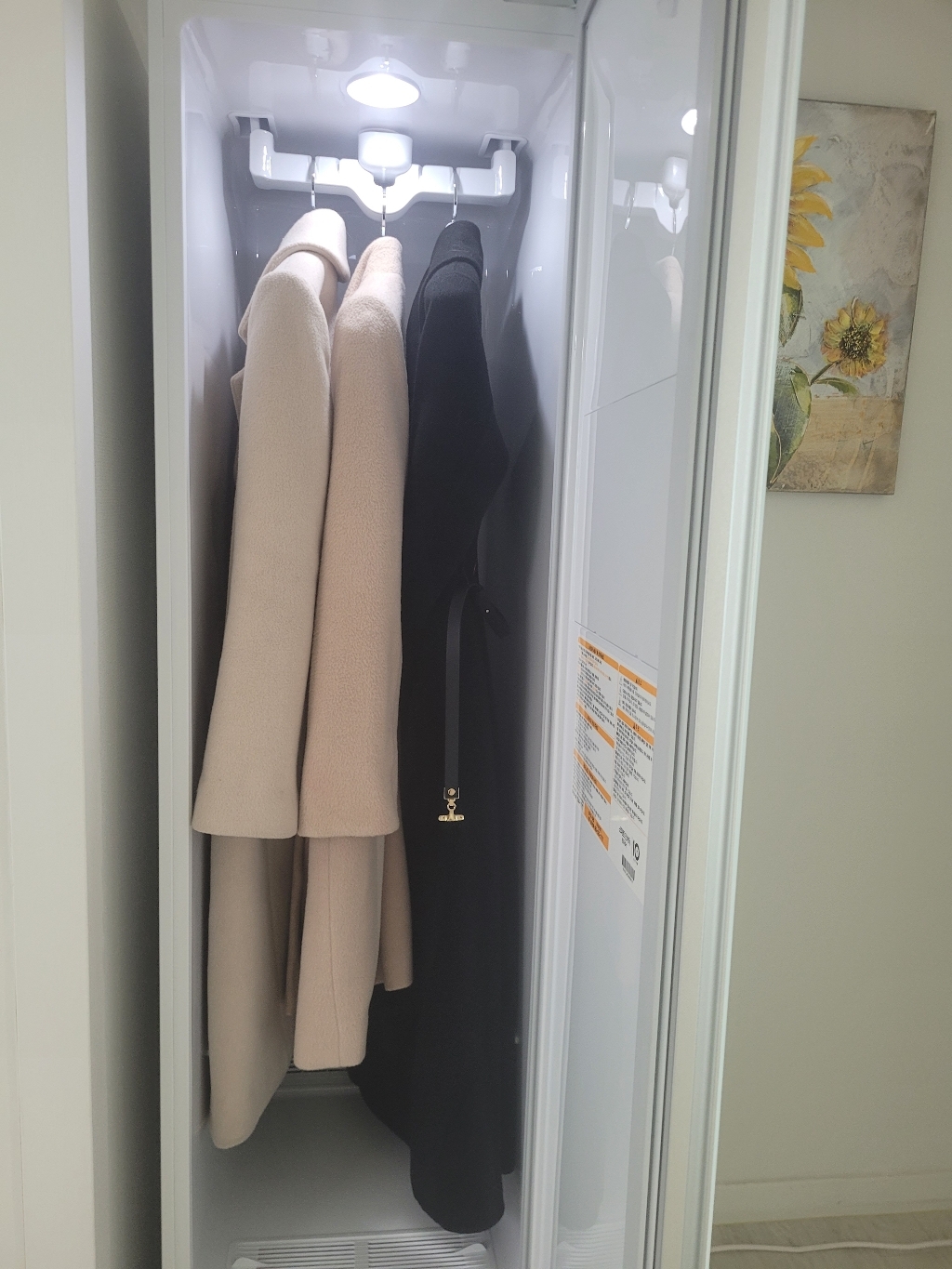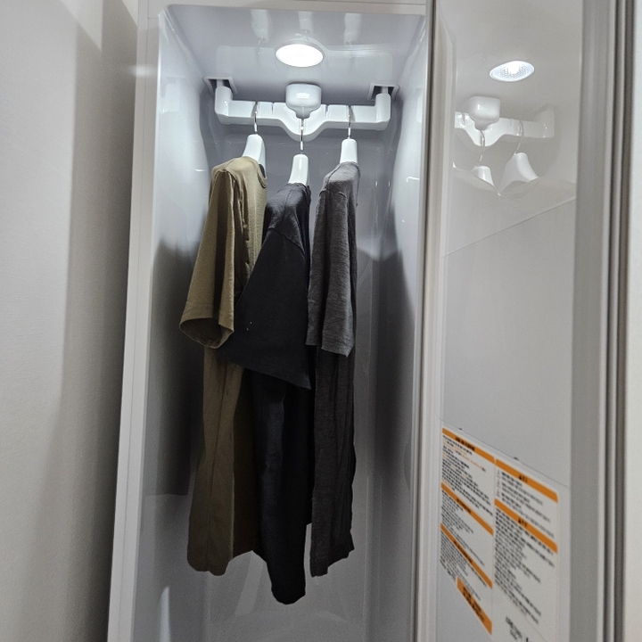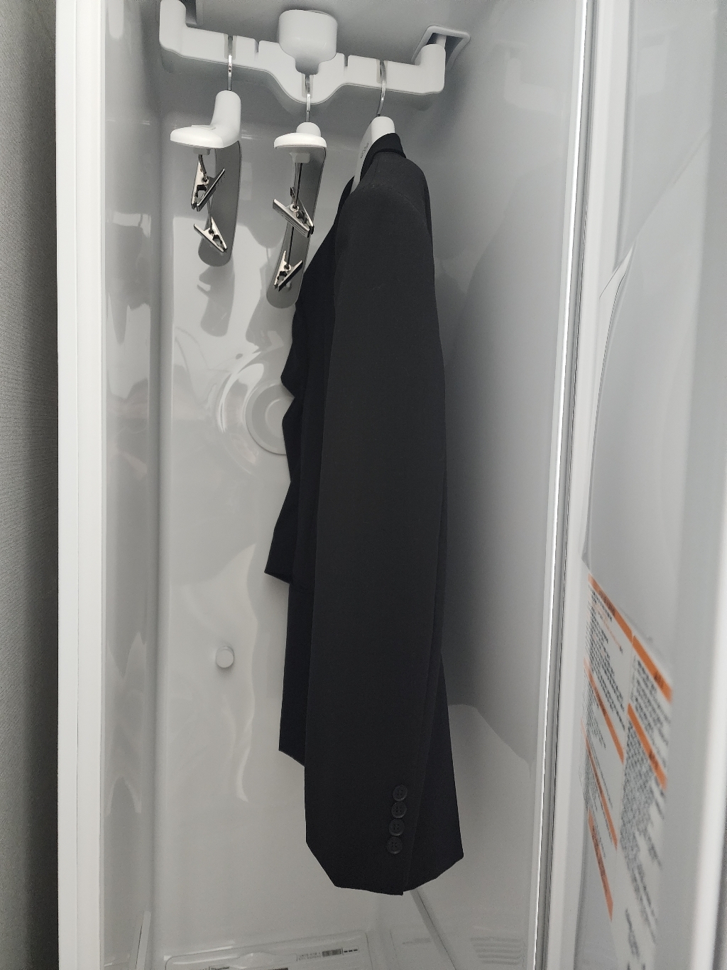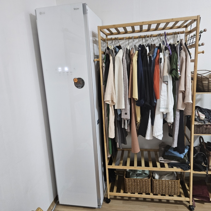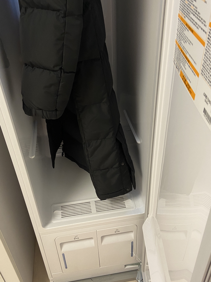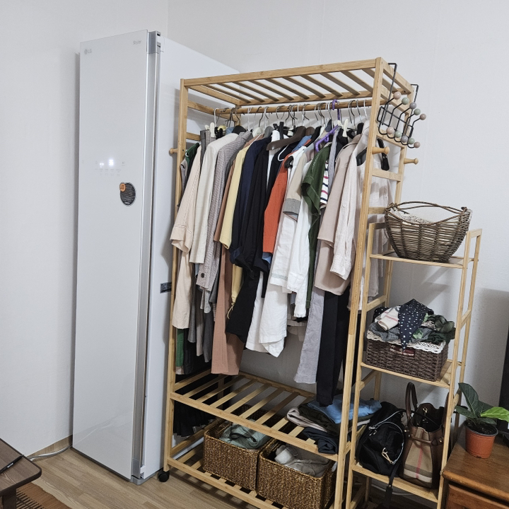b.좁은 집에 행거까지 있으면 어수선해 보이는 게 싫어서 장롱 근처에 매일 입는 옷을 대충 걸어두곤 했는데 아예 스타일러에 넣어두어도 깔끔하고 괜찮더라고요